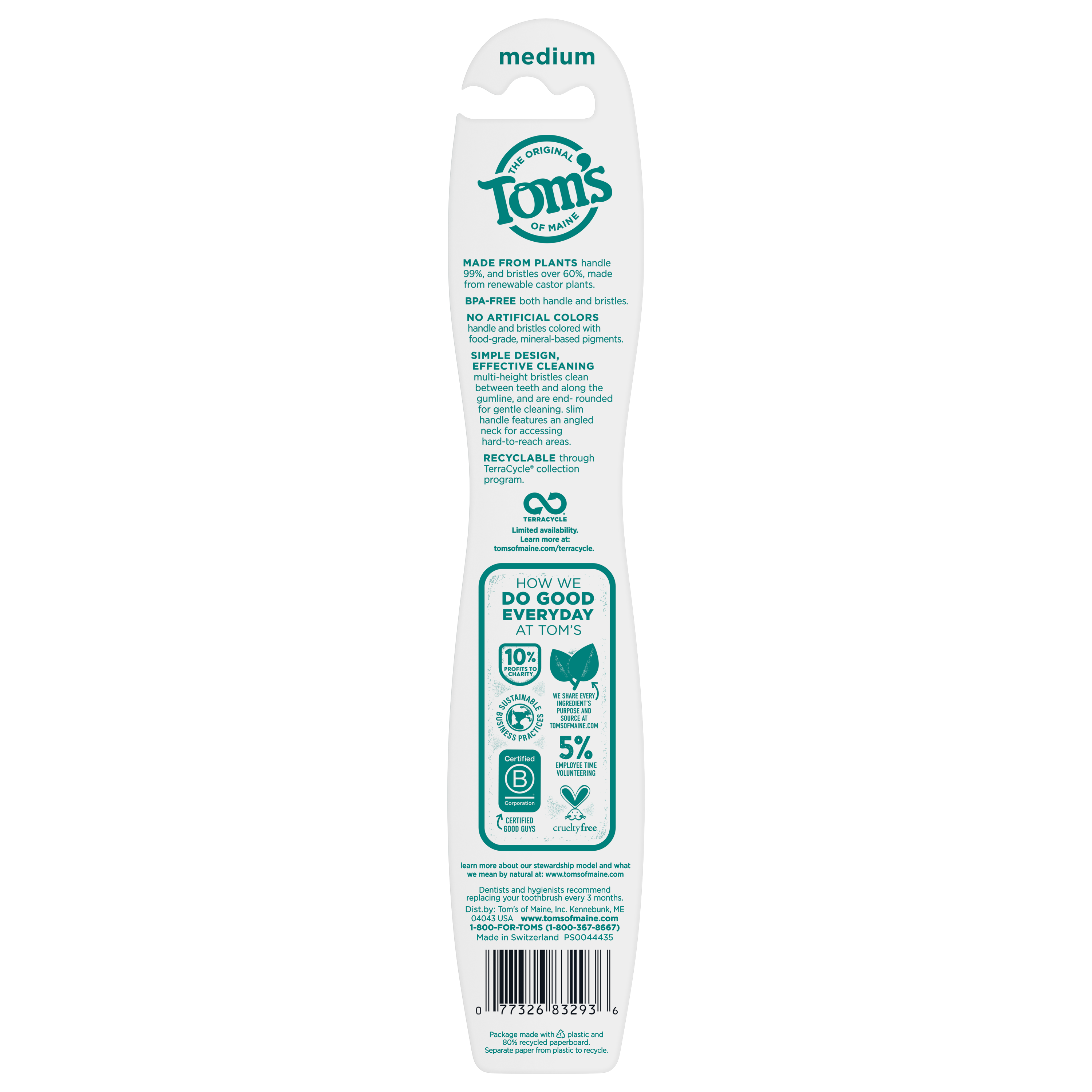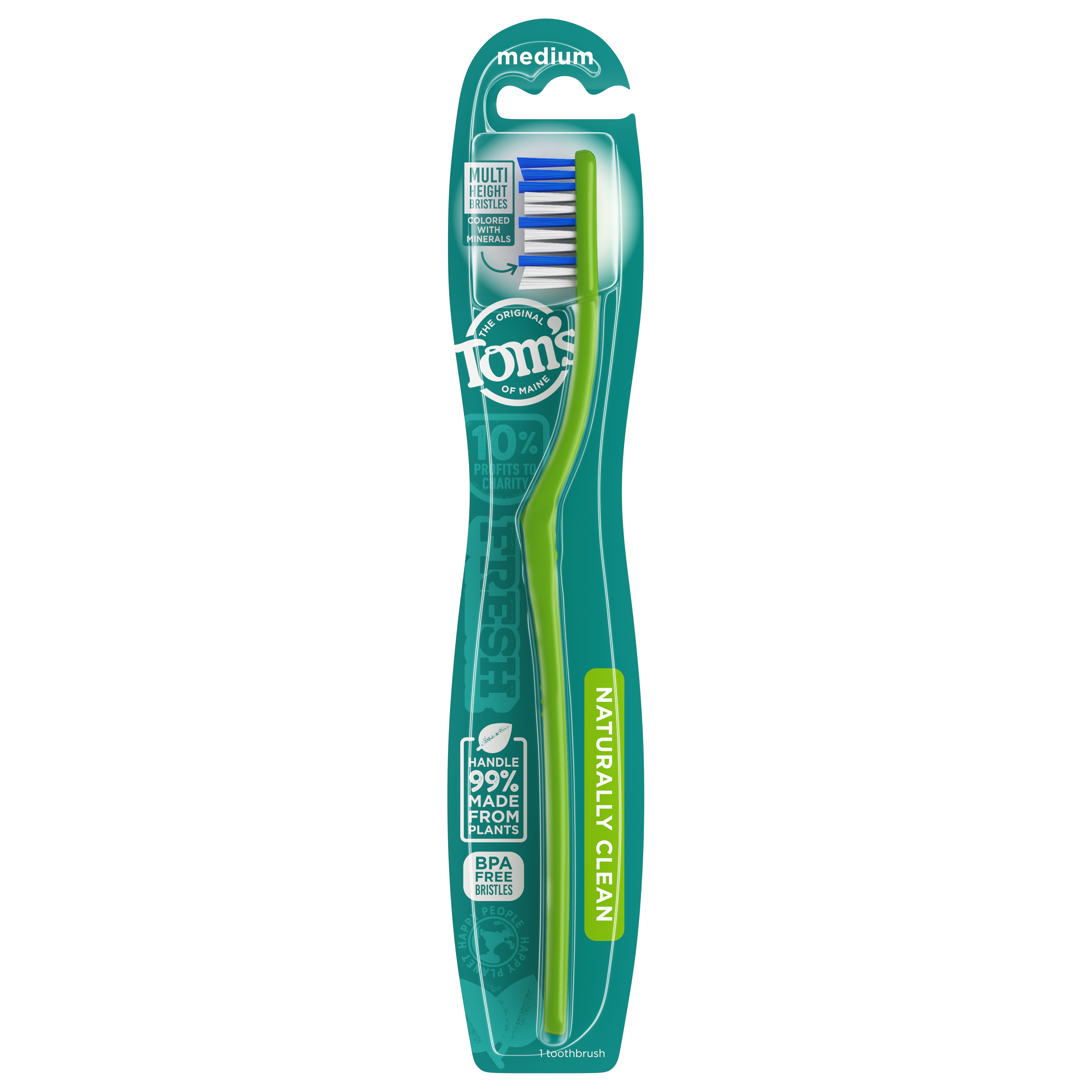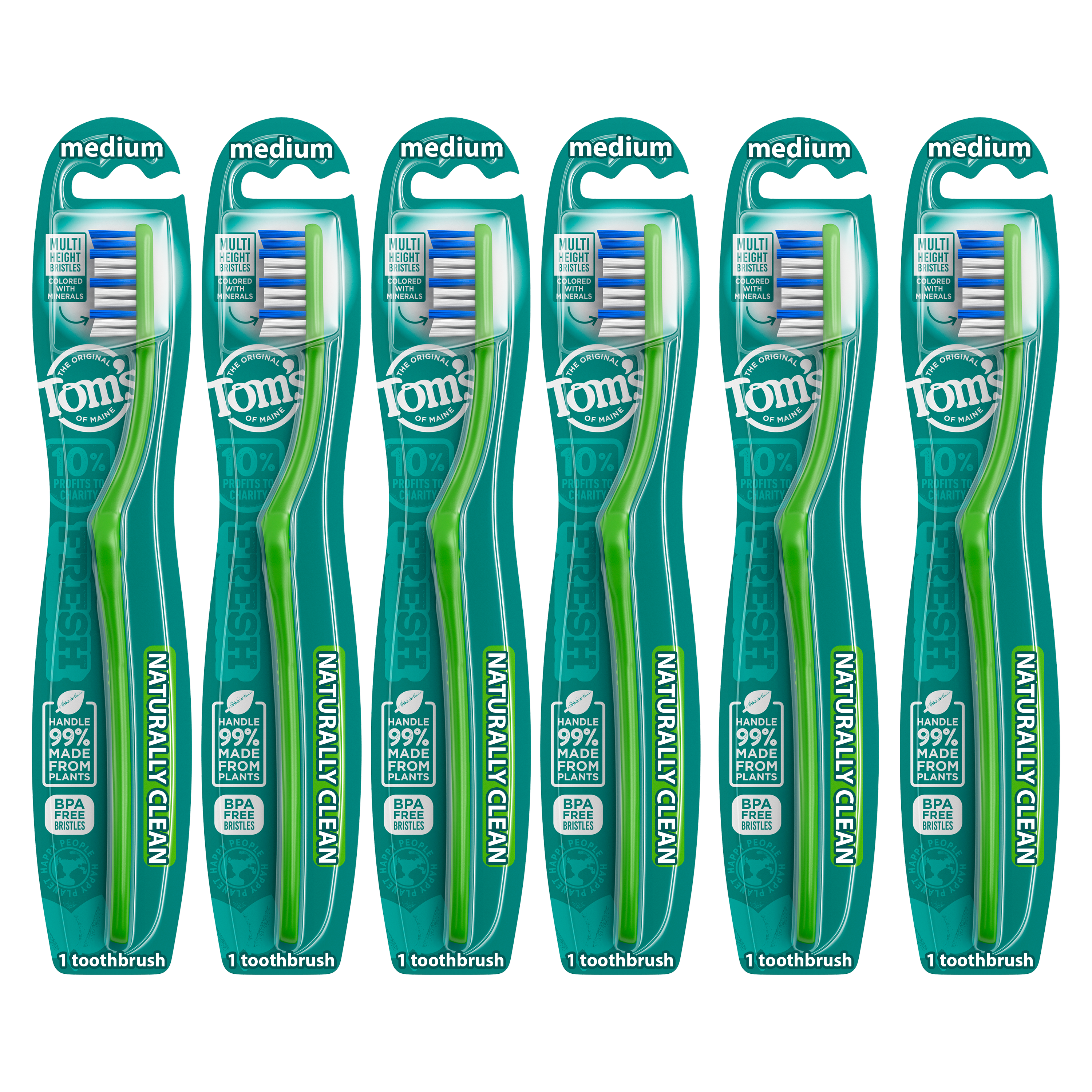 SKU 683293 Consumer Unit - GTIN 00077326832936 Case - GTIN 10077326832933 Product Category Oral Care Product Sub Category Manual TB Product Equity (Brand) Tom's of Maine Product Sub Brand Tom's Man TB Product Title Tom's of Maine Naturally Clean Toothbrush, Medium, 6-Pack eCommerce Copy- Long Description Tom's of Maine Naturally Clean Toothbrush gives you many reasons to smile. The angled neck and multi-height bristles effectively clean teeth and remove plaque. Each handle is made from renewable castor oil plants and the medium bristles are BPA-free. Plus, the toothbrush can be recycled through Tom's of Maine TerraCycle collection program. Order Tom's of Maine toothbrushes, and try their other natural dental care products. Tom's of Maine products use only ingredients that meet its stewardship standards for natural, sustainable and responsible, helping empower families to live more naturally. Tom's of Maine is a Certified B Corp and meets the highest standards of social and environmental performance, as well as public transparency. The company donates 10% of profits to charities committed to children's health, education and the environment. Thank you for supporting Tom's of Maine. Bullet 1 WHAT YOU'LL GET: Contains six Tom's of Maine Naturally Clean Toothbrushes with Medium Bristles Bullet 2 MADE FROM PLANTS: Natural toothbrush handle is 99% made from renewable castor oil plants Bullet 3 CLEANS TEETH & GUMS: Angled neck and multi-height bristles effectively clean between teeth and along gumline Bullet 4 RECYCLABLE TOOTHBRUSH: Can be recycled through the Tom's of Maine TerraCycle collection program Bullet 5 NATURAL & RESPONSIBLE: Each toothbrush is BPA-free and contains no artificial colors for dye-free bristles Bullet 8 RECYCLABLE THROUGH TERRACYCLE: This toothbrush is recyclable through our TerraCycle collection program. Bullet 9 CERTIFIED B CORP: Tom's of Maine meets the highest standards of verified social and environmental public transparency, performance, and legal accountability to balance purpose and profit. Amazon RPC B01F3FNRN8 AMZ URL https://www.amazon.com/dp/B01F3FNRN8