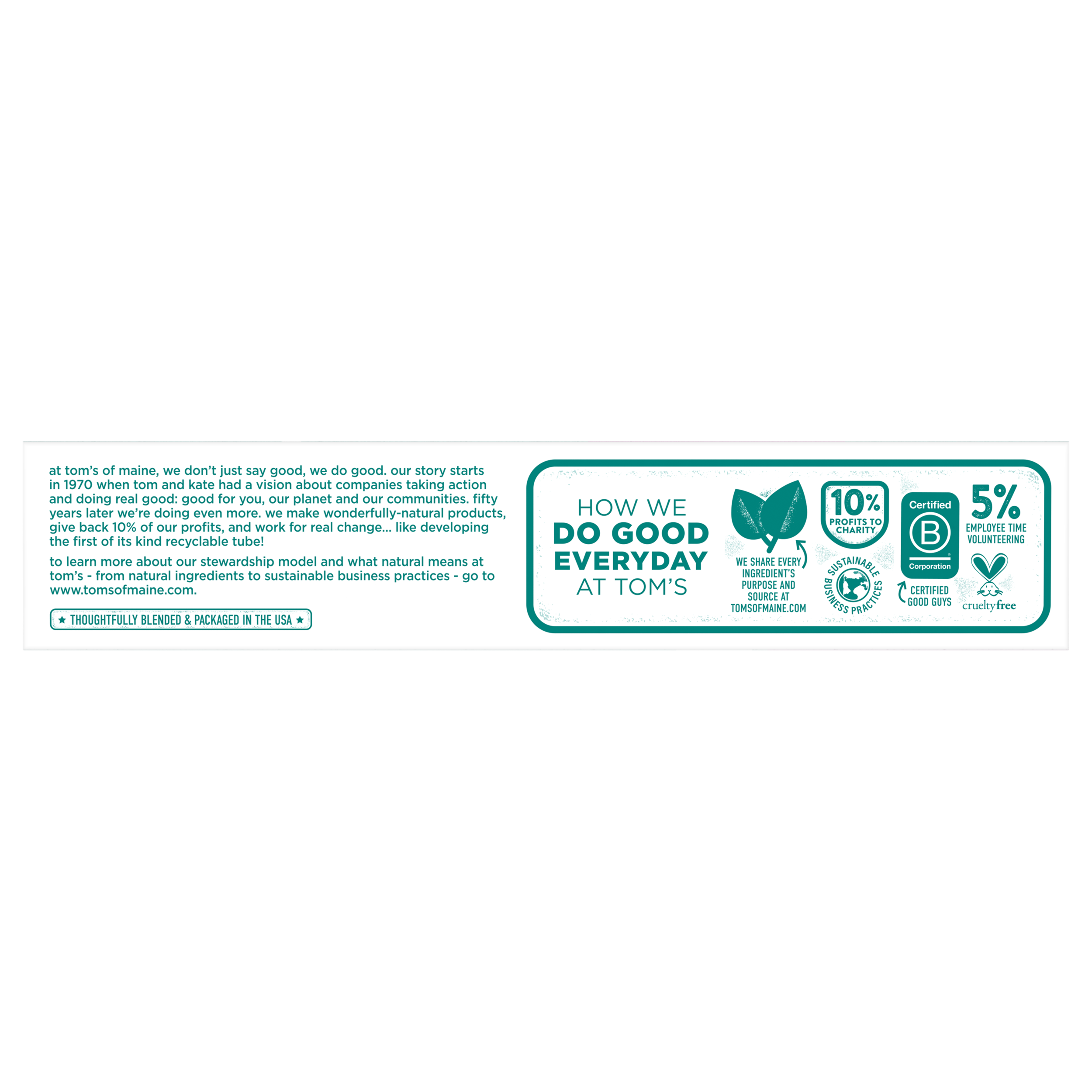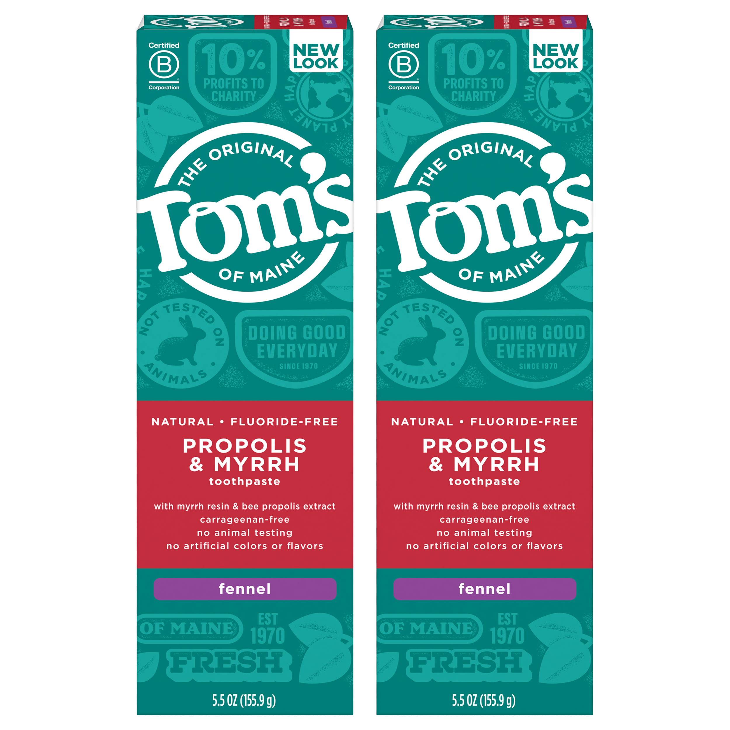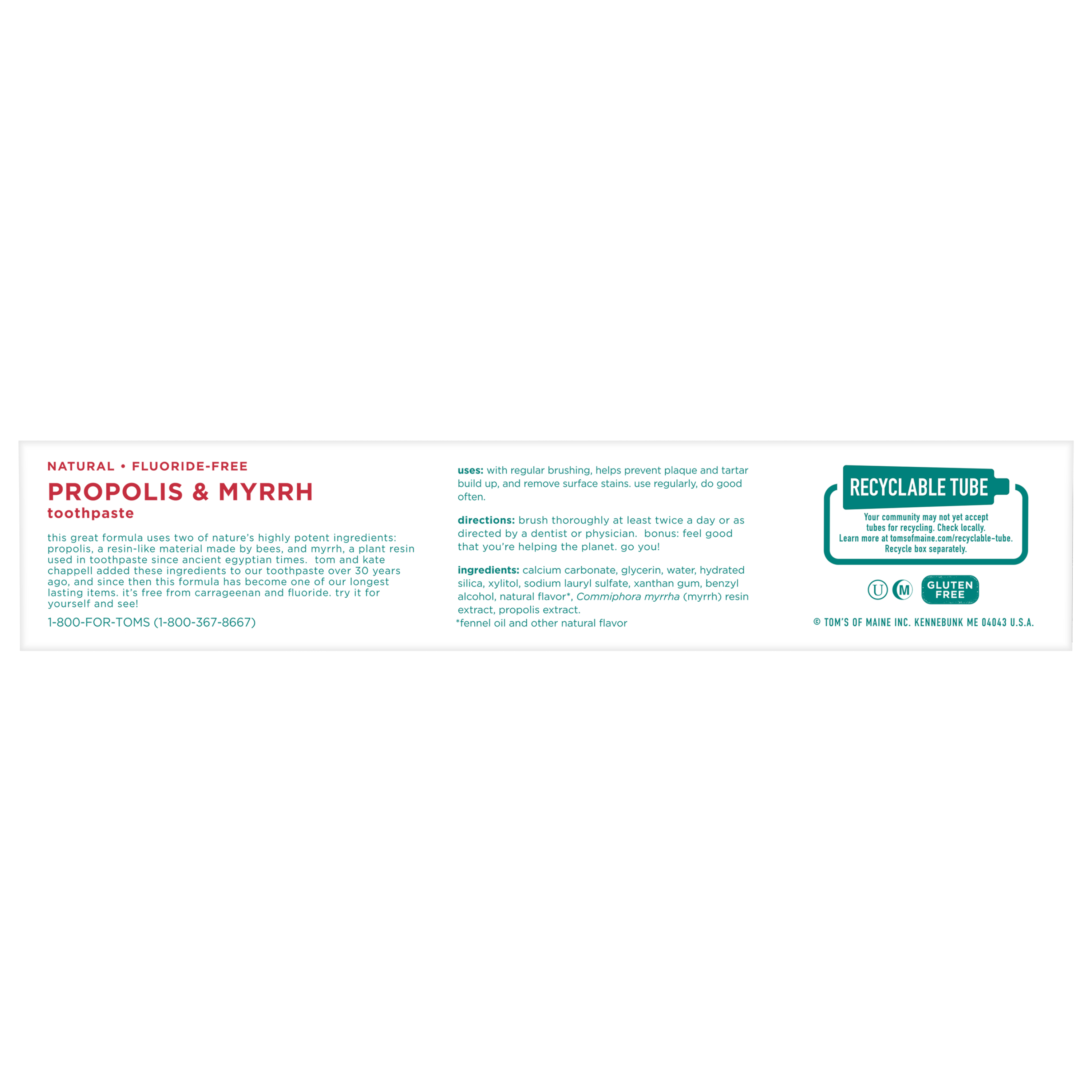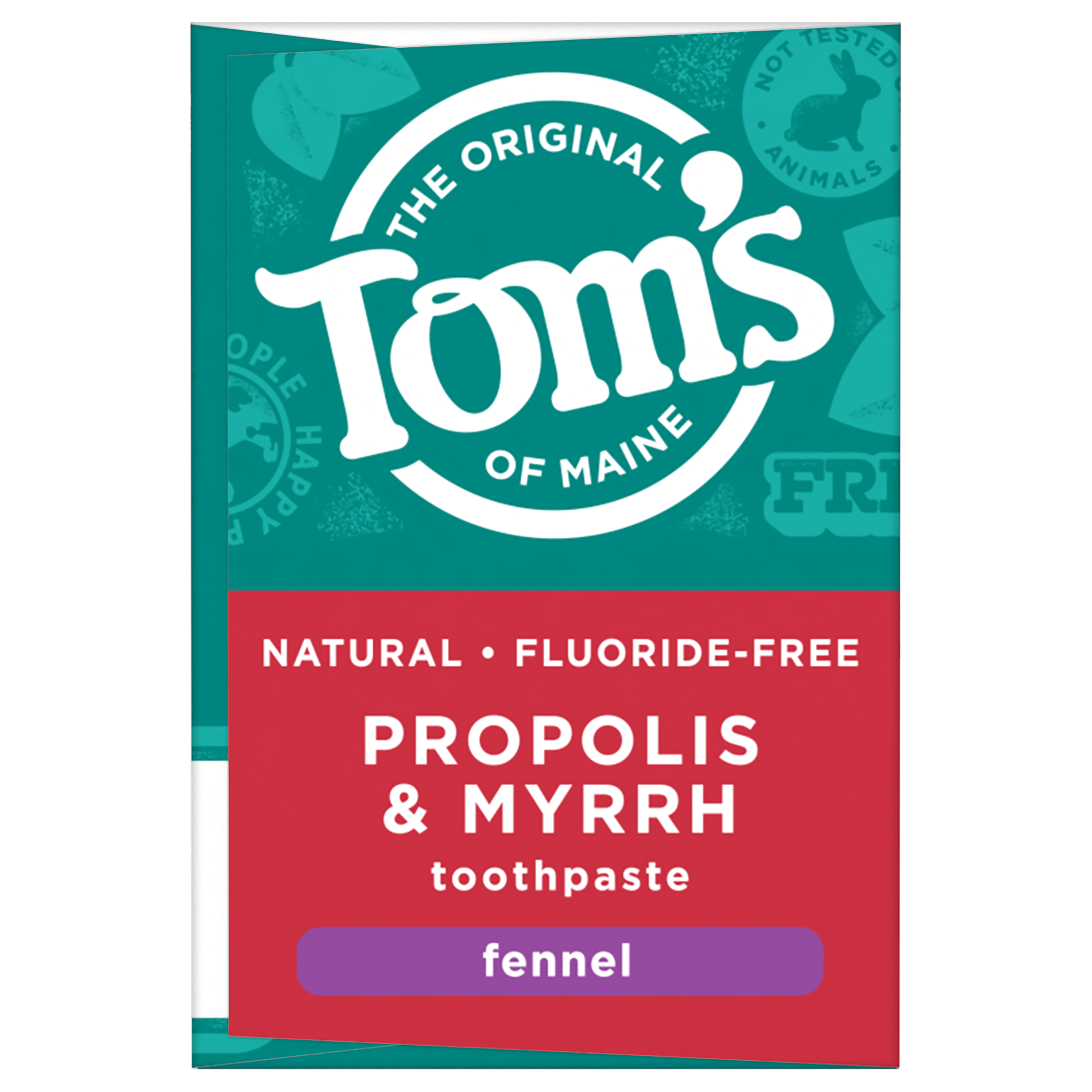 SKU 683395 Consumer Unit - GTIN 00077326833957 Case - GTIN 10077326833954 Product Category Oral Care Product Sub Category Toothpaste Product Equity (Brand) Tom's of Maine Product Sub Brand Tom's Propylis & Myrrh TP Product Title Tom's of Maine Fluoride-Free Propolis & Myrrh Natural Toothpaste, Fennel, 5.5 oz. 2-Pack Product Description Promote the feeling of a naturally clean and healthy mouth with Tom's of Maine Propolis & Myrrh Natural Toothpaste. Propolis is a mixture of tree resins and bee pollen, and myrrh is a plant resin that's been used in toothpastes since the time of the ancient Egyptians. This fluoride-free toothpaste helps fight plaque, whiten teeth and freshen breath. Plus, it contains the naturally great taste of fennel. Order Tom's of Maine Toothpaste, and try their other natural dental care products. Tom's of Maine products use only ingredients that meet its stewardship standards for natural, sustainable and responsible, helping empower families to live more naturally. Tom's of Maine is a Certified B Corp and meets the highest standards of social and environmental performance, as well as public transparency. The company donates 1% of profits to charities committed to children's health, education and the environment. Thank you for supporting Tom's of Maine. eCommerce Copy- Long Description Promote the feeling of a naturally clean and healthy mouth with Tom's of Maine Propolis & Myrrh Natural Toothpaste. Propolis is a mixture of tree resins and bee pollen, and myrrh is a plant resin that's been used in toothpastes since the time of the ancient Egyptians. This fluoride-free toothpaste helps fight plaque, whiten teeth and freshen breath. Plus, it contains the naturally great taste of fennel. Order Tom's of Maine Toothpaste, and try their other natural dental care products. Tom's of Maine products use only ingredients that meet its stewardship standards for natural, sustainable and responsible, helping empower families to live more naturally. Tom's of Maine is a Certified B Corp and meets the highest standards of social and environmental performance, as well as public transparency. The company donates 10% of profits to charities committed to children's health, education and the environment. Thank you for supporting Tom's of Maine. Bullet 1 WHAT YOU'LL GET: Two 5.5-ounce tubes of Tom's of Maine Propolis & Myrrh Natural Toothpaste in Fennel Flavor Bullet 2 FLUORIDE-FREE TOOTHPASTE: Herbal resins propolis and myrrh promote a naturally clean and healthy mouth Bullet 3 FIGHT PLAQUE: Helps fight tartar buildup and whiten teeth with regular brushing Bullet 4 FRESHEN BREATH: Enjoy fresh breath with the natural flavor of fennel and great taste of xylitol Bullet 5 NATURAL & RESPONSIBLE: Contains no artificial preservatives, colors or flavors and is not tested on animals Amazon RPC B00JUJ1ECU AMZ URL https://www.amazon.com/dp/B00JUJ1ECU