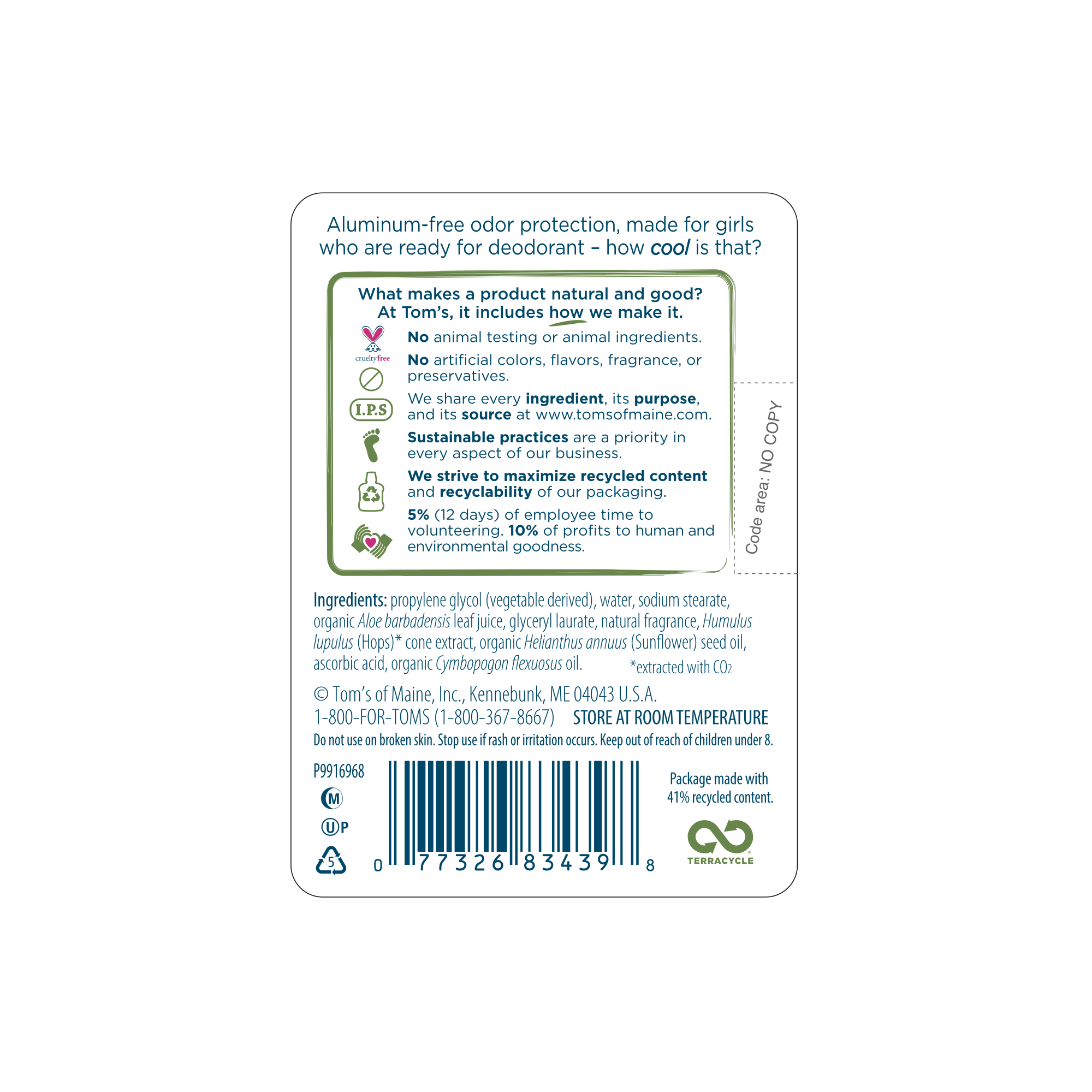 SKU 683439 Consumer Unit - GTIN 00077326834398 Product Category Personal Care Product Sub Category AP > Deo Product Equity (Brand) Tom's of Maine Product Sub Brand Tom's Long Lasting Kids AP/Deo Product Title Tom's of Maine Wicked Cool Deodorant, Natural Deodorant, Toms Deodorant, Girls Summer Fun, 2.25 Ounce, 6-Pack