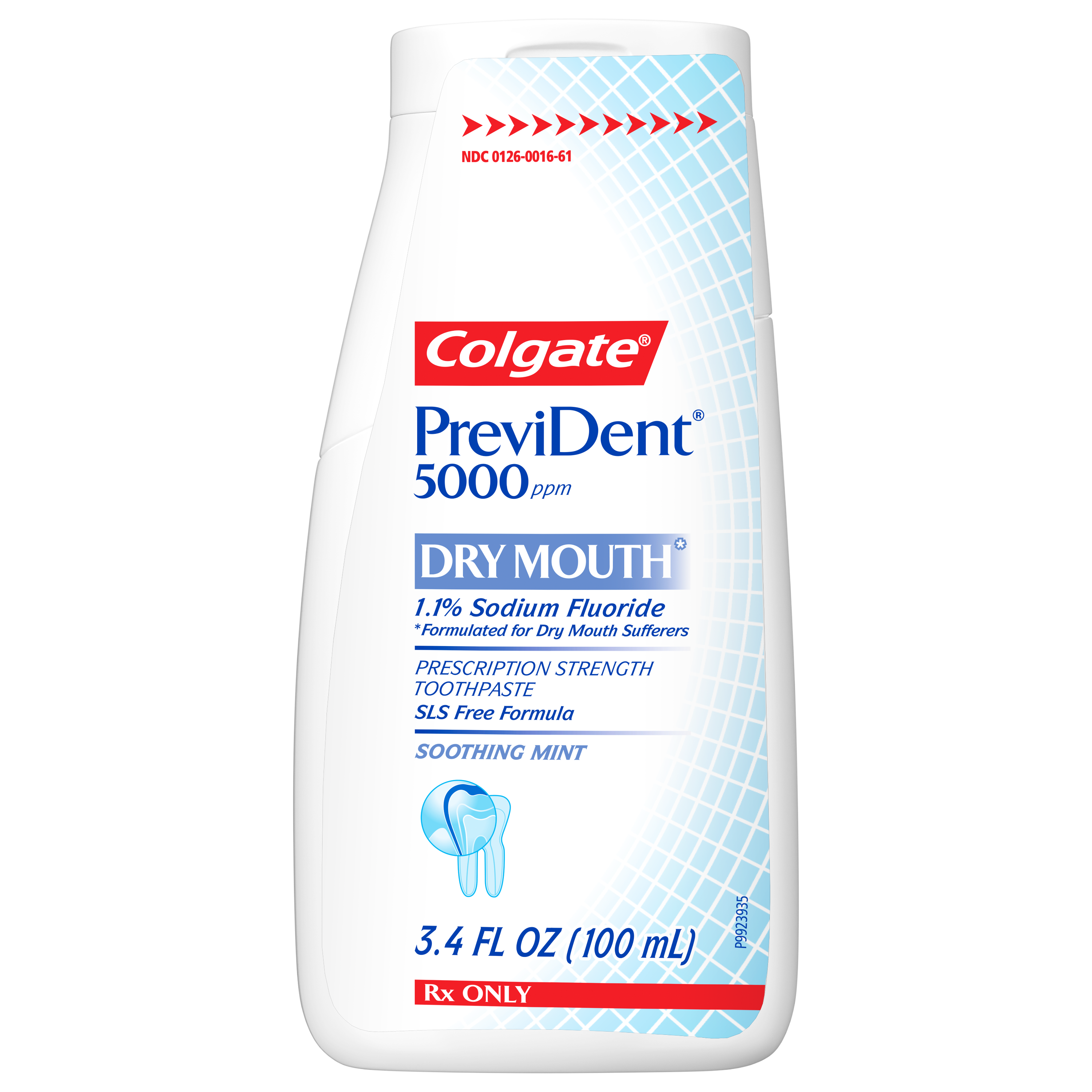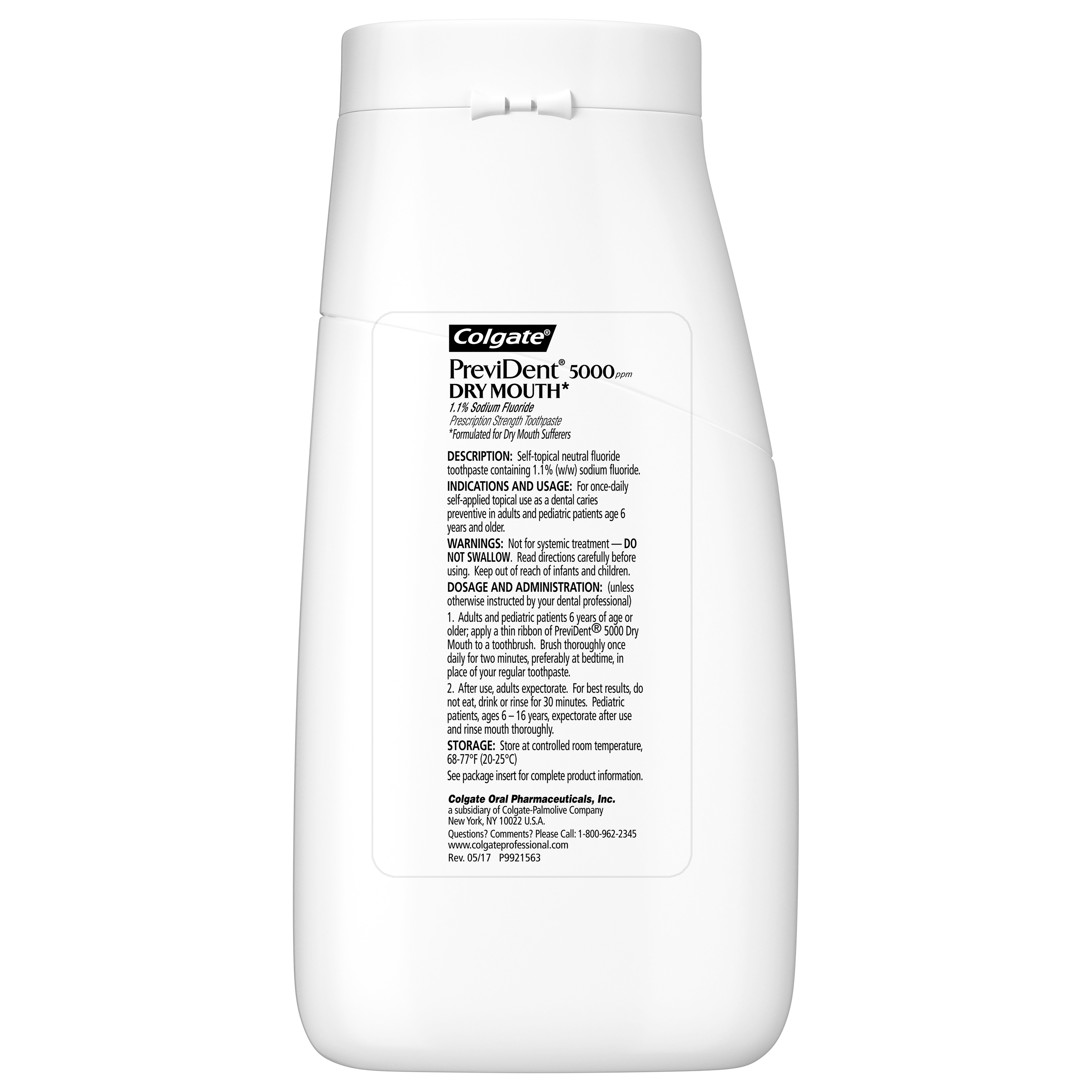 SKU 733007 Consumer Unit - GTIN 00038341106228 Case - GTIN 10038341106225 Product Category Oral Care Product Sub Category PP High Fluoride Product Equity (Brand) Colgate Product Sub Brand Colgate PreviDent Toothpaste HF PP Product Title Colgate® PreviDent® 5ppm Dry Mouth Prescription Strength Toothpaste, 3.4 fl oz Bullet 1 Enables faster fluoride dispersion than paste-form Rx fluoride Bullet 2 Therapeutic decay prevention that is safe for exposed root surfaces Bullet 3 Known to be less irritating and less likely to cause dryness Bullet 4 Formulated to appeal to dry-mouth sufferers. Active Ingredients 1.1% Sodium Fluoride