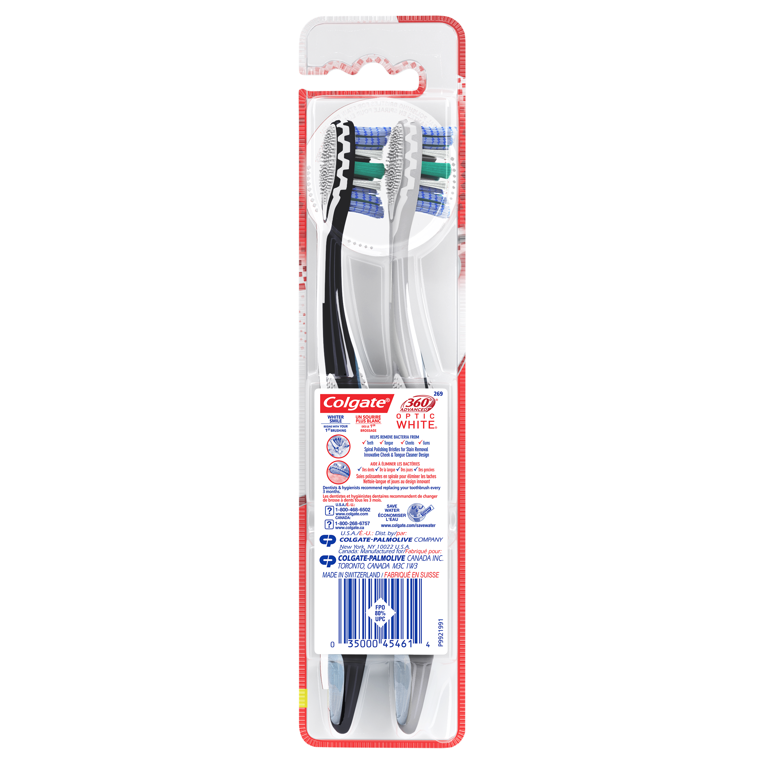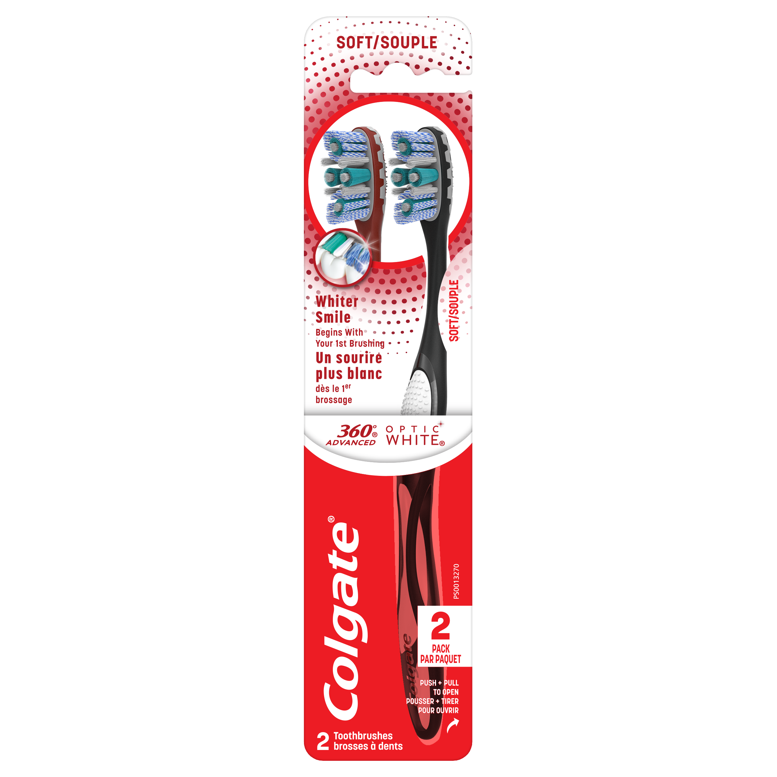 SKU CH01923A Consumer Unit - GTIN 00035000454614 Case - GTIN 10035000454611 Product Category Oral Care Product Sub Category Manual TB Product Equity (Brand) Colgate Product Sub Brand Colgate 360 Adv Optic Man TB Product Title Colgate 360 Optic White Advanced soft adult manual toothbrush, 2pk Product Description The Colgate 360 Optic White Advanced Soft Adult Manual Toothbrush, 2 pk is an adult manual toothbrush made for easy brushing. This soft toothbrush for adults is designed with whitening cups to remove teeth stains and special polishing soft bristles to whiten teeth. Plus, a unique tongue and cheek cleaner removes odor causing bacteria for a 360 toothbrushing experience! The Colgate 360 Optic White Advanced Soft Adult Manual Toothbrush features multi-action, tooth-fitting polishing cups to remove surface stains. An ergonomic handle design fits comfortably in your hand while flexible finger grips help the adult manual toothbrush to stay in place; reducing slippage and allowing for more precise maneuvering as you brush your teeth. At Colgate, we make products that promote healthy smiles. Not only because having a healthy smile is important to your overall health, but because when you have a healthy smile, you actually smile more – and that’s a powerful thing. Smiles are the simplest form of optimism, something we need now more than ever. That’s why we’re championing optimism – we are committed to creating a healthier planet and working every day to create healthy smiles for all. Everyone has the right to a bright smile. That’s why we’re committed to raising oral healthcare standards everywhere. Whether it’s building healthy new habits as kids or learning something new from the experts, we’re here for you. eCommerce Copy- Long Description The Colgate 360 Optic White Advanced Soft Adult Manual Toothbrush, 2 pk is an adult manual toothbrush made for easy brushing. This soft toothbrush for adults is designed with whitening cups to remove teeth stains and special polishing soft bristles to whiten teeth. Plus, a unique tongue and cheek cleaner removes odor causing bacteria for a 360 toothbrushing experience! The Colgate 360 Optic White Advanced Soft Adult Manual Toothbrush features multi-action, tooth-fitting polishing cups to remove surface stains. An ergonomic handle design fits comfortably in your hand while flexible finger grips help the adult manual toothbrush to stay in place; reducing slippage and allowing for more precise maneuvering as you brush your teeth. At Colgate, we make products that promote healthy smiles. Not only because having a healthy smile is important to your overall health, but because when you have a healthy smile, you actually smile more – and that’s a powerful thing. Smiles are the simplest form of optimism, something we need now more than ever. That’s why we’re championing optimism – we are committed to creating a healthier planet and working every day to create healthy smiles for all. Everyone has the right to a bright smile. That’s why we’re committed to raising oral healthcare standards everywhere. Whether it’s building healthy new habits as kids or learning something new from the experts, we’re here for you. Bullet 1 The whitening toothbrush helps remove surface stains from teeth. Bullet 2 Unique spiral polishing bristles in this medium toothbrush helps remove surface stains for a bright smile Bullet 3 An advanced multi-action bristle design with tooth-fitting bristles helps to remove more plaque between teeth (vs.an ordinary flat trim toothbrush). Bullet 4 Soft bristles help with gentle, effective cleaning of gums and teeth. Bullet 5 An innovative cheek and tongue cleaner removes odor-causing bacteria from the mouth. Bullet 6 The adult manual toothbrush helps remove bacteria from teeth, tongue, cheeks, and gums. Bullet 7 A comfortable ergonomic handle and thumb grip design help with maneuvering to clean all areas of your mouth. Bullet 8 Try the Colgate 360 Optic White Advanced Soft Adult Manual Toothbrush today! Amazon RPC B07S6CJGQ5 AMZ URL https://www.amazon.com/dp/B07S6CJGQ5 Walmart RPC 660324708 Walmart URL (Computed) https://www.walmart.com/ip/a/660324708 Target RPC 52514822 Target URL https://www.target.com/p/a/-/A-52514822 Albertsons RPC 960319499 Albertsons URL https://www.albertsons.com/shop/product-details.960319499.html CVS RPC 235881 Family Dollar RPC 999198