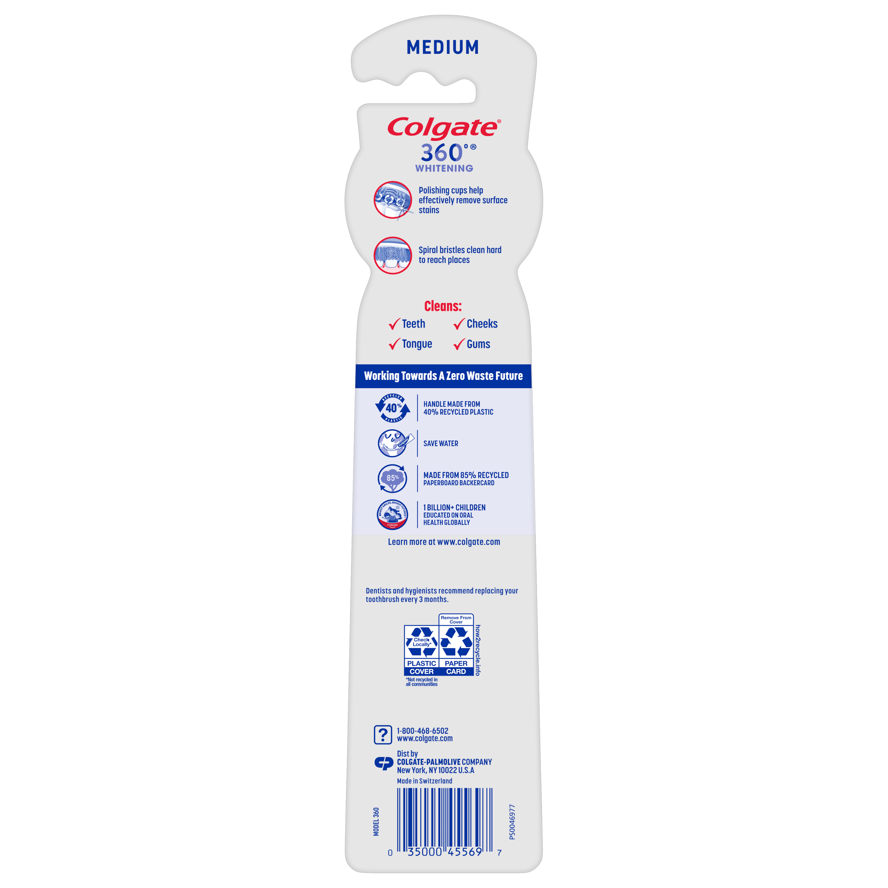 SKU CH01963A Consumer Unit - GTIN 00035000455697 Case - GTIN 10035000455694 Product Category Oral Care Product Sub Category Manual TB Product Equity (Brand) Colgate Product Sub Brand Colgate 360 Man TB Product Title Colgate 360° Optic White Whitening Toothbrush, Medium - 2 Count Product Description The Colgate 36⁰ Optic White medium manual whitening toothbrush is designed with whitening cups that hold toothpaste to effectively help remove surface stains for a naturally white smile. The polishing spiral bristles help whiten teeth by polishing away surface stains and clean hard-to-reach areas. This toothbrush also features a unique cheek & tongue cleaner to comfortably remove odor-causing bacteria. eCommerce Copy- Long Description Colgate 360 Optic White Advanced Medium Adult Manual Toothbrush, 2 pk The Colgate 360 Optic White Advanced Soft Adult Manual Toothbrush, 2 pk is an adult manual toothbrush made for easy brushing. This soft toothbrush for adults is designed with whitening cups to remove teeth stains and special polishing soft bristles to whiten teeth. Plus, a unique tongue and cheek cleaner removes odor causing bacteria for a 360 toothbrushing experience! The 360 Teeth Brushing Experience The Colgate 360 Optic White Advanced Medium Adult Manual Toothbrush features multi-action, tooth-fitting polishing cups to remove surface stains. An ergonomic handle design fits comfortably in your hand while flexible finger grips help the adult manual toothbrush to stay in place; reducing slippage and allowing for more precise maneuvering as you brush your teeth. Healthy Smiles With Colgate At Colgate, we make products that promote healthy smiles. Not only because having a healthy smile is important to your overall health, but because when you have a healthy smile, you actually smile more – and that’s a powerful thing. Smiles are the simplest form of optimism, something we need now more than ever. That’s why we’re championing optimism – we are committed to creating a healthier planet and working every day to create healthy smiles for all. Everyone has the right to a bright smile. That’s why we’re committed to raising oral healthcare standards everywhere. Whether it’s building healthy new habits as kids or learning something new from the experts, we’re here for you. Bullet 1 Features Whitening Cups to Remove Teeth Stains Bullet 2 Special Polishing Bristles to Whiten Teeth Bullet 3 Ergonomic Handle Design for Maximum Comfort Bullet 4 Cleans Hard-to-Reach Places Bullet 5 Cheek and Tongue Cleaner to Remove Bad Breath Bacteria Bullet 6 For Optimal Teeth Whitening, use with Colgate Optic White Whitening Toothpaste Albertsons RPC 970329549 Albertsons URL https://www.albertsons.com/shop/product-details.970329549.html CVS RPC 304208
