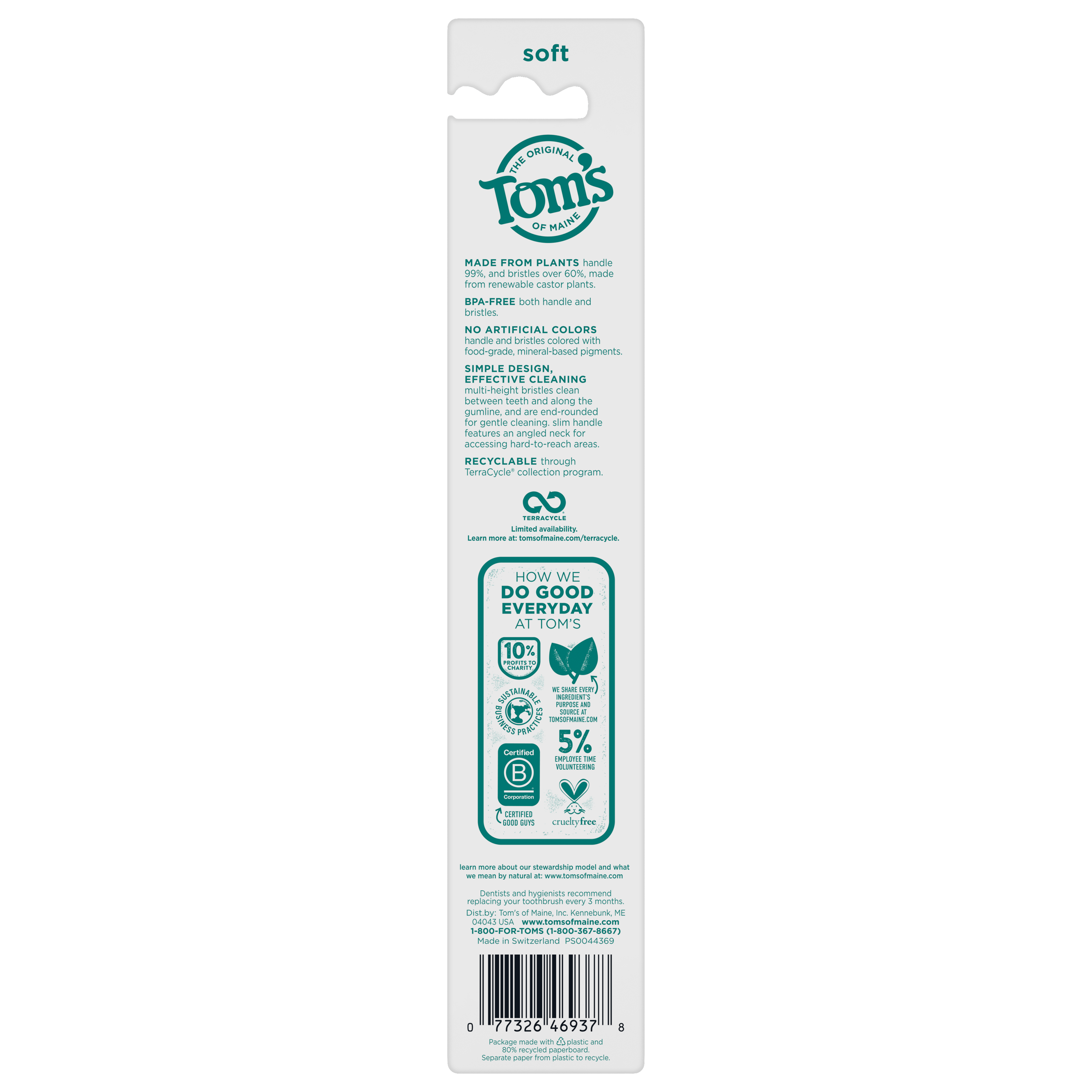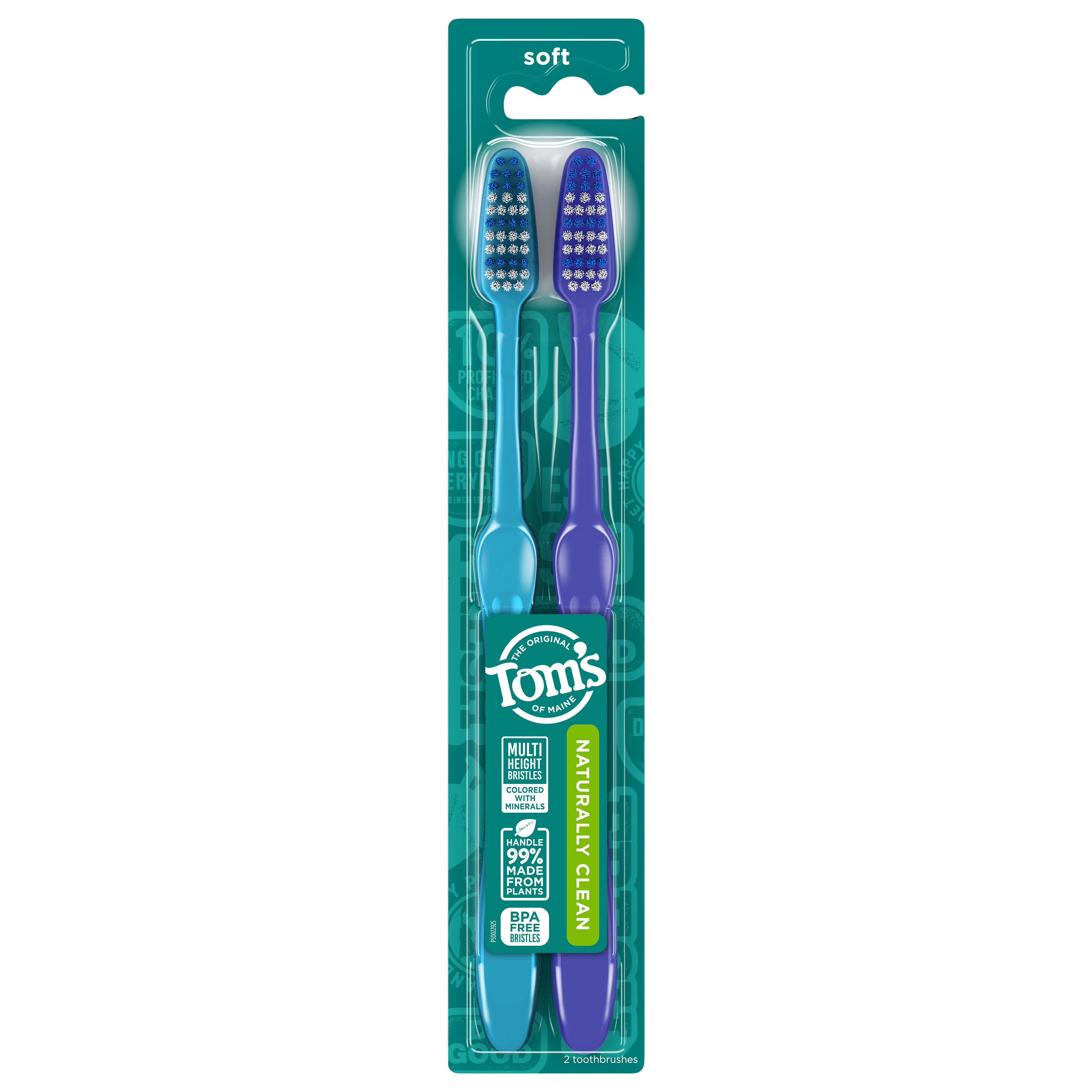SKU CH02062A Consumer Unit - GTIN 00077326469378 Case - GTIN 10077326469375 Product Category Oral Care Product Sub Category Manual TB Product Equity (Brand) Tom's of Maine Product Sub Brand Tom's Man TB Product Title Tom's of Maine Naturally Clean Toothbrush, Soft, Twin Pack Product Description Our Naturally Clean toothbrush gives you lots of reasons to smile. The handle is made from renewable castor oil plants and is recyclable through our TerraCycle collection program. An angled neck and mineral-colored, multi-height bristles are precisely designed for effective cleaning. It's BPA-free, free of artificial colors and a good choice for you and your family. eCommerce Copy- Long Description Our Naturally Clean toothbrush gives you lots of reasons to smile. The handle is made from renewable castor oil plants and is recyclable through our TerraCycle collection program. An angled neck and mineral-colored, multi-height bristles are precisely designed for effective cleaning. It's BPA-free, free of artificial colors and a good choice for you and your family. Bullet 1 BPA-FREE: Tom's of Maine Naturally Clean toothbrush is BPA-free and made from renewable castor oil plants. Bullet 2 CLEANS TEETH & GUM LINE: This natural toothbrush has angled neck and mineral-colored, multi-height bristles, designed for effective cleaning. Bullet 3 RECYCLABLE THROUGH TERRACYCLE: This BPA-free natural toothbrush is recyclable through Tom's TerraCycle collection program. Bullet 4 CERTIFIED B CORP: Tom's of Maine meets the highest standards of verified social and environmental performance, public transparency, and legal accountability to balance profit and purpose. Bullet 5 GIVING FOR GOODNESS: We believe in giving back. Tom's of Maine donates 10% of our profits to charities committed to children's health, education and the environment. Employees donate 5% of paid time to causes they are passionate about in their communities. Thank you for supporting Tom's of Maine. Bullet 6 BPA-FREE BRISTLES: Tom's of Maine Naturally Clean Toothbrush will give you many reasons to smile big. The angled neck of this soft toothbrush and its mineral-colored, BPA-free, and multi-height bristles are designed to give you effective and detailed cleaning. Bullet 7 CLEANS TEETH & GUM LINE: With our natural soft toothbrush, you can naturally clean your teeth and gum line. Our soft toothbrush contains mineral-colored handles and dye-free with BPA-free bristles. Also, the handles are made of 99% renewable castor oil plants. Bullet 8 RECYCLABLE THROUGH TERRACYCLE: This toothbrush is recyclable through our TerraCycle collection program. Bullet 9 CERTIFIED B CORP: Tom's of Maine meets the highest standards of verified social and environmental public transparency, performance, and legal accountability to balance purpose and profit. Amazon RPC B07N8DT2Z8 AMZ URL https://www.amazon.com/dp/B07N8DT2Z8