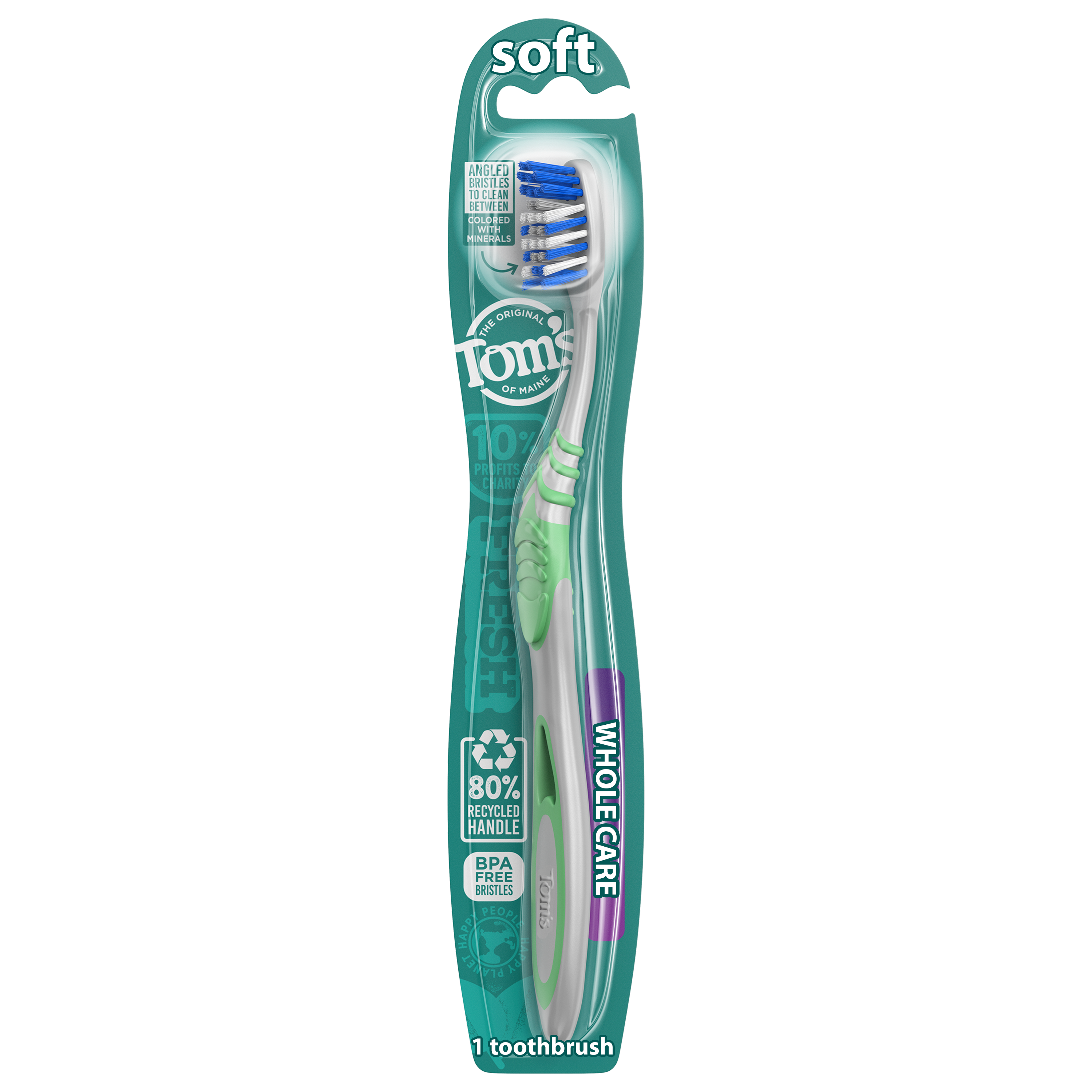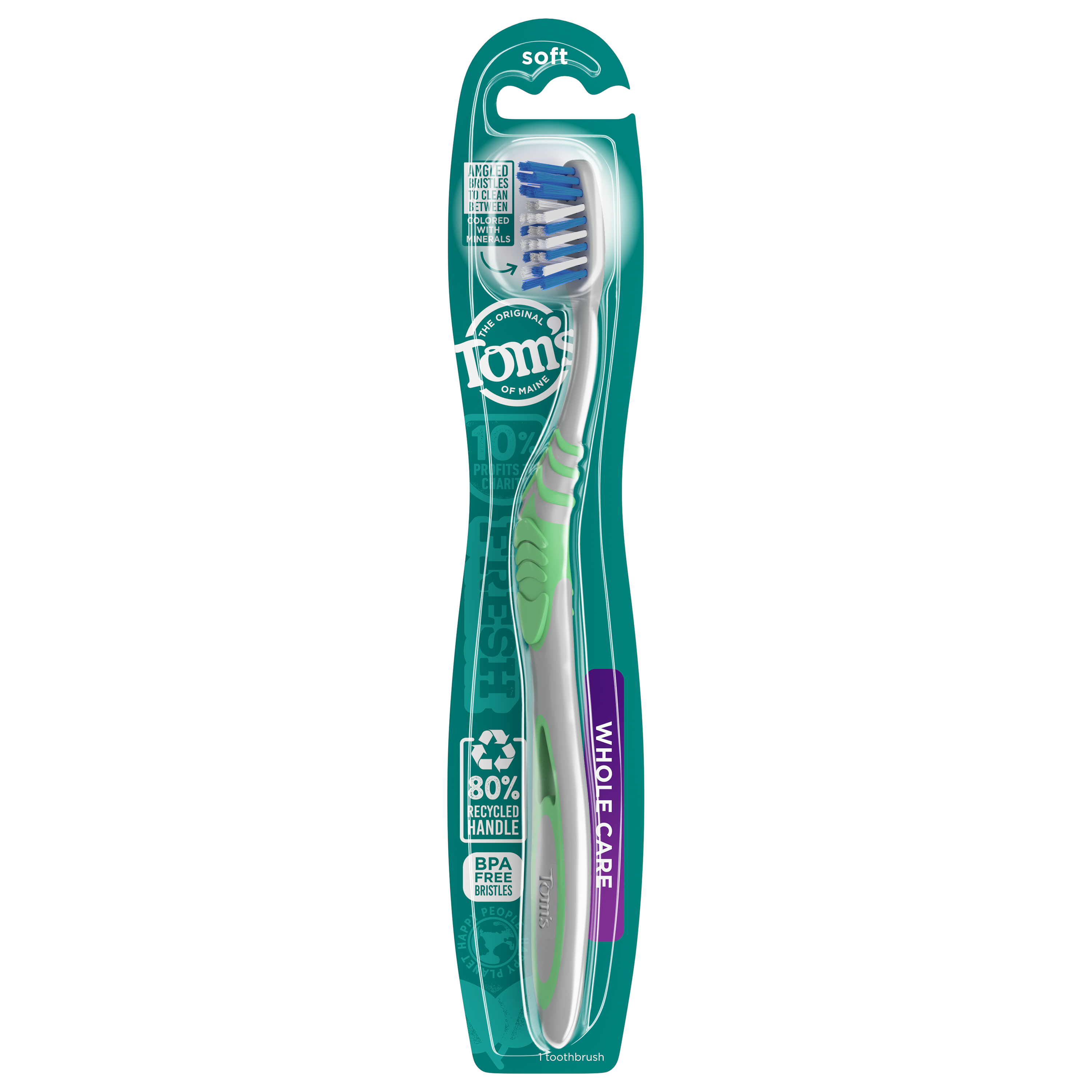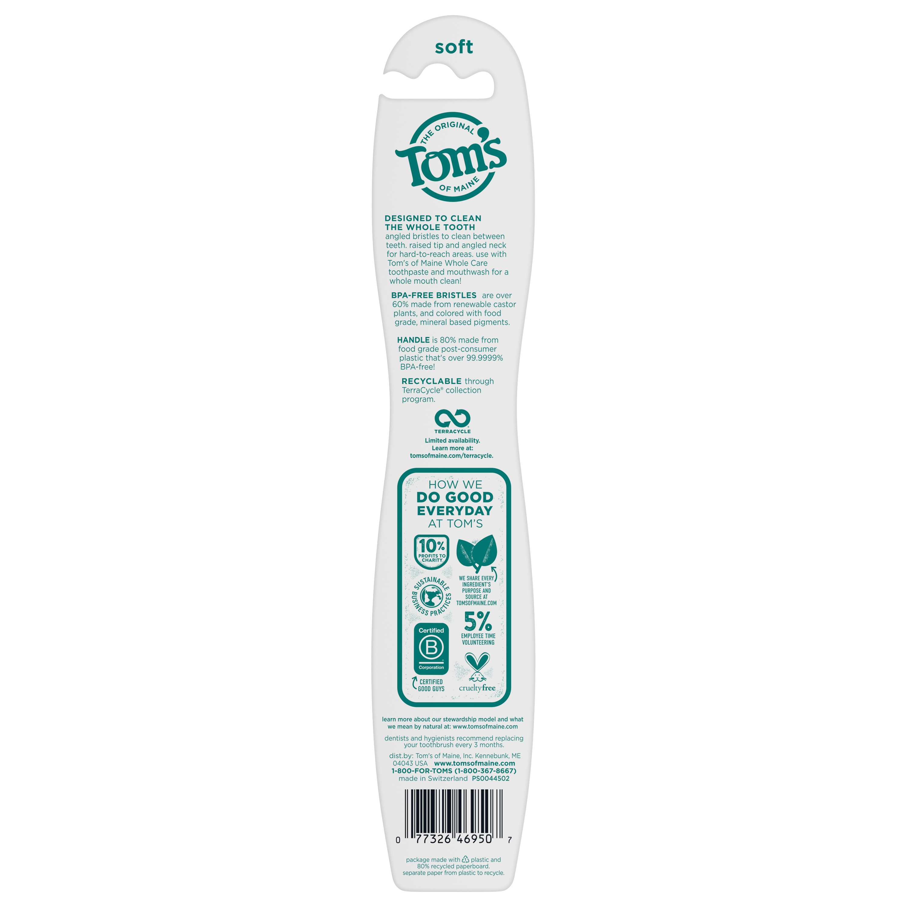 SKU CH02063A Consumer Unit - GTIN 00077326469507 Case - GTIN 10077326469504 Product Category Oral Care Product Sub Category Manual TB Product Equity (Brand) Tom's of Maine Product Sub Brand Tom's Man TB Product Title Tom's of Maine Whole Care Natural Toothbrush with 80% Recycled Plastic Handle & Soft Bristles Product Description What's behind that confident smile? The Tom's of Maine Whole Care Natural Toothbrush. Each soft toothbrush contains angled bristles to remove plaque and gently clean all those hard-to-reach areas. Plus, the handle is made from 8% post-consumer recycled plastic and the soft bristles are BPA-free — so you can brush with the best. When those bristles start to wear, you can take this recyclable toothbrush to your nearest Tom's of Maine TerraCycle collection program. At Tom's of Maine, we want to empower families to live more naturally. With more than 5 years experience combining scientific know-how, naturally derived ingredients and a bit of ingenuity, we make products that are good for you and the planet. As a Certified B Corp, we hold ourselves to the highest social and environmental standards. Plus, we're committed to supporting local communities for meaningful change, donating 1% of our profits to charities supporting health, education and the environment. We call this "doing good, for real," and it impacts everything we do. eCommerce Copy- Long Description What's behind that confident smile? The Tom's of Maine Whole Care Natural Toothbrush. Each soft toothbrush contains angled bristles to remove plaque and gently clean all those hard-to-reach areas. Plus, the handle is made from 80% post-consumer recycled plastic and the soft bristles are BPA-free — so you can brush with the best. When those bristles start to wear, you can take this recyclable toothbrush to your nearest Tom's of Maine TerraCycle collection program. At Tom's of Maine, we want to empower families to live more naturally. With more than 50 years experience combining scientific know-how, naturally derived ingredients and a bit of ingenuity, we make products that are good for you and the planet. As a Certified B Corp, we hold ourselves to the highest social and environmental standards. Plus, we're committed to supporting local communities for meaningful change, donating 10% of our profits to charities supporting health, education and the environment. We call this "doing good, for real," and it impacts everything we do. Bullet 1 WHAT YOU'LL GET: Contains one Tom's of Maine Whole Care Natural Toothbrush with Soft Bristles Bullet 2 CLEANS TEETH & GUMS: Angled bristles remove plaque between teeth, down to the gumline Bullet 3 80% RECYCLED HANDLE: Toothbrush handle is made from 80% post-consumer recycled plastic Bullet 4 WHOLE MOUTH CLEAN: Use with Tom's of Maine Whole Care toothpaste and mouthwash for a whole mouth clean Bullet 5 TAKE CARE OF YOURSELF NATURALLY: Each toothbrush is made from naturally derived ingredients, including BPA-free bristles