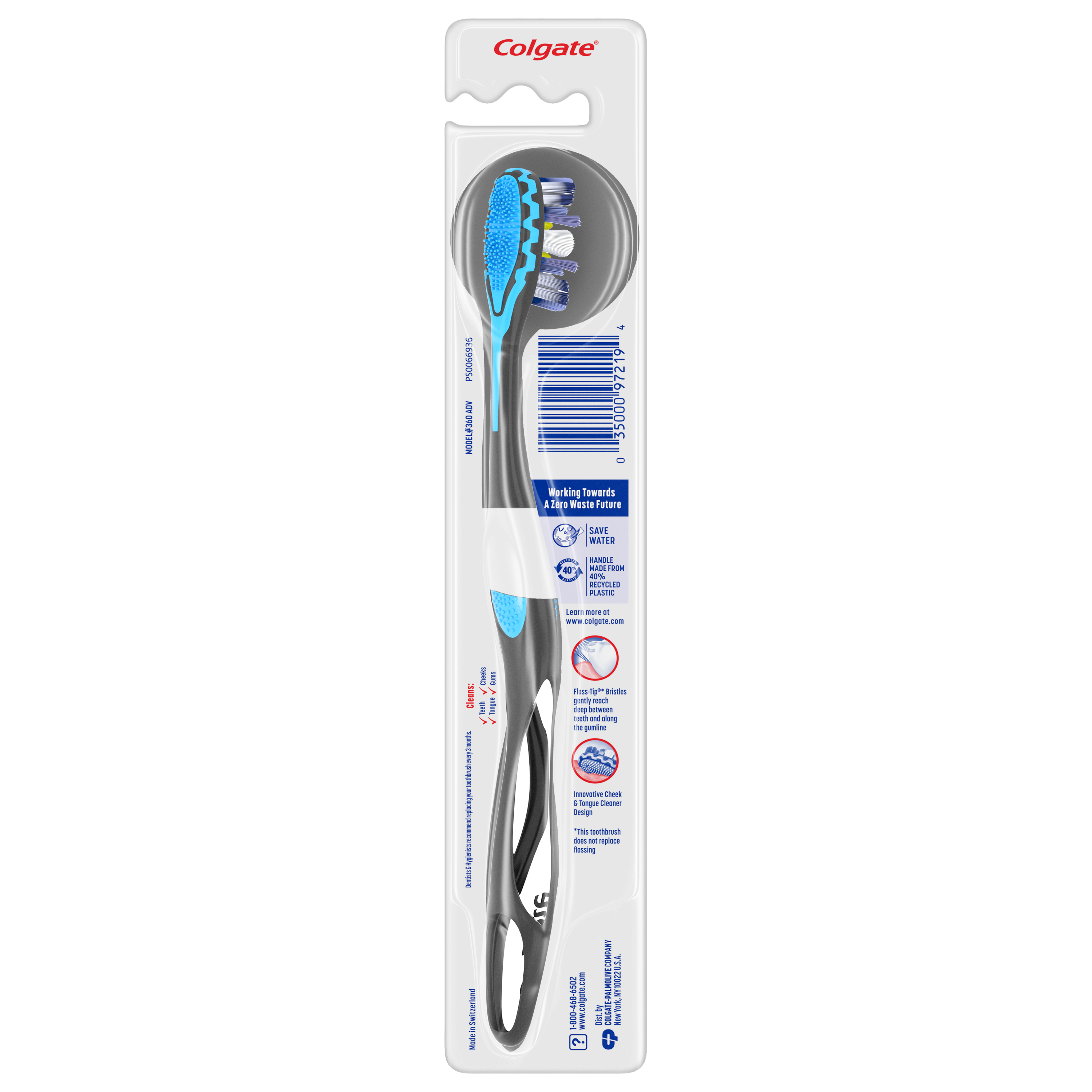 SKU CH02179A Consumer Unit - GTIN 00035000972194 Case - GTIN 10035000972191 Product Category Oral Care Product Sub Category Manual TB Product Equity (Brand) Colgate Product Sub Brand Colgate 360 Adv Floss Tip Man TB Product Title Colgate 360° Advanced Floss-Tip Bristles Toothbrush, Medium Product Description The Colgate 36 Advanced Floss-Tip Bristles manual toothbrush is designed with tapered bristles that are 17 times thinner than ordinary end-rounded bristles. The purple-ended tapered soft bristles gently reach deep between teeth and along the gumline for a 4X deeper reach, compared to an ordinary flat trim toothbrush. The toothbrush’s unique cheek and tongue cleaner removes odor causing bacteria better than brushing teeth alone with an ordinary flat-trim toothbrush. The raised tip helps gently clean hard-to-reach areas of the mouth. This toothbrush does not replace flossing. eCommerce Copy- Long Description The Colgate 360 Advanced Floss-Tip Bristles manual toothbrush is designed with tapered bristles that are 17 times thinner than ordinary end-rounded bristles. The purple-ended tapered soft bristles gently reach deep between teeth and along the gumline for a 4X deeper reach, compared to an ordinary flat trim toothbrush. The toothbrush’s unique cheek and tongue cleaner removes odor causing bacteria better than brushing teeth alone with an ordinary flat-trim toothbrush. The raised tip helps gently clean hard-to-reach areas of the mouth. This toothbrush does not replace flossing. Bullet 1 4X deeper reach* between teeth and along the gumline (below the gumline compared to an ordinary flat-trim toothbrush) Bullet 2 Purple floss-tip* bristles reach deep between teeth (*this toothbrush does not replace flossing.) Bullet 3 Cheek and Tongue Cleaner Helps removes odor causing bacteria Bullet 4 Cleans hard-to-reach areas of the mouth Bullet 5 Toothbrush cleans teeth, tongue, cheeks and gums Bullet 6 Ergonomic handle design Amazon RPC B00BJECKS6 AMZ URL https://www.amazon.com/dp/B00BJECKS6 Walmart RPC 355608593 Walmart URL (Computed) https://www.walmart.com/ip/a/355608593 Target RPC 14299862 Target URL https://www.target.com/p/a/-/A-14299862 Albertsons RPC 960136535 Albertsons URL https://www.albertsons.com/shop/product-details.960136535.html CVS RPC 919713