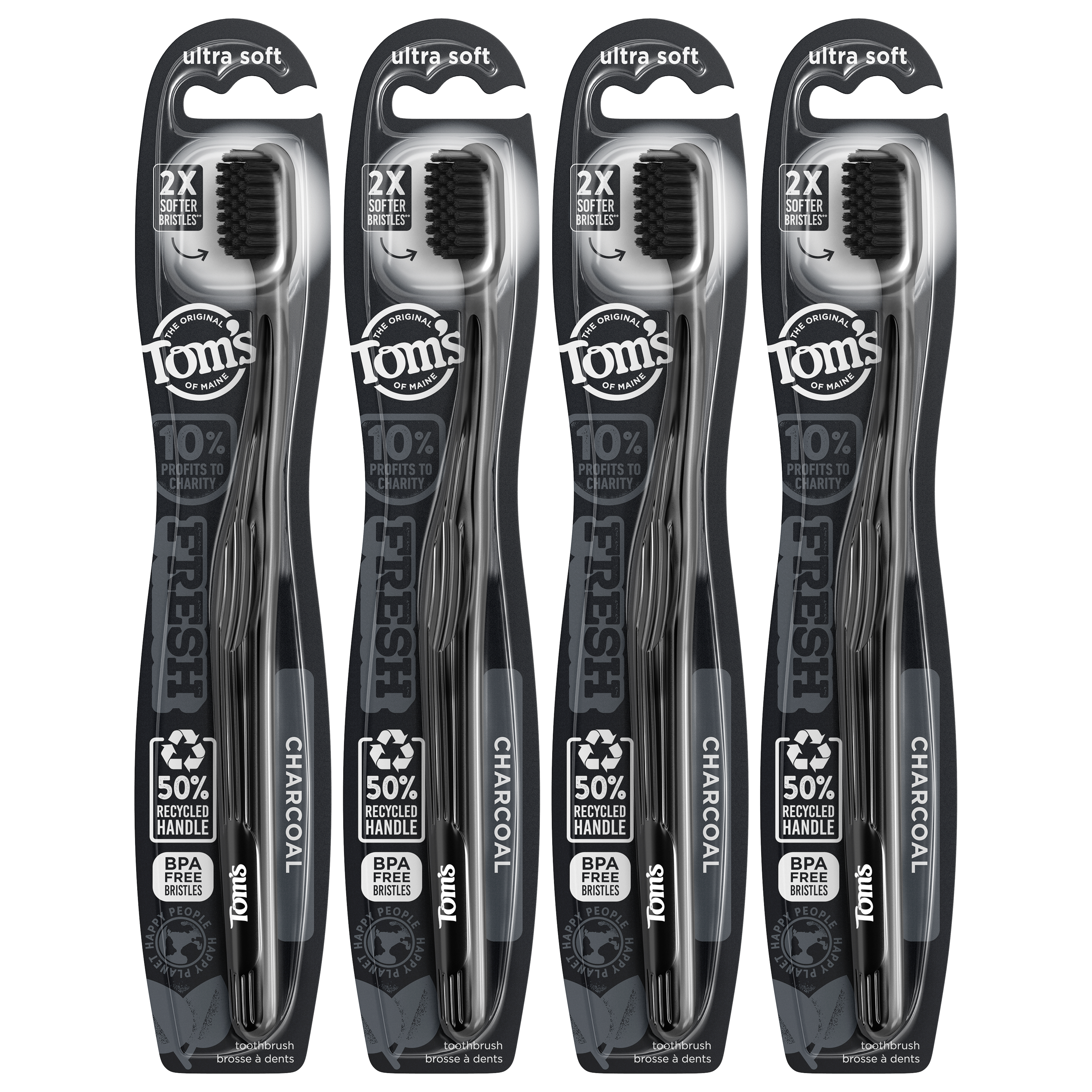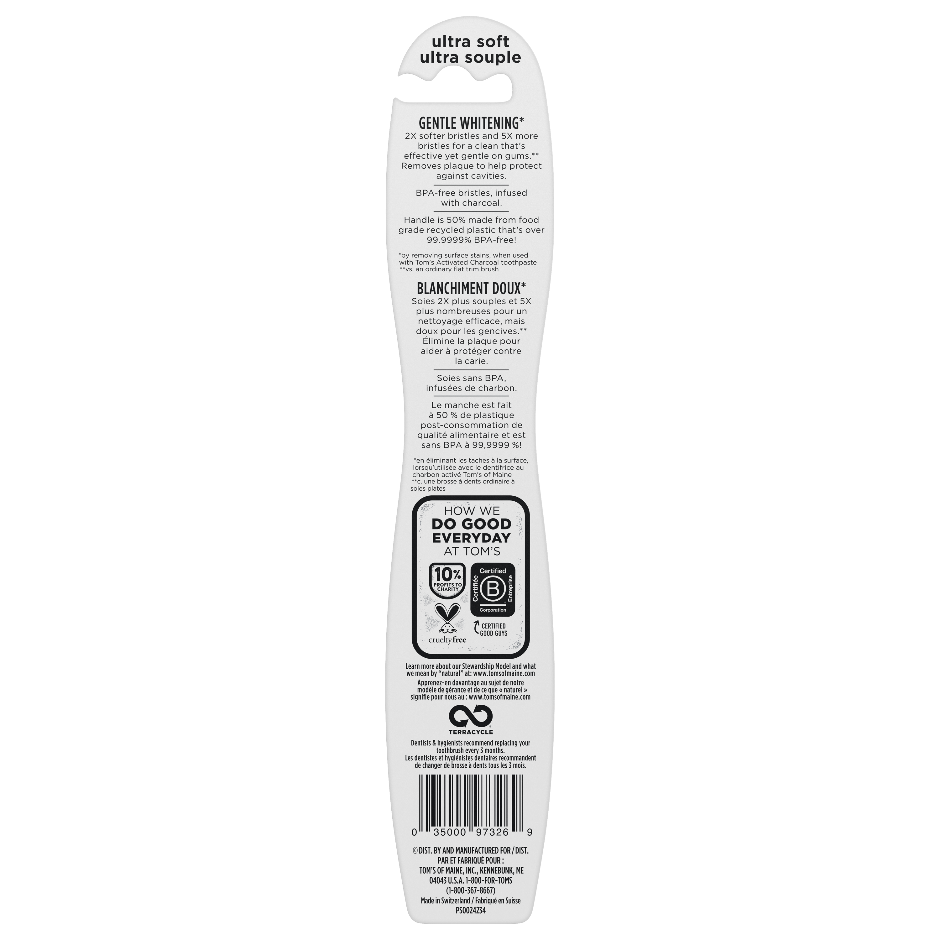 SKU CH02182A Consumer Unit - GTIN 00035000973269 Case - GTIN 10035000973266 Product Category Oral Care Product Sub Category Manual TB Product Equity (Brand) Tom's of Maine Product Sub Brand Tom's Man TB Product Title Tom's of Maine Gentle Soft Charcoal Toothbrush for Stain Removal, 4-Pack Product Description What's behind that confident smile? The Tom's of Maine Gentle Charcoal Toothbrush. The charcoal-infused bristles are two times softer than an ordinary flat trim toothbrush, so this ultra soft toothbrush can effectively remove surface stains and clean teeth while being gentle on gums. Plus, each handle is made from 5% post-consumer recycled plastic, and the ultra soft bristles are BPA-free — so you can brush with the best. When those bristles start to wear, you can take this recyclable toothbrush to your nearest Tom's of Maine TerraCycle collection program. At Tom's of Maine, we want to empower families to live more naturally. With more than 5 years experience combining scientific know-how, naturally derived ingredients and a bit of ingenuity, we make products that are good for you and the planet. As a Certified B Corp, we hold ourselves to the highest social and environmental standards. Plus, we're committed to supporting local communities for meaningful change, donating 1% of our profits to charities supporting health, education and the environment. We call this "doing good, for real," and it impacts everything we do. eCommerce Copy- Long Description What's behind that confident smile? The Tom's of Maine Gentle Charcoal Toothbrush. The charcoal-infused bristles are two times softer than an ordinary flat trim toothbrush, so this ultra soft toothbrush can effectively remove surface stains and clean teeth while being gentle on gums. Plus, each handle is made from 50% post-consumer recycled plastic, and the ultra soft bristles are BPA-free — so you can brush with the best. When those bristles start to wear, you can take this recyclable toothbrush to your nearest Tom's of Maine TerraCycle collection program. At Tom's of Maine, we want to empower families to live more naturally. With more than 50 years experience combining scientific know-how, naturally derived ingredients and a bit of ingenuity, we make products that are good for you and the planet. As a Certified B Corp, we hold ourselves to the highest social and environmental standards. Plus, we're committed to supporting local communities for meaningful change, donating 10% of our profits to charities supporting health, education and the environment. We call this "doing good, for real," and it impacts everything we do. Bullet 1 WHAT YOU'LL GET: Contains one Tom's of Maine Gentle Charcoal Toothbrush with Ultra Soft Bristles Bullet 2 GENTLE ON GUMS: Charcoal-infused bristles are 2x softer than an ordinary flat-trim toothbrush to gently clean teeth and gums Bullet 3 50% RECYCLED HANDLE: This ultra-soft toothbrush handle is made from 50% post-consumer recycled plastic Bullet 4 RECYCLABLE TOOTHBRUSH: Can be recycled through the Tom's of Maine TerraCycle collection program Bullet 5 TAKE CARE OF YOURSELF NATURALLY: Each charcoal toothbrush uses BPA-free bristles Amazon RPC B083242F9J AMZ URL https://www.amazon.com/dp/B083242F9J