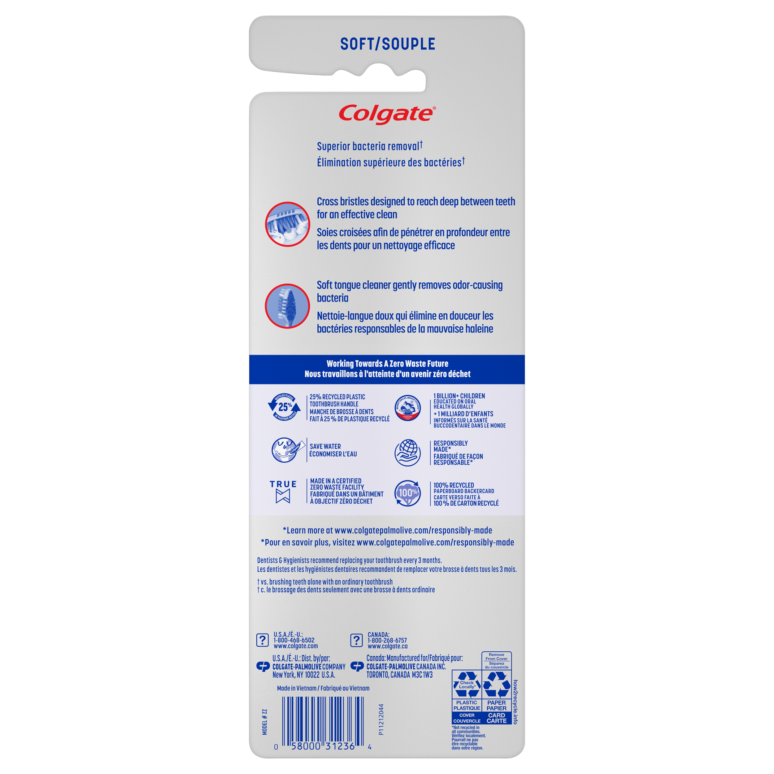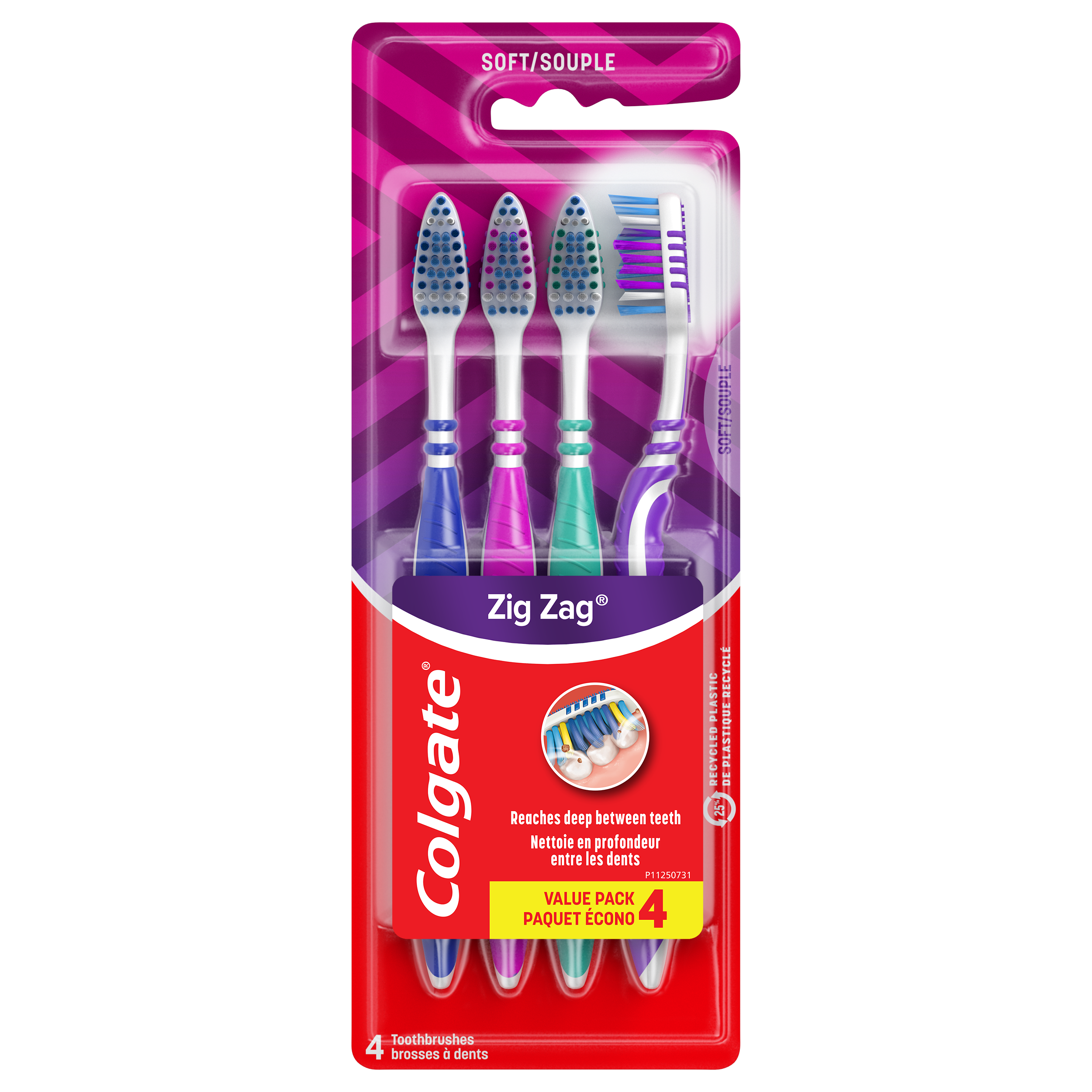 SKU CN01386A Consumer Unit - GTIN 00058000312364 Case - GTIN 10058000313368 Product Category Oral Care Product Sub Category Manual TB Product Equity (Brand) Colgate Product Sub Brand Colgate Zigzag Man TB Product Title Colgate ZigZag Deep Clean Manual Toothbrush With Tongue and Cheek Cleaner, Soft, 4 Pack Product Description Colgate ZigZag Deep Clean Manual Toothbrush With Tongue and Cheek Cleaner, Soft, 4 Pack Colgate ZigZag Deep Clean Manual Toothbrush With Tongue and Cheek Cleaner gives your mouth a deep clean. Designed with v-shaped cross bristles, this soft toothbrush reaches deep between teeth for a great clean that reaches all the right places. Plus, this adult manual toothbrush also has a soft tongue cleaner that gently removes odor causing bacteria from your tongue and cheeks. Deep Cleaning Promoting healthier smiles all around, the Colgate ZigZag adult toothbrush provides a comfortable clean with control during your brushing routine. The Colgate ZigZag Toothbrush handle is made of 25% recycled plastic, and the packaging includes a 100% recycled paperboard backercard. These deep clean toothbrushes come in different colors for multiple people in a household or for a replenishment. A Healthy Smile With Colgate At Colgate, we make products that promote healthy smiles. Not only because having a healthy smile is important to your overall health, but because when you have a healthy smile, you actually smile more – and that’s a powerful thing. Smiles are the simplest form of optimism, something we need now more than ever. That’s why we’re championing optimism – we are committed to creating a healthier planet and working every day to create healthy smiles for all. Everyone has the right to a bright smile. That’s why we’re committed to raising oral healthcare standards everywhere. Whether it’s building healthy new habits as kids or learning something new from the experts, we’re here for you. Bullet 1 The Colgate ZigZag Deep Clean soft manual toothbrush for adults brushes your teeth easily Bullet 2 Reaches deep between teeth for a great clean that reaches the right places. Bullet 3 A soft tongue cleaner gently removes odor causing bacteria from your tongue and cheeks. Bullet 4 Features a 25% recycled plastic toothbrush handle and a 100% recycled paperboard backercard. Bullet 5 The colorful soft toothbrush bulk set is perfect to replenish you and your household. Bullet 6 These deep clean toothbrushes come in different colors for multiple people in a household. Active Ingredients N/A Walmart RPC 55331598 Walmart URL (Computed) https://www.walmart.com/ip/a/55331598 Albertsons RPC 960323637 Albertsons URL https://www.albertsons.com/shop/product-details.960323637.html