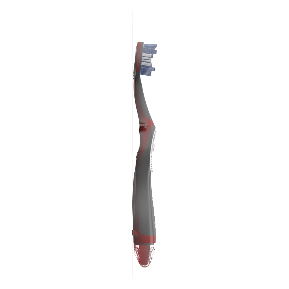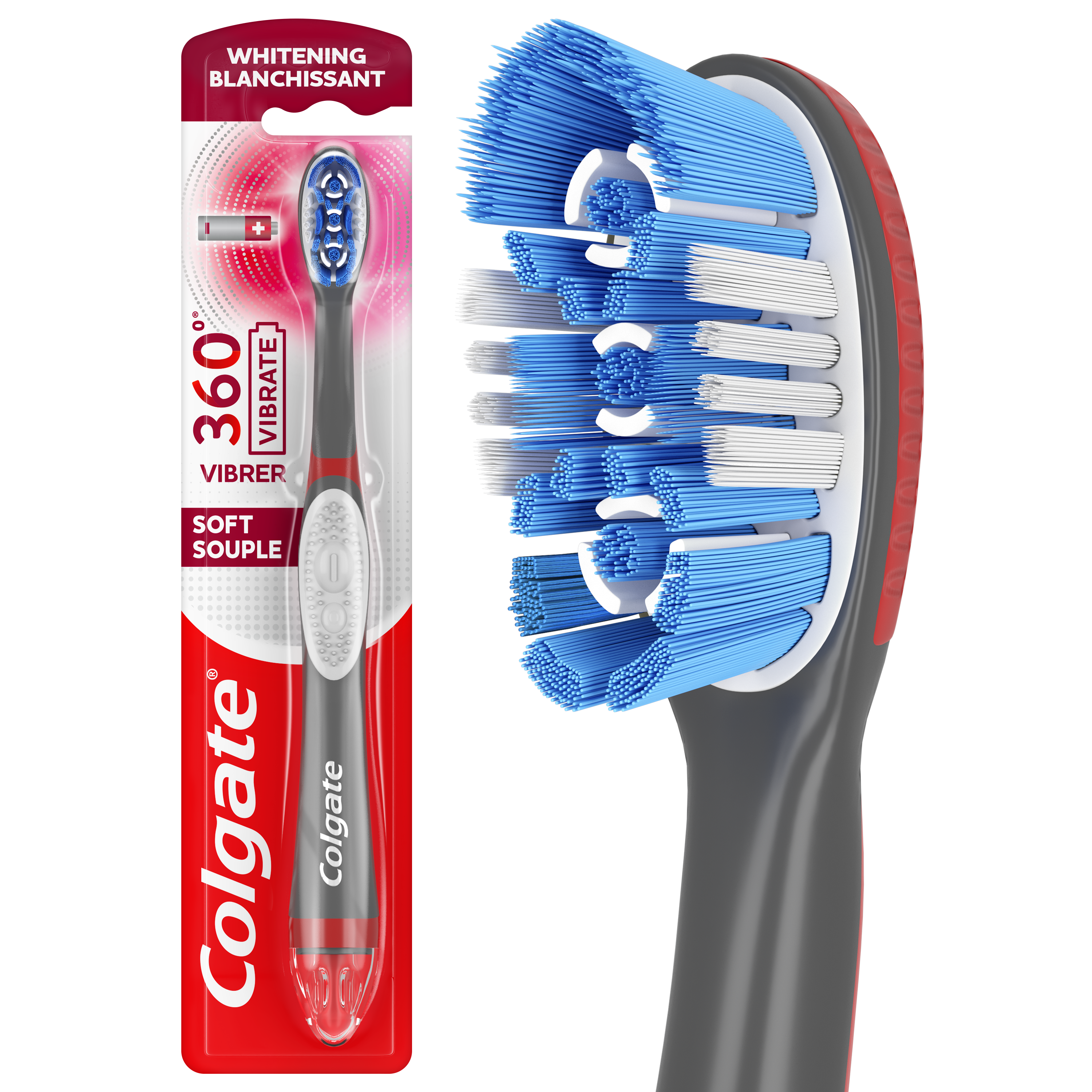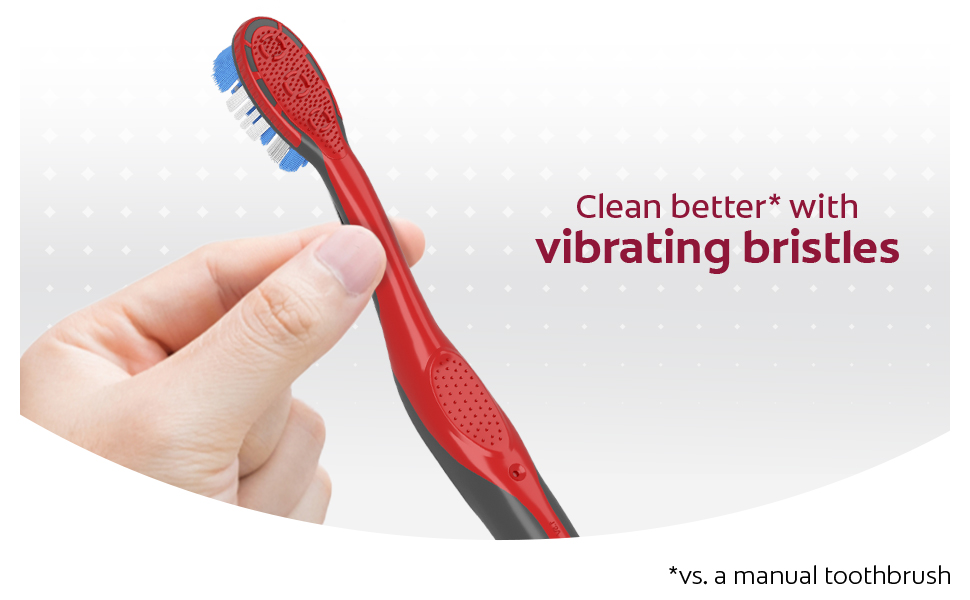 The Colgate 360 Vibrate Whitening Toothbrush combines the power of a battery toothbrush with the familiarity of a manual toothbrush head for a brighter, whiter smile*. This full mouth vibrating toothbrush uses soft Floss Tip bristles** to clean between teeth. The adult toothbrush is perfect for travel because it’s battery powered, so it can be used wherever you go (1 AAA battery included).
