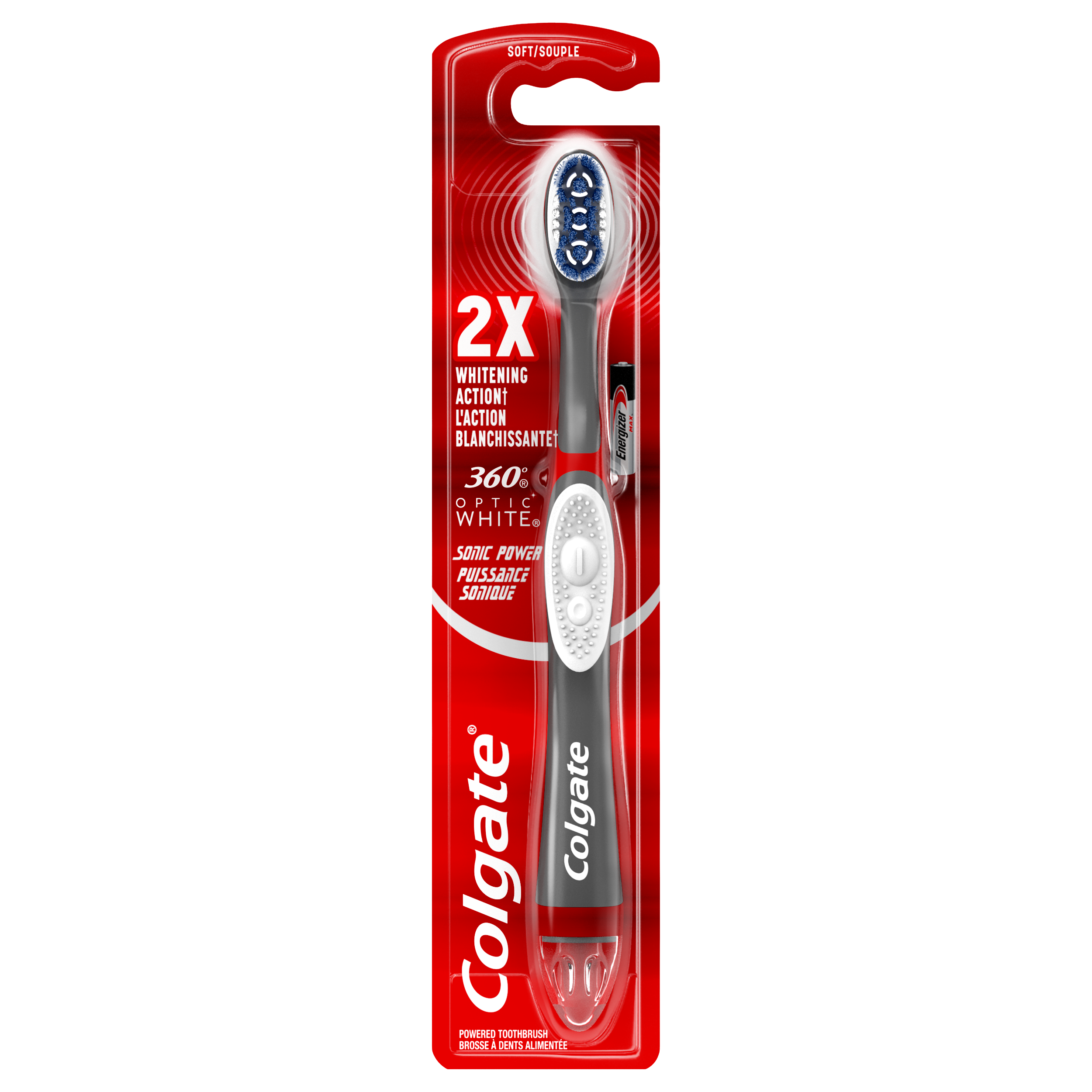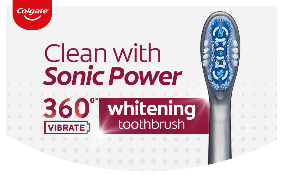 Experience a whiter smile* and a healthier whole mouth clean with just a press of a button with the Colgate 360 Vibrate Whitening Toothbrush. This battery powered toothbrush cleans the teeth, cheeks, tongue, and gums so you can enjoy a whole mouth clean with every brush. The soft, vibrating bristles deliver powerful cleaning using sonic technology. Clean better*** with vibrating bristles powered by sonic technology with the Colgate 360 Vibrate Whitening Battery Toothbrush.