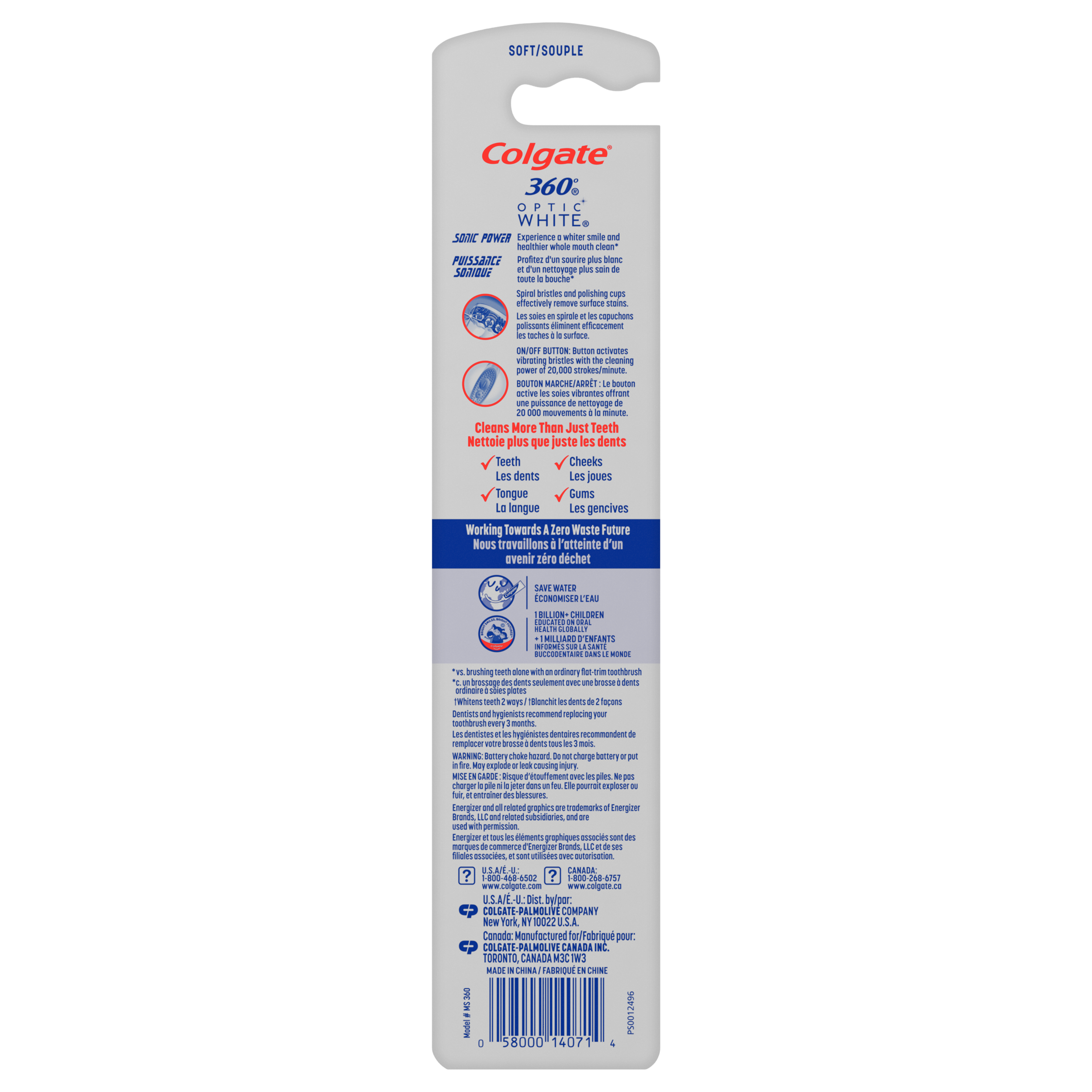 SKU CN05776A Consumer Unit - GTIN 00058000140714 Case - GTIN 10058000140711 Product Category Oral Care Product Sub Category Battery TB Product Equity (Brand) Colgate Product Sub Brand Colgate 360 Hybrid BTB Product Title Colgate 360 Vibrate Whitening Battery-Operated Toothbrush Product Description Colgate 360 Vibrate Whitening Battery-Operated Toothbrush combines the power of a battery-operated toothbrush with the familiarity of a manual toothbrush head for a brighter, whiter smile*. This full mouth vibrating toothbrush uses soft Floss Tip bristles** to clean between teeth. The whitening toothbrush is perfect for travel because it’s battery-powered, so it can be used wherever you go (1 AAA battery included). Experience a whiter smile* and a healthier whole mouth clean with just a press of a button with the Colgate 360 battery powered toothbrush. This disposable electric toothbrush cleans the teeth, cheeks, tongue, and gums so you can enjoy a whole mouth clean with every brush. The soft, vibrating toothbrush bristles deliver powerful cleaning using sonic technology. Clean better*** with vibrating bristles powered by sonic technology with the Colgate 360 disposable electric battery whitening toothbrush. At Colgate, we make products that promote healthy smiles. Not only because having a healthy smile is important to your overall health, but because when you have a healthy smile, you actually smile more – and that’s a powerful thing. Smiles are the simplest form of optimism, something we need now more than ever. That’s why we’re championing optimism – we are committed to creating a healthier planet and working every day to create healthy smiles for all. Everyone has the right to a bright smile. That’s why we’re committed to raising oral healthcare standards everywhere. Whether it’s building healthy new habits as kids or learning something new from the experts, we’re here for you. *vs. brushing teeth alone with an ordinary flat trim toothbrush **does not replace flossing ***vs. a manual toothbrush eCommerce Copy- Long Description Colgate 360 Vibrate Whitening Battery Toothbrush