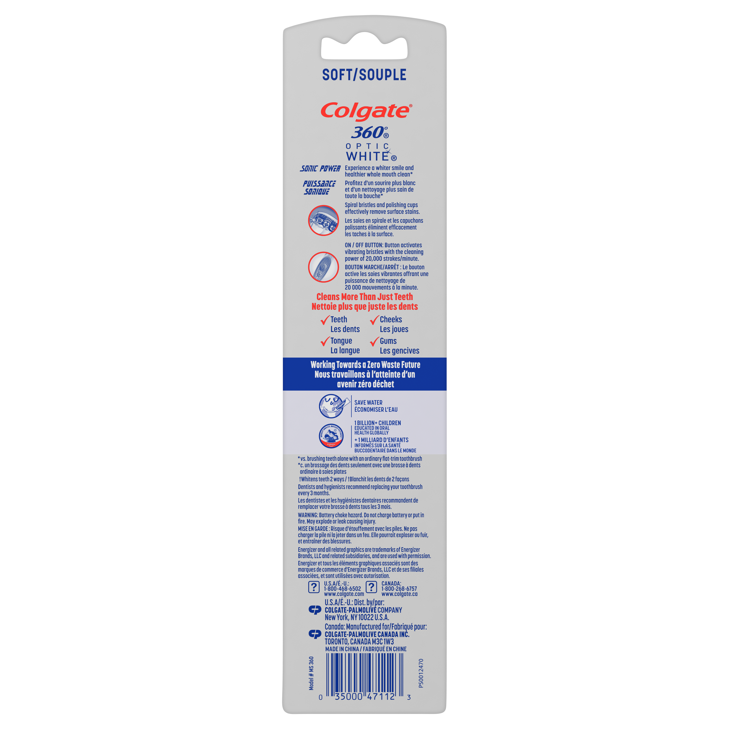 SKU CN07270A Consumer Unit - GTIN 00035000471123 Case - GTIN 10035000471120 Product Category Oral Care Product Sub Category Battery TB Product Equity (Brand) Colgate Product Sub Brand Colgate 360 Hybrid BTB Product Title Colgate 360 Vibrate Whitening Battery-Operated Toothbrush Pack Product Description Colgate 360 Vibrate Whitening Battery-Operated Toothbrush combines the power of a battery-operated toothbrush with the familiarity of a manual toothbrush head for a brighter, whiter smile*. This full mouth vibrating toothbrush pack uses soft Floss Tip bristles** to clean between teeth. Each whitening toothbrush is perfect for travel because they are battery-powered, so they can be used wherever you go (1 AAA battery included). Experience a whiter smile* and a healthier whole mouth clean with just a press of a button with the Colgate 360 battery powered soft toothbrush. This disposable electric toothbrush cleans the teeth, cheeks, tongue, and gums so you can enjoy a whole mouth clean with every brush. The soft, vibrating toothbrush bristles deliver powerful cleaning using sonic technology. Clean better*** with vibrating bristles powered by sonic technology with the Colgate 360 disposable electric battery whitening toothbrush. At Colgate, we make products that promote healthy smiles. Not only because having a healthy smile is important to your overall health, but because when you have a healthy smile, you actually smile more – and that’s a powerful thing. Smiles are the simplest form of optimism, something we need now more than ever. That’s why we’re championing optimism – we are committed to creating a healthier planet and working every day to create healthy smiles for all. Everyone has the right to a bright smile. That’s why we’re committed to raising oral healthcare standards everywhere. Whether it’s building healthy new habits as kids or learning something new from the experts, we’re here for you. *vs. brushing teeth alone with an ordinary flat trim toothbrush **does not replace flossing ***vs. a manual toothbrush Bullet 1 Includes two (2) Colgate 360 Vibrate Whitening Battery-Operated Toothbrushes, 1 AAA battery included Bullet 2 Combines the familiarity of a manual soft toothbrush head with the power of a battery-operated toothbrush Bullet 3 Whitening toothbrush features soft Floss Tip bristles** that help clean between teeth (**does not replace flossing) Bullet 4 Powerful sonic technology delivers incredible cleaning power with a simple press of a button on the vibrating toothbrush Bullet 5 Battery powered toothbrush cleans the whole mouth including the teeth, cheeks, tongue, and gums so you can enjoy a whole mouth clean with every brush Bullet 6 Clean better*** with vibrating bristles powered by sonic technology using the Colgate 360 Vibrating Whitening Toothbrush (***vs. a manual toothbrush) Bullet 7 Experience a whiter smile* with the Colgate 360 Vibrating Whitening Toothbrush (*vs. brushing teeth alone with an ordinary flat trim toothbrush) Amazon RPC B082F1LY87 AMZ URL https://www.amazon.com/dp/B082F1LY87 Walmart RPC 632132612 Walmart URL (Computed) https://www.walmart.com/ip/a/632132612 CVS RPC 415183