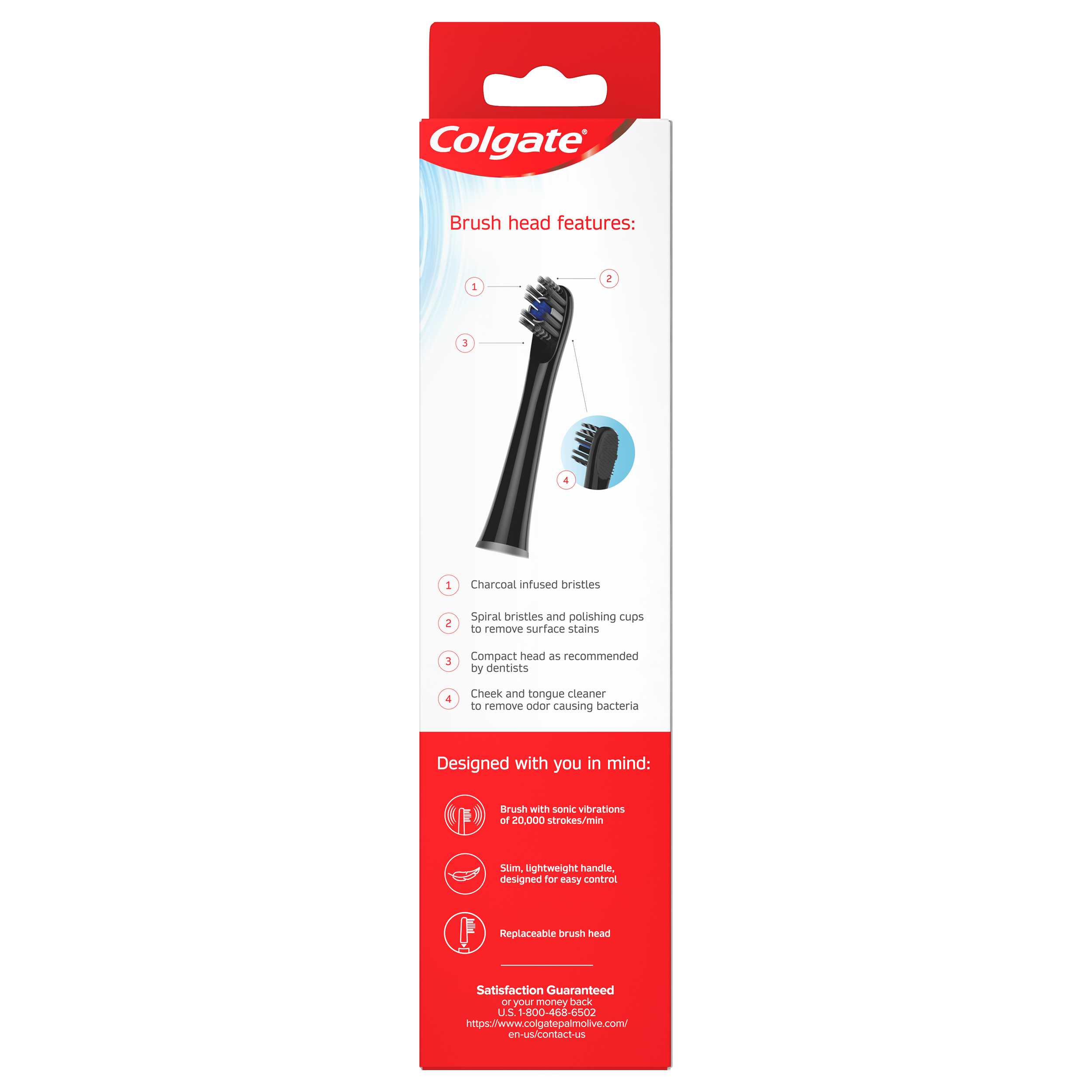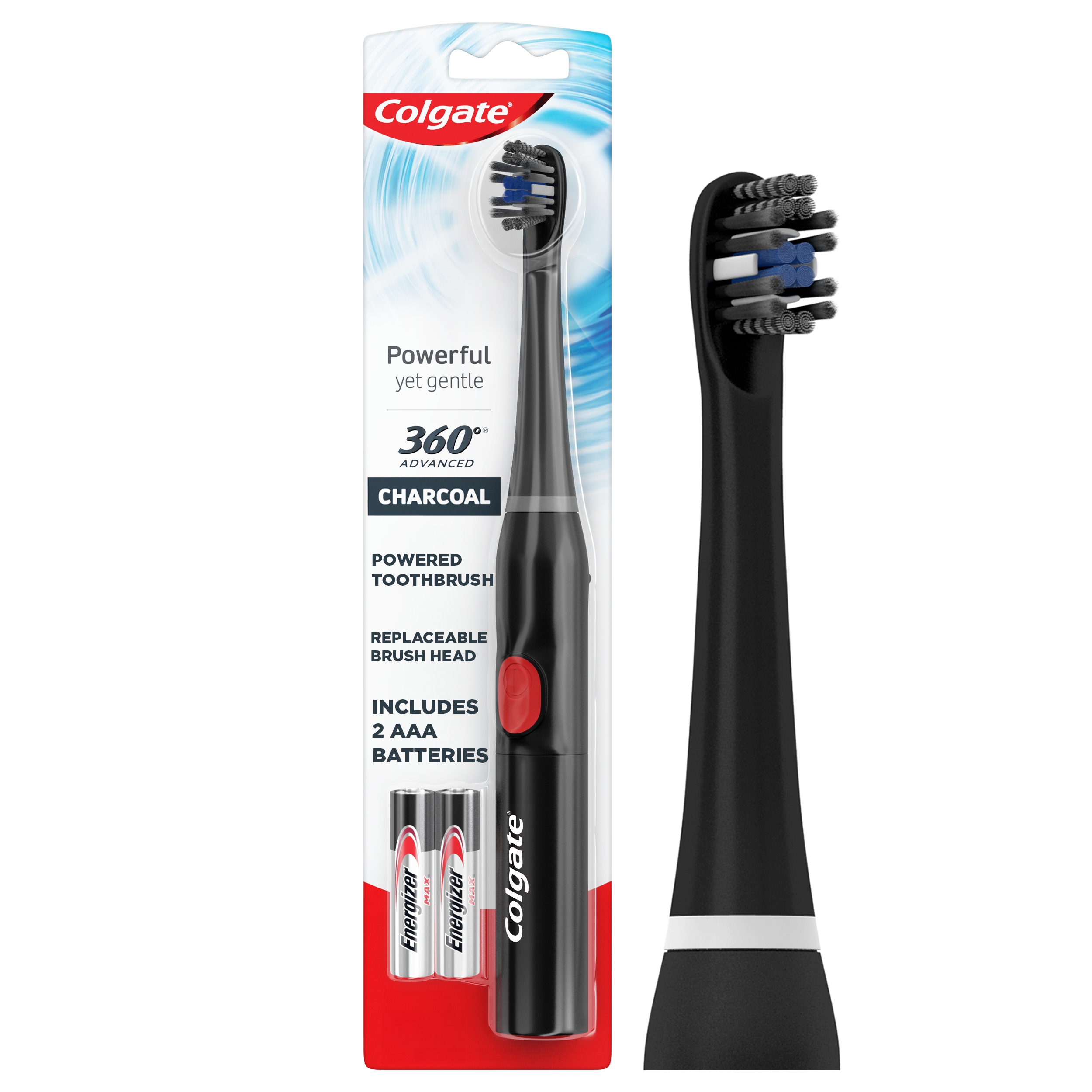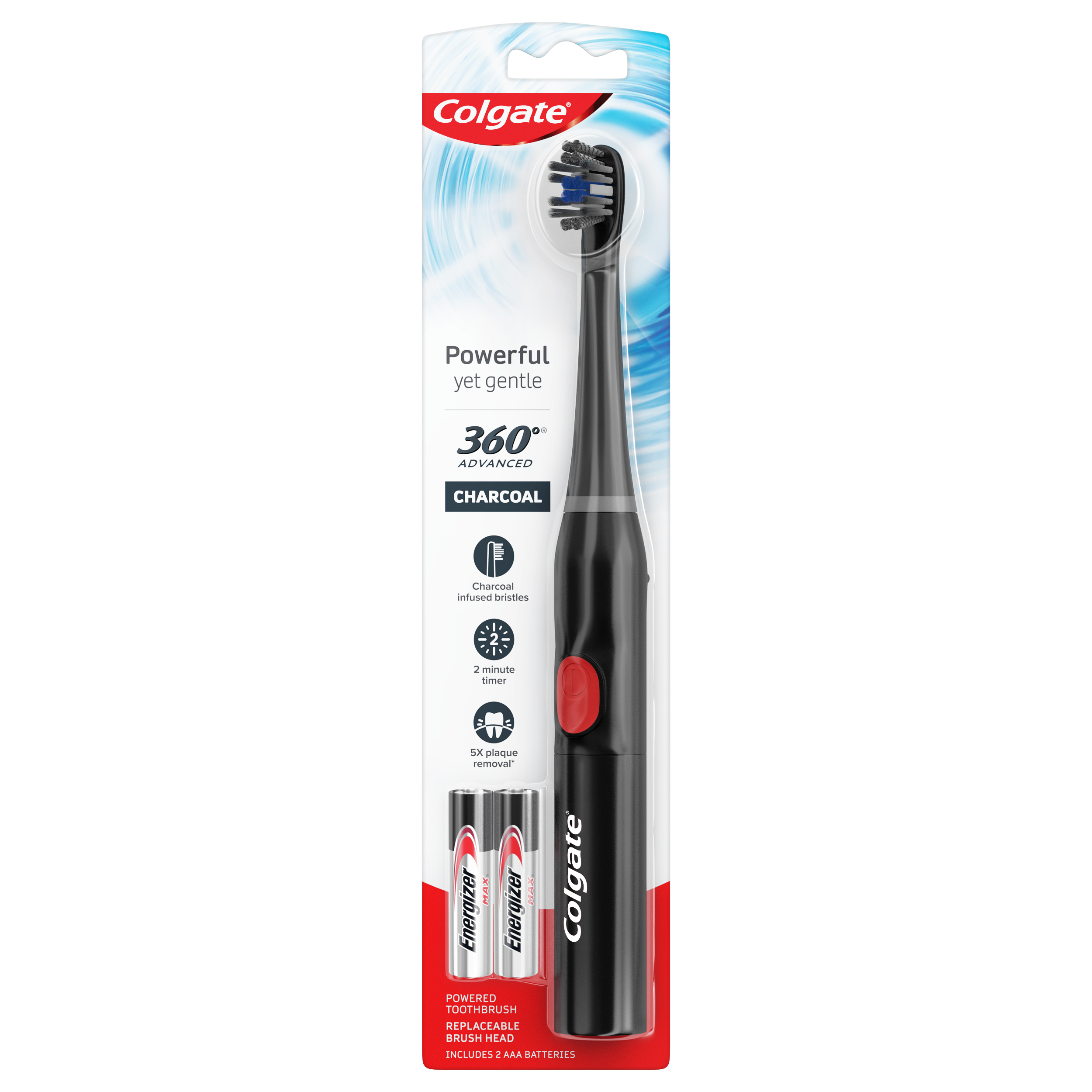 SKU CN07357A Consumer Unit - GTIN 00035000472540 Case - GTIN 10035000472547 Product Category Oral Care Product Sub Category Battery TB Product Equity (Brand) Colgate Product Sub Brand Colgate Adv BTB Product Title Colgate 360 Advanced Charcoal Battery Powered Toothbrush Product Description The Colgate 36 Advanced Charcoal battery powered toothbrush with replaceable brush heads provides 5X plaque reduction* while still being gentle on gums. The ultra slim, lightweight handle design provides sonic vibrations of 2, strokes per minute and includes a 2 minute timer to ensure recommended brushing time. The compact brush head includes charcoal infused bristles, polishing cups to remove surface stains, and a cheek & tongue cleaner that removes odor causing bacteria. *along the gumline vs. an ordinary manual toothbrush eCommerce Copy- Long Description The Colgate 360 Advanced Charcoal battery powered toothbrush with replaceable brush heads provides 5X plaque reduction* while still being gentle on gums. The ultra slim, lightweight handle design provides sonic vibrations of 20,000 strokes per minute and includes a 2 minute timer to ensure recommended brushing time. The compact brush head includes charcoal infused bristles, polishing cups to remove surface stains, and a cheek & tongue cleaner that removes odor causing bacteria. *along the gumline vs. an ordinary manual toothbrush Bullet 1 Colgate® AAA battery powered electric toothbrush with replaceable brush heads (2 AAA batteries included) Bullet 2 Charcoal infused bristles Bullet 3 Sonic vibrations of 20,000 strokes per minute Bullet 4 Provides 5X plaque reduction along the gumline vs. an ordinary manual toothbrush and is gentle on teeth and gums Bullet 5 Ultra slim, lightweight handle designed for easy control Bullet 6 2 minute toothbrush timer helps ensure recommended brushing time Bullet 7 Brush head includes spiral bristles & polishing cups to help remove surface stains Bullet 8 Features a quiet brushing experience Bullet 9 Replaceable brush heads sold separately Active Ingredients N/A Walmart RPC 257262456 Walmart URL (Computed) https://www.walmart.com/ip/a/257262456