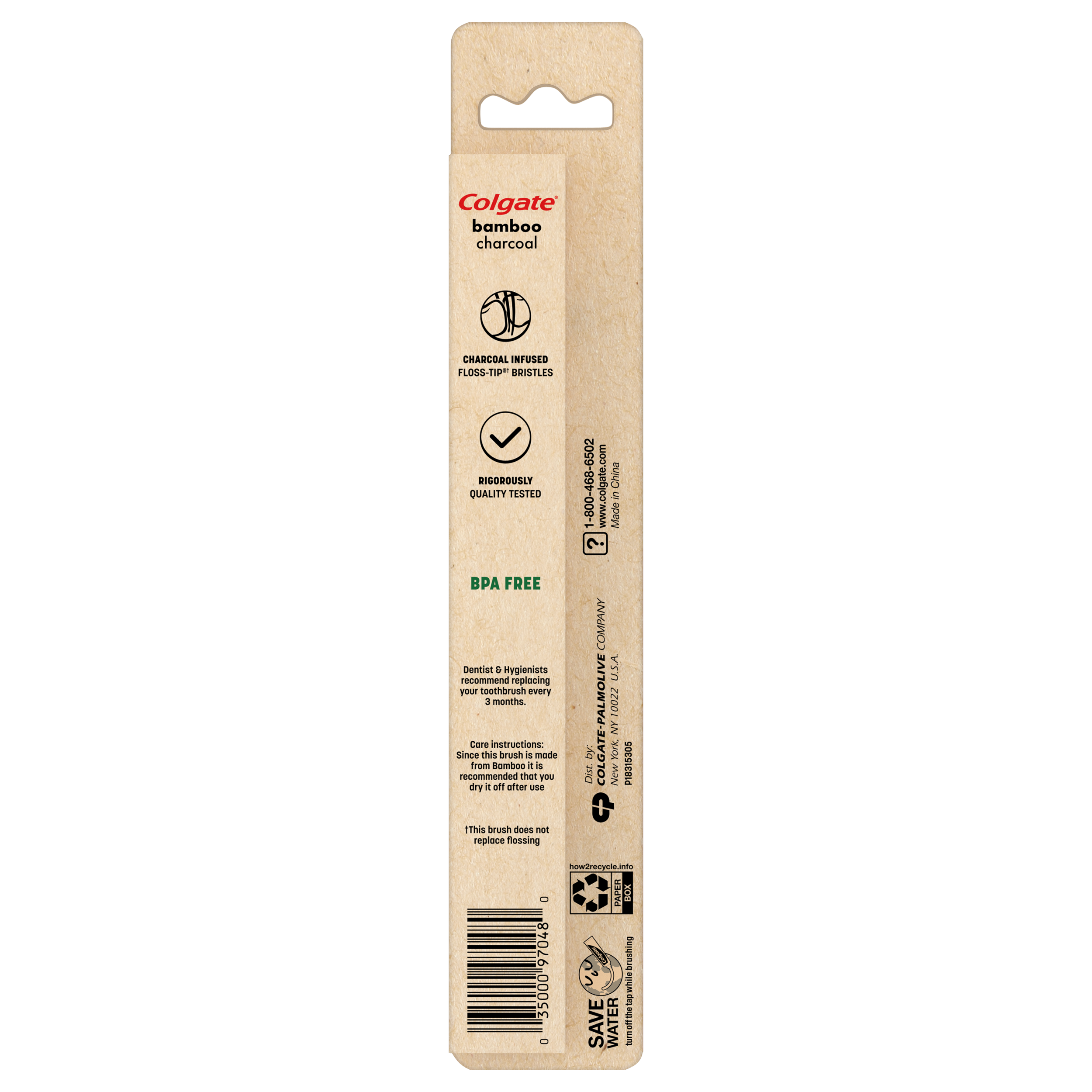 SKU CN07810A Consumer Unit - GTIN 00035000970480 Case - GTIN 10035000970487 Product Category Oral Care Product Sub Category Manual TB Product Equity (Brand) Colgate Product Sub Brand Colgate Bamboo Man TB Product Title Colgate® Bamboo Charcoal Soft Toothbrush Product Description The Colgate® Bamboo Charcoal Toothbrush is good for you and good for the environment. The handle of this soft bristle toothbrush is made from 1% natural, sustainably grown bamboo, and because it’s from Colgate, you know it’s been tested to meet our high standards. • Bamboo toothbrush handle made with 1% natural, sustainably grown material • BPA free • Rigorously tested to meet Colgate’s standards • Charcoal infused, floss-tip soft bristles eCommerce Copy- Long Description The Colgate® Bamboo Charcoal Toothbrush is good for you and good for the environment. The handle of this soft bristle toothbrush is made from 100% natural, sustainably grown bamboo, and because it’s from Colgate, you know it’s been tested to meet our high standards. • Bamboo toothbrush handle made with 100% natural, sustainably grown material • BPA free • Rigorously tested to meet Colgate’s standards • Charcoal infused, floss-tip soft bristles Bullet 1 Bamboo toothbrush handle made with 100% natural, sustainably grown material Bullet 2 BPA free Bullet 3 Rigorously tested to meet Colgate’s standards Bullet 4 Recycled cardboard packaging Bullet 5 Charcoal infused, floss-tip soft bristles