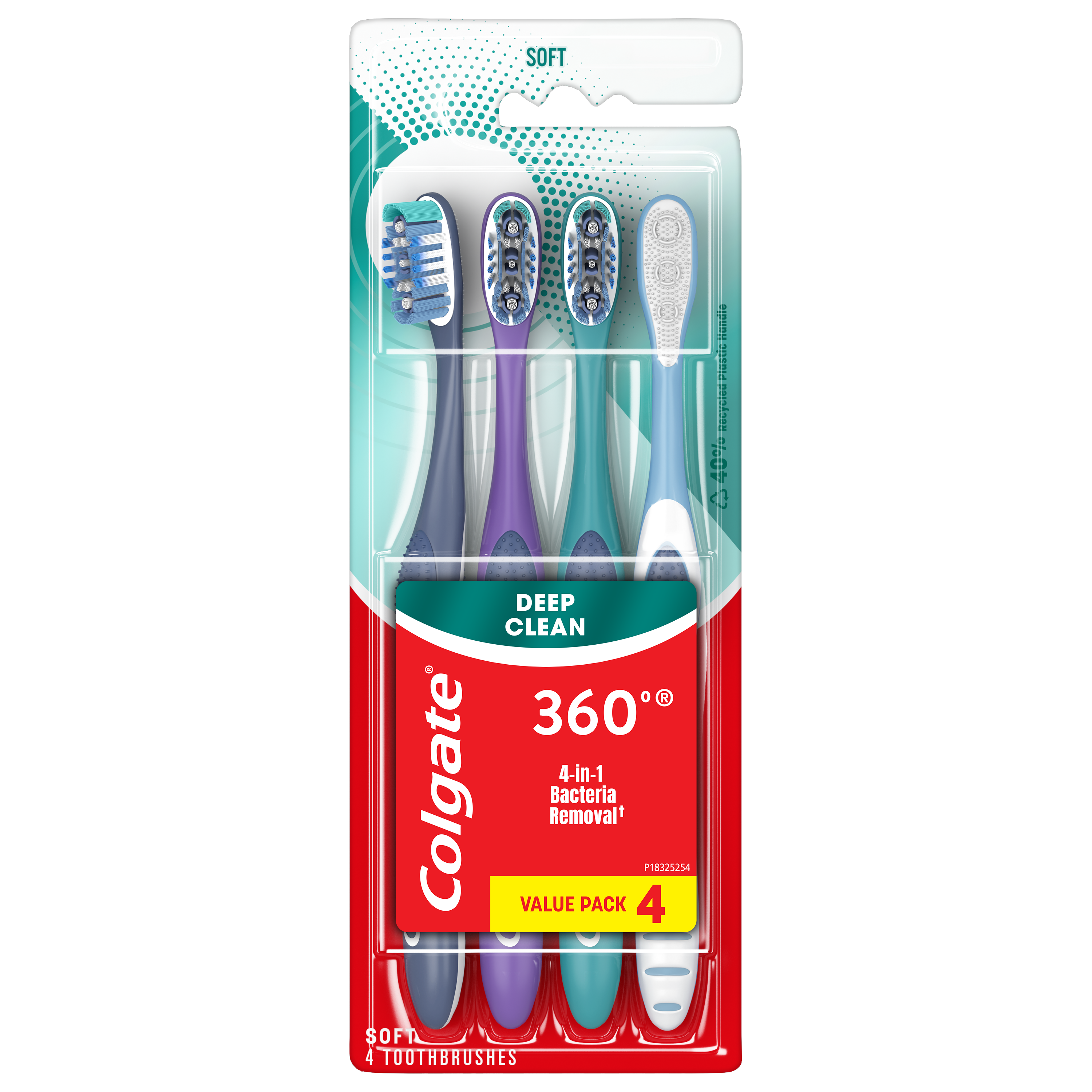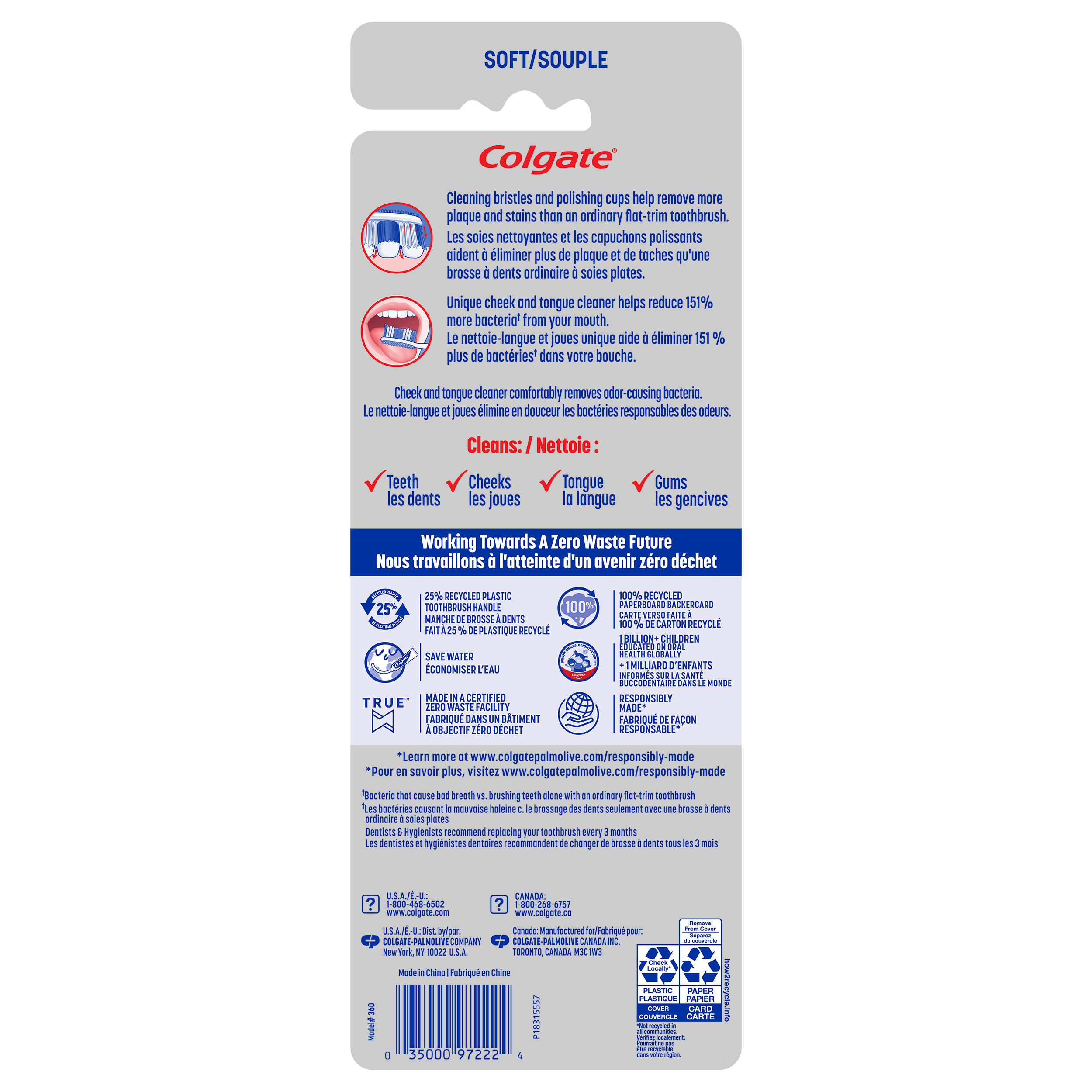 SKU CN08056A Consumer Unit - GTIN 00035000972224 Case - GTIN 10035000972221 Product Category Oral Care Product Sub Category Manual TB Product Equity (Brand) Colgate Product Sub Brand Colgate 360 Man TB Product Title Colgate 360 Whole Mouth Clean Soft toothbrush for adults, 4 p Product Description The Colgate 360 Whole Mouth Clean Soft Toothbrush is an adult manual toothbrush made to clean teeth easily and effortlessly during your brushing session. This soft toothbrush for adults is designed with soft cleaning bristles and polishing cups that help remove plaque and stains with regular brushing. Made to deliver a comfortable and precise brushing experience, this adult toothbrush reaches all areas of your mouth. Plus, a unique tongue and cheek cleaner helps to remove more odor causing bacteria. The result, a healthy oral care routine designed for every type of smile! Brushing your teeth is the foundation of good oral hygiene for a lifelong, healthy smile. With the Colgate 360 Whole Mouth Clean Soft Toothbrush, it meets your brushing needs with an innovative cheek and tongue cleaner that helps reduce 151% more bacteria that causes bad breath as opposed to brushing teeth alone with a regular flat-trim toothbrush. This soft bristle toothbrush also has an ergonomic handle and thumb grip design that allows for precise maneuvering, and it’s made with a 25% recycled plastic handle. For a healthier whole mouth clean* try the Colgate 360 Whole Mouth Clean Soft Toothbrush for Adults. At Colgate, we make products that promote healthy smiles. Not only because having a healthy smile is important to your overall health, but because when you have a healthy smile, you actually smile more – and that’s a powerful thing. Smiles are the simplest form of optimism, something we need now more than ever. That’s why we’re championing optimism – we are committed to creating a healthier planet and working every day to create healthy smiles for all. Everyone has the right to a bright smile. That’s why we’re committed to raising oral healthcare standards everywhere. Whether it’s building healthy new habits as kids or learning something new from the experts, we’re here for you. eCommerce Copy- Long Description The Colgate 360 Whole Mouth Clean Soft Toothbrush is an adult manual toothbrush made to clean teeth easily and effortlessly during your brushing session. This soft toothbrush for adults is designed with soft cleaning bristles and polishing cups that help remove plaque and stains with regular brushing. Made to deliver a comfortable and precise brushing experience, this adult toothbrush reaches all areas of your mouth. Plus, a unique tongue and cheek cleaner helps to remove more odor causing bacteria. The result, a healthy oral care routine designed for every type of smile! Brushing your teeth is the foundation of good oral hygiene for a lifelong, healthy smile. With the Colgate 360 Whole Mouth Clean Soft Toothbrush, it meets your brushing needs with an innovative cheek and tongue cleaner that helps reduce 151% more bacteria that causes bad breath as opposed to brushing teeth alone with a regular flat-trim toothbrush. This soft bristle toothbrush also has an ergonomic handle and thumb grip design that allows for precise maneuvering, and it’s made with a 25% recycled plastic handle. For a healthier whole mouth clean* try the Colgate 360 Whole Mouth Clean Soft Toothbrush for Adults. At Colgate, we make products that promote healthy smiles. Not only because having a healthy smile is important to your overall health, but because when you have a healthy smile, you actually smile more – and that’s a powerful thing. Smiles are the simplest form of optimism, something we need now more than ever. That’s why we’re championing optimism – we are committed to creating a healthier planet and working every day to create healthy smiles for all. Everyone has the right to a bright smile. That’s why we’re committed to raising oral healthcare standards everywhere. Whether it’s building healthy new habits as kids or learning something new from the experts, we’re here for you. Bullet 1 The toothbrush reduces 151% more bacteria (bacteria that cause bad breath vs. brushing teeth alone with an ordinary flat-trim toothbrush). Bullet 2 Cleaning bristles and polishing cups help remove more plaque and stains vs. an ordinary toothbrush Bullet 3 The adult manual toothbrush is designed to reach all areas of your mouth. Bullet 4 A cheek and tongue cleaner helps to remove odor causing bacteria. Bullet 5 An ergonomic handle design provides precise maneuvering when brushing. Bullet 6 Gives the mouth a healthier whole mouth clean (vs. brushing teeth alone with an ordinary flat-trim toothbrush). Bullet 7 The adult toothbrush is made with a 25% recycled plastic handle. Bullet 8 Try the Colgate 360 Whole Mouth Clean Soft Toothbrush for Adults made for every type of smile. Amazon RPC B002YXXZQM AMZ URL https://www.amazon.com/dp/B002YXXZQM CVS RPC 470587