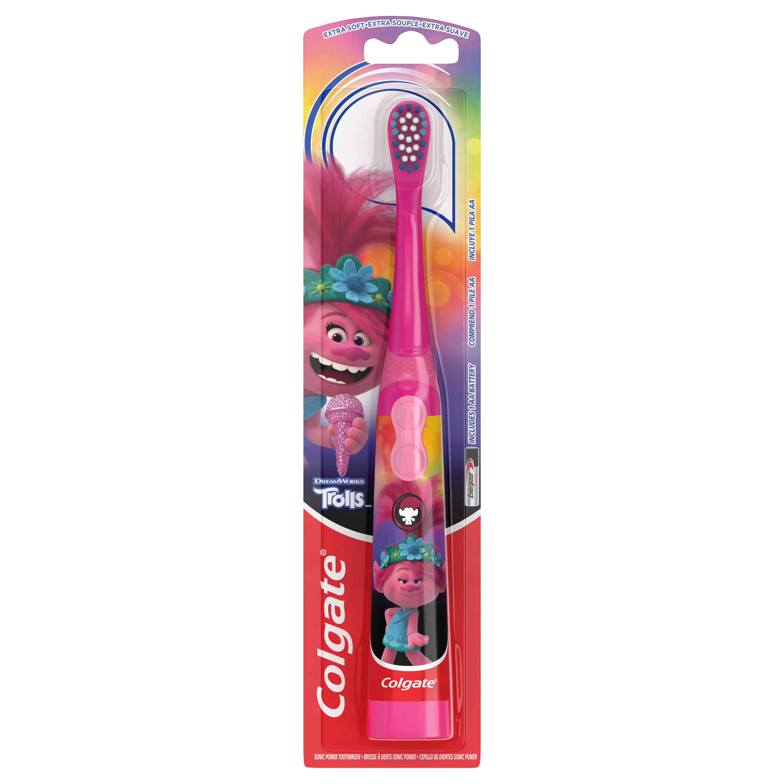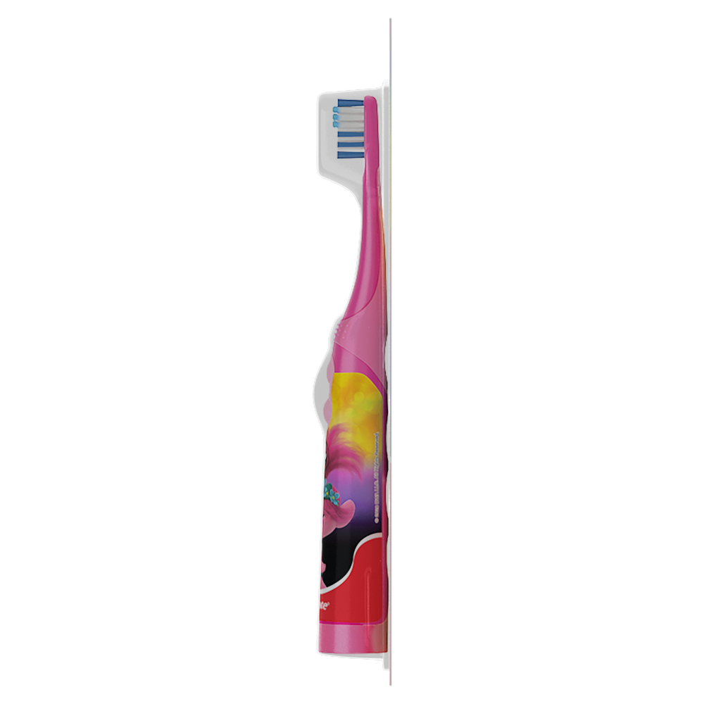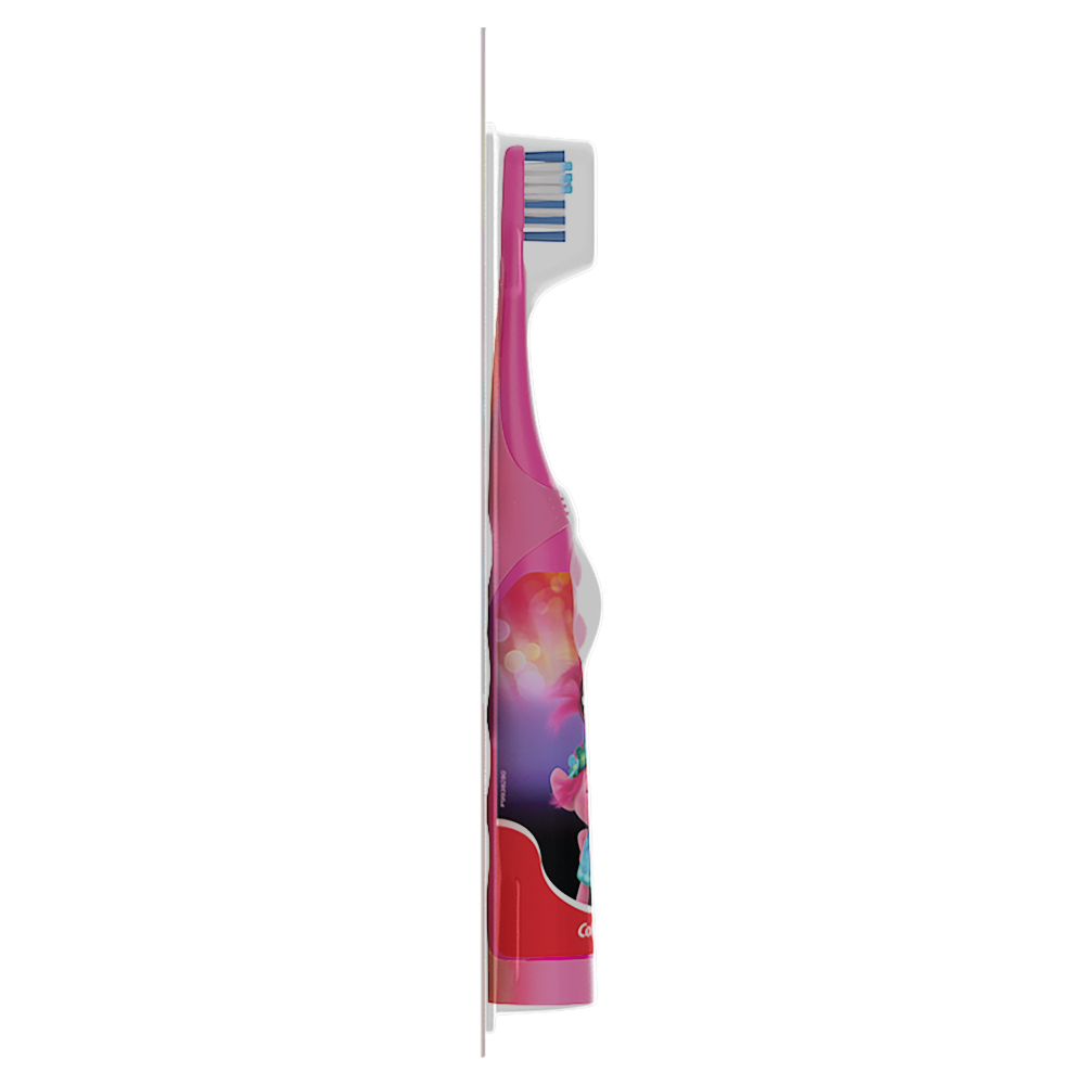SKU CN08079A Consumer Unit - GTIN 00035000974983 Case - GTIN 10035000974980 Product Category Oral Care Product Sub Category Battery TB Product Equity (Brand) Colgate Product Sub Brand Colgate Kids BTB Product Title Colgate Kids Sonic Powered Toothbrush, Trolls Product Description Great clean made fun. Your little one will look forward to brushing more often with the Colgate Kids Battery Powered Toothbrushes. The item is sure to make cleaning those pearly whites more fun. Its unique design features a small, vibrating head with extra-soft bristles and a slim handle that's easy for small hands to hold. This kids battery powered toothbrush lies flat to allow children to easily apply toothpaste. The item is available in different designs to encourage kids to take care of their teeth. eCommerce Copy- Long Description Great clean made fun. Your little one will look forward to brushing more often with the Colgate Kids Battery Powered Toothbrushes. The item is sure to make cleaning those pearly whites more fun. Its unique design features a small, vibrating head with extra-soft bristles and a slim handle that's easy for small hands to hold. This kids battery powered toothbrush lies flat to allow children to easily apply toothpaste. The item is available in different designs to encourage kids to take care of their teeth. Bullet 1 Small Vibrating head with extra soft bristles: Cleans teeth by gently sweeping away plaque. Bullet 2 Kids battery powered toothbrush helps kids brush better Bullet 3 Slim, easy to hold handle for kids Bullet 4 Easy On/Off buttons Bullet 5 Easy n/Off buttons Amazon RPC B088BQ43YR AMZ URL https://www.amazon.com/dp/B088BQ43YR Walmart RPC 54218109 Walmart URL (Computed) https://www.walmart.com/ip/a/54218109 Family Dollar RPC 902125