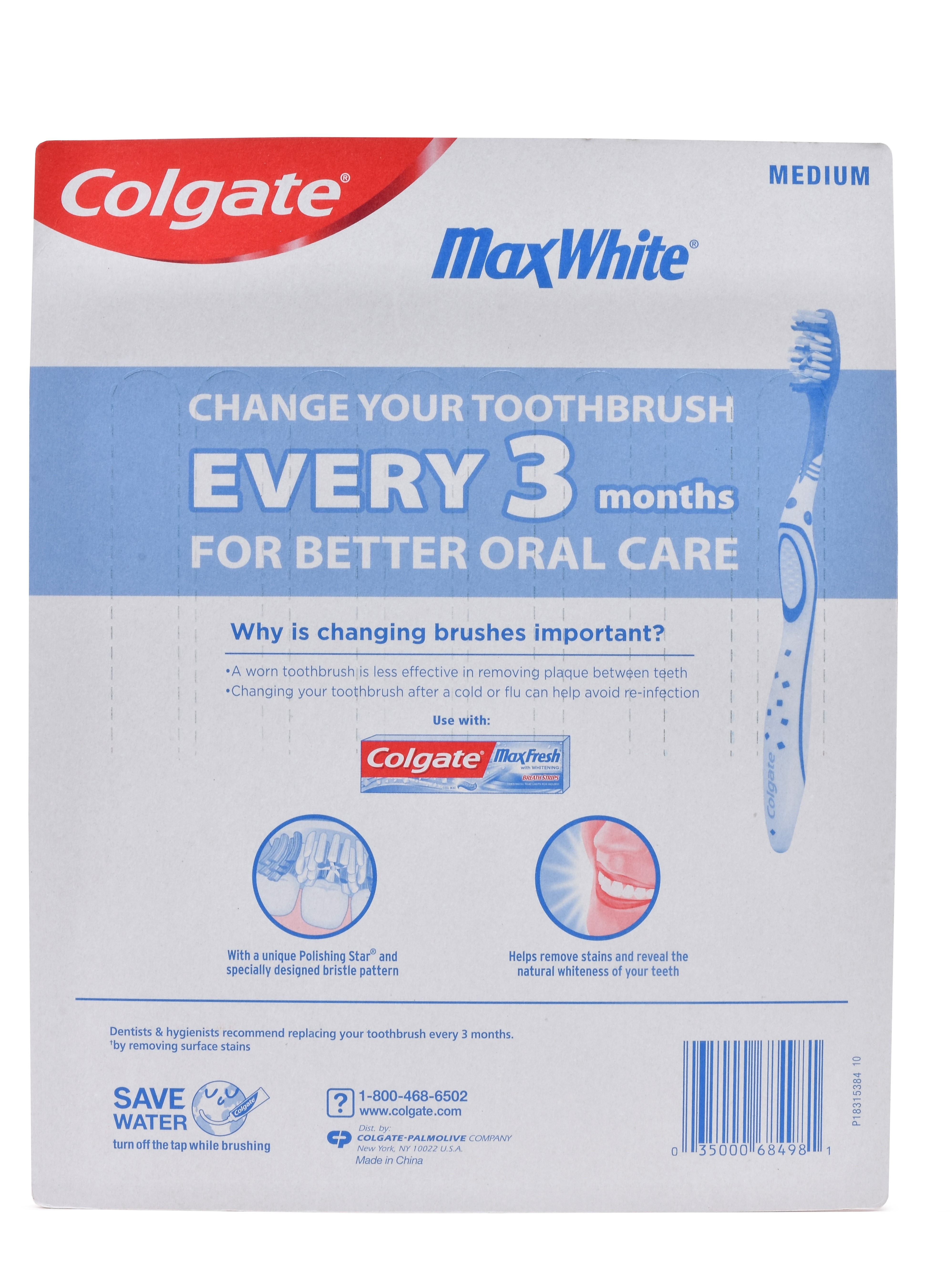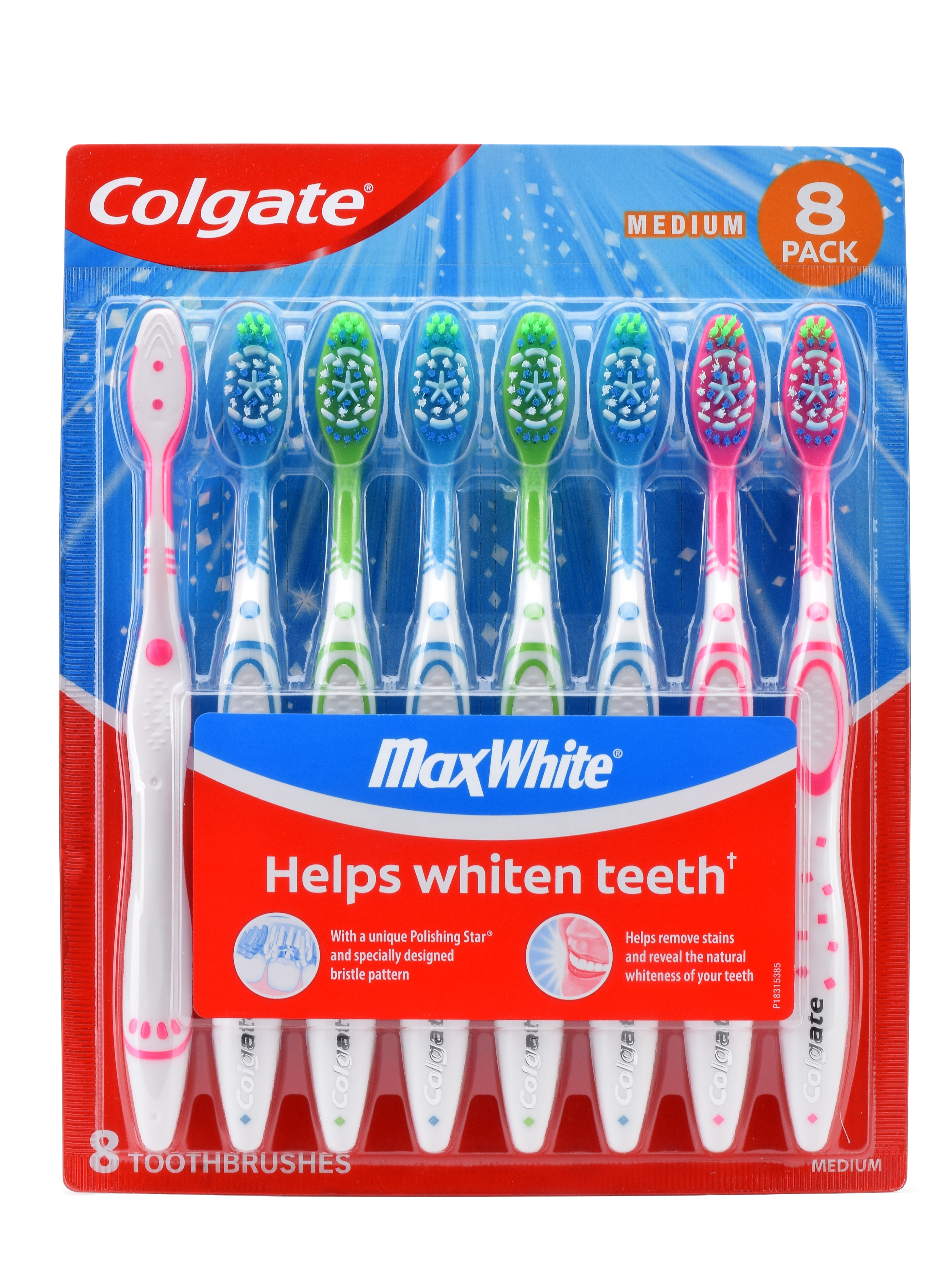 SKU CN08095A Consumer Unit - GTIN 00035000999993 Product Category Oral Care Product Sub Category Manual TB Product Equity (Brand) Colgate Product Sub Brand Colgate Max Man TB Product Title Colgate Max White Toothbrushes, 8 pk. Product Description Colgate Max White Toothbrush is a soft toothbrush designed with a unique Polishing Star® and specially designed bristle patterns. The Polishing Star® helps whiten teeth by removing surface stains. The Colgate Max White Toothbrushes also help to remove stains and reveal the natural whiteness of your teeth. Not only comfortable with an ergonomic handle to allow more control during your brushing routine, the Colgate Max White Toothbrush is also responsibly made.* Made in a zero true waste facility, the Max White toothbrush features a 1% recycled paperboard backercard. These whitening toothbrushes come in different colors for multiple people in a household or for a replenishment. Remember to change your toothbrush every 3 months. eCommerce Copy- Long Description Colgate Max White Toothbrush is a soft toothbrush designed with a unique Polishing Star® and specially designed bristle patterns. The Polishing Star® helps whiten teeth by removing surface stains. The Colgate Max White Toothbrushes also help to remove stains and reveal the natural whiteness of your teeth. Not only comfortable with an ergonomic handle to allow more control during your brushing routine, the Colgate Max White Toothbrush is also responsibly made.* Made in a zero true waste facility, the Max White toothbrush features a 100% recycled paperboard backercard. These whitening toothbrushes come in different colors for multiple people in a household or for a replenishment. Remember to change your toothbrush every 3 months. Bullet 1 With a unique Polishing Star® and specially designed bristle patterns Bullet 2 Polishing Star® helps whiten teeth by removing surface stains Bullet 3 Helps remove stains and reveal the natural whiteness of your teeth Bullet 4 Comfortable, ergonomic handle Bullet 5 Adult toothbrush with soft bristles Bullet 6 Comfortable, ergonomic handle Bullet 7 100% recycled paperboard backercard Bullet 8 Made in a true zero waste facility
