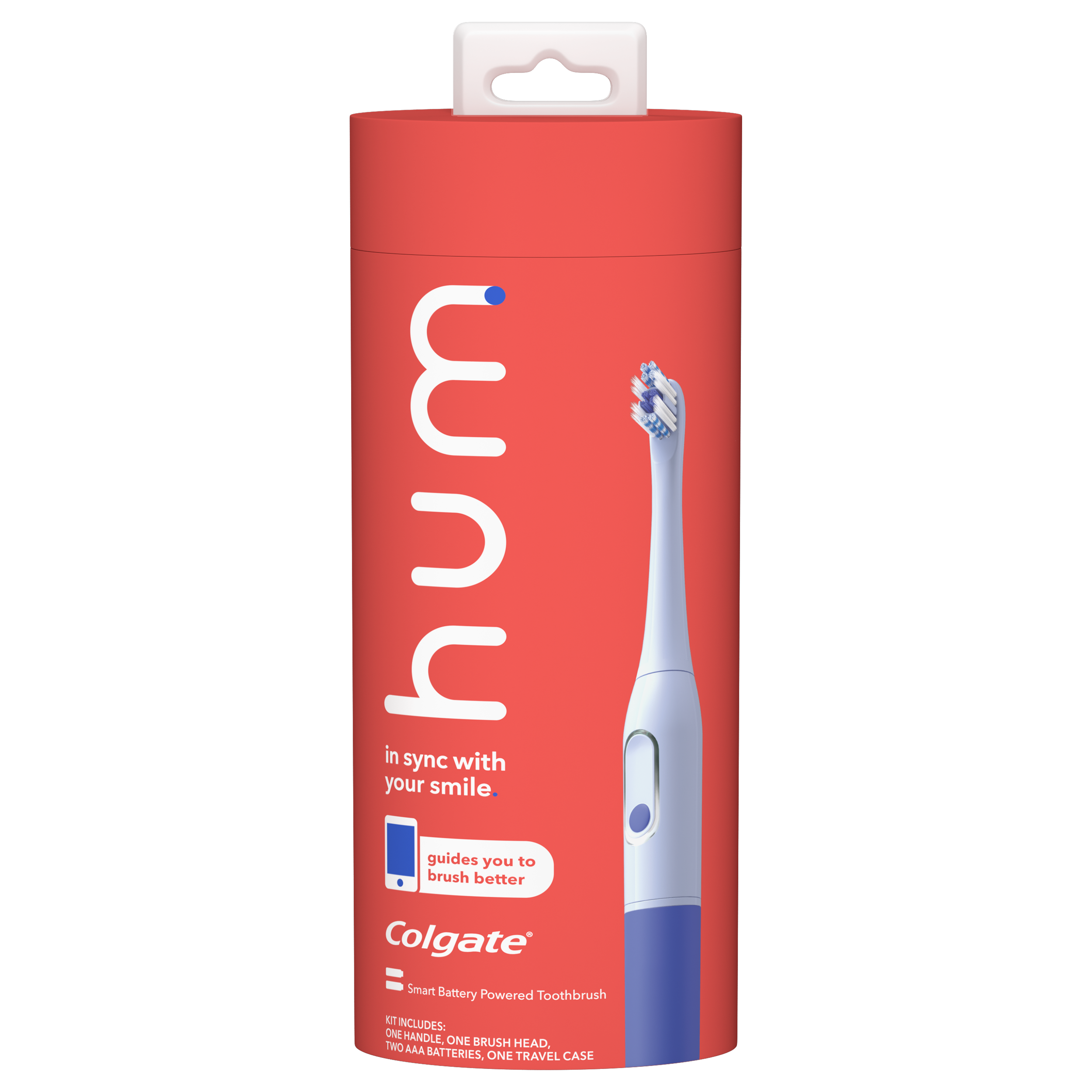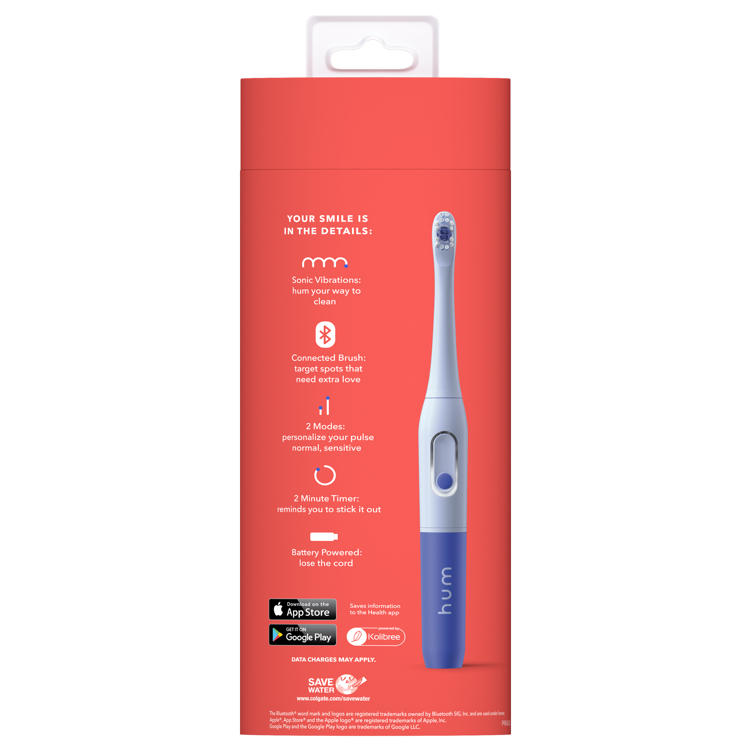 SKU CN08117A Consumer Unit - GTIN 00035000979858 Case - GTIN 10035000979855 Product Category Oral Care Product Sub Category Battery TB Product Equity (Brand) Colgate Product Sub Brand Colgate Connect BTB Product Title Colgate Hum Connected Smart Battery Toothbrush Starter Kit, Blue - 1 Count Product Description The hum by Colgate Smart Battery Operated Toothbrush with bluetooth connectivity guides you to brush better by tracking the frequency, duration, and coverage of your individual brushing style to help you target spots that need extra love. With a brush that knows you and an app that shows you, hum sonic toothbrush makes seriously good oral care something to smile about with fun activities and challenges that help you improve your brushing while you earn points toward rewards. Go beyond the guesswork with our soft bristle toothbrush! eCommerce Copy- Long Description The hum by Colgate Smart Battery Operated Toothbrush with bluetooth connectivity guides you to brush better by tracking the frequency, duration, and coverage of your individual brushing style to help you target spots that need extra love. With a brush that knows you and an app that shows you, hum sonic toothbrush makes seriously good oral care something to smile about with fun activities and challenges that help you improve your brushing while you earn points toward rewards. Go beyond the guesswork with our soft bristle toothbrush! Bullet 1 Includes: 1 battery toothbrush for adults, 2 AAA batteries, 1 carrying case and 1 refill brush head Bullet 2 Smart toothbrush guides you to brush better: Connected, bluetooth toothbrush targets spots that need extra love Bullet 3 Win-win situation: Improve your brushing while earning points toward rewards Bullet 4 Powerful sonic vibrations in 2 modes: Personalize your pulse by choosing the vibration level that suits you; choose from normal or sensitive Bullet 5 Toothbrush with timer: Reminds you to stick it out for 2 minutes Bullet 6 Battery powered toothbrush: Lose the cord (2 AAA batteries included) Bullet 7 Expert-designed handle: Your hand won't want to let go Bullet 8 Replaceable soft toothbrush head: Keep brush heads as fresh as your mouth Walmart RPC 168745043 Walmart URL (Computed) https://www.walmart.com/ip/a/168745043