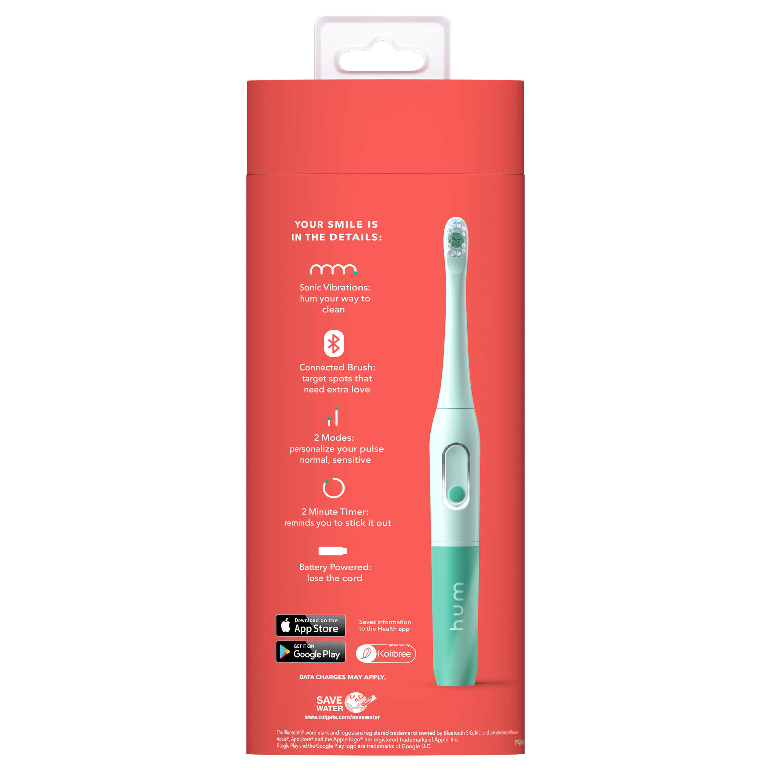 SKU CN08118A Consumer Unit - GTIN 00035000979780 Case - GTIN 10035000979787 Product Category Oral Care Product Sub Category Battery TB Product Equity (Brand) Colgate Product Sub Brand Colgate Connect BTB Product Title hum by Colgate Smart Battery Toothbrush Kit, Sonic Toothbrush with Travel Case, Teal Product Description The hum by Colgate Smart Battery Operated Toothbrush with bluetooth connectivity guides you to brush better by tracking the frequency, duration, and coverage of your individual brushing style to help you target spots that need extra love. With a brush that knows you and an app that shows you, hum sonic toothbrush makes seriously good oral care something to smile about with fun activities and challenges that help you improve your brushing while you earn points toward rewards. Go beyond the guesswork with our soft bristle toothbrush! eCommerce Copy- Long Description The hum by Colgate Smart Battery Operated Toothbrush with bluetooth connectivity guides you to brush better by tracking the frequency, duration, and coverage of your individual brushing style to help you target spots that need extra love. With a brush that knows you and an app that shows you, hum sonic toothbrush makes seriously good oral care something to smile about with fun activities and challenges that help you improve your brushing while you earn points toward rewards. Go beyond the guesswork with our soft bristle toothbrush! Bullet 1 Includes: 1 battery toothbrush for adults, 2 AAA batteries, 1 carrying case and 1 refill brush head Bullet 2 Smart toothbrush guides you to brush better: Connected, bluetooth toothbrush targets spots that need extra love Bullet 3 Win-win situation: Improve your brushing while earning points toward rewards Bullet 4 Powerful sonic vibrations in 2 modes: Personalize your pulse by choosing the vibration level that suits you; choose from normal or sensitive Bullet 5 Powerful sonic vibrations in 2 modes: Personalize your pulse by choosing the vibration level that suits you; choose from normal or sensitive Bullet 6 "Battery powered toothbrush: Lose the cord (2 AAA batteries included)" Bullet 7 Expert-designed handle: Your hand won't want to let go Bullet 8 Replaceable soft toothbrush head: Keep brush heads as fresh as your mouth Walmart RPC 829557789 Walmart URL (Computed) https://www.walmart.com/ip/a/829557789