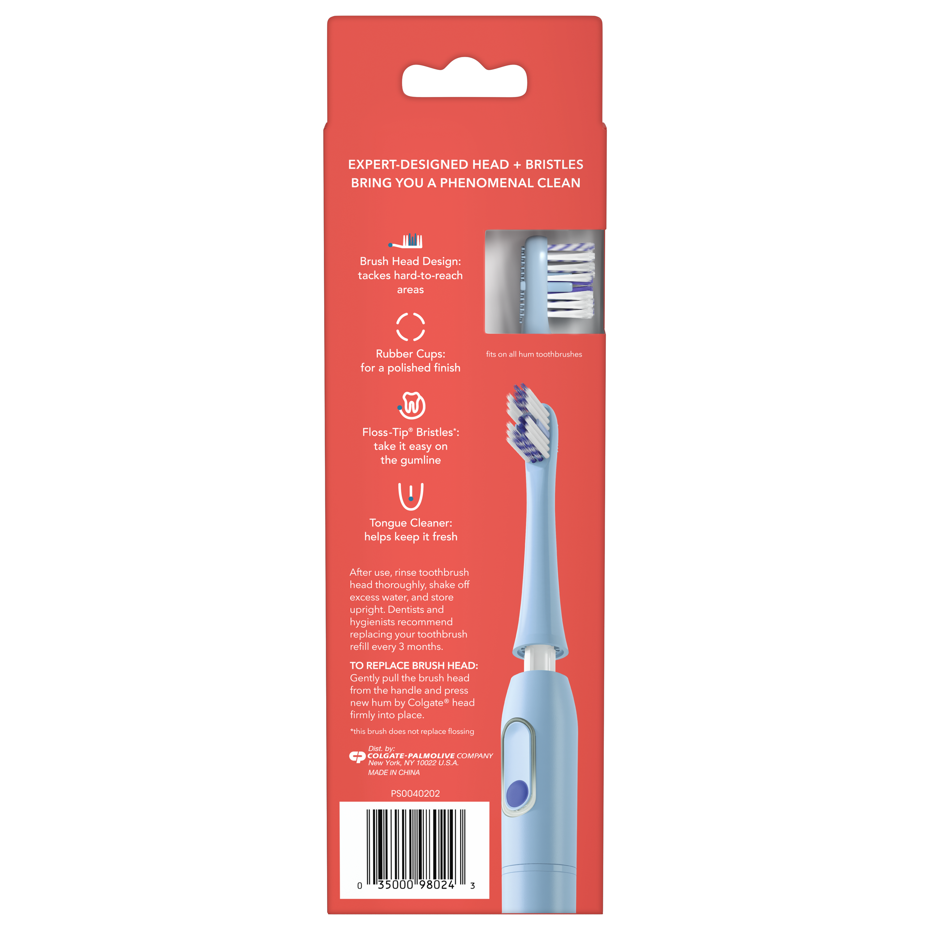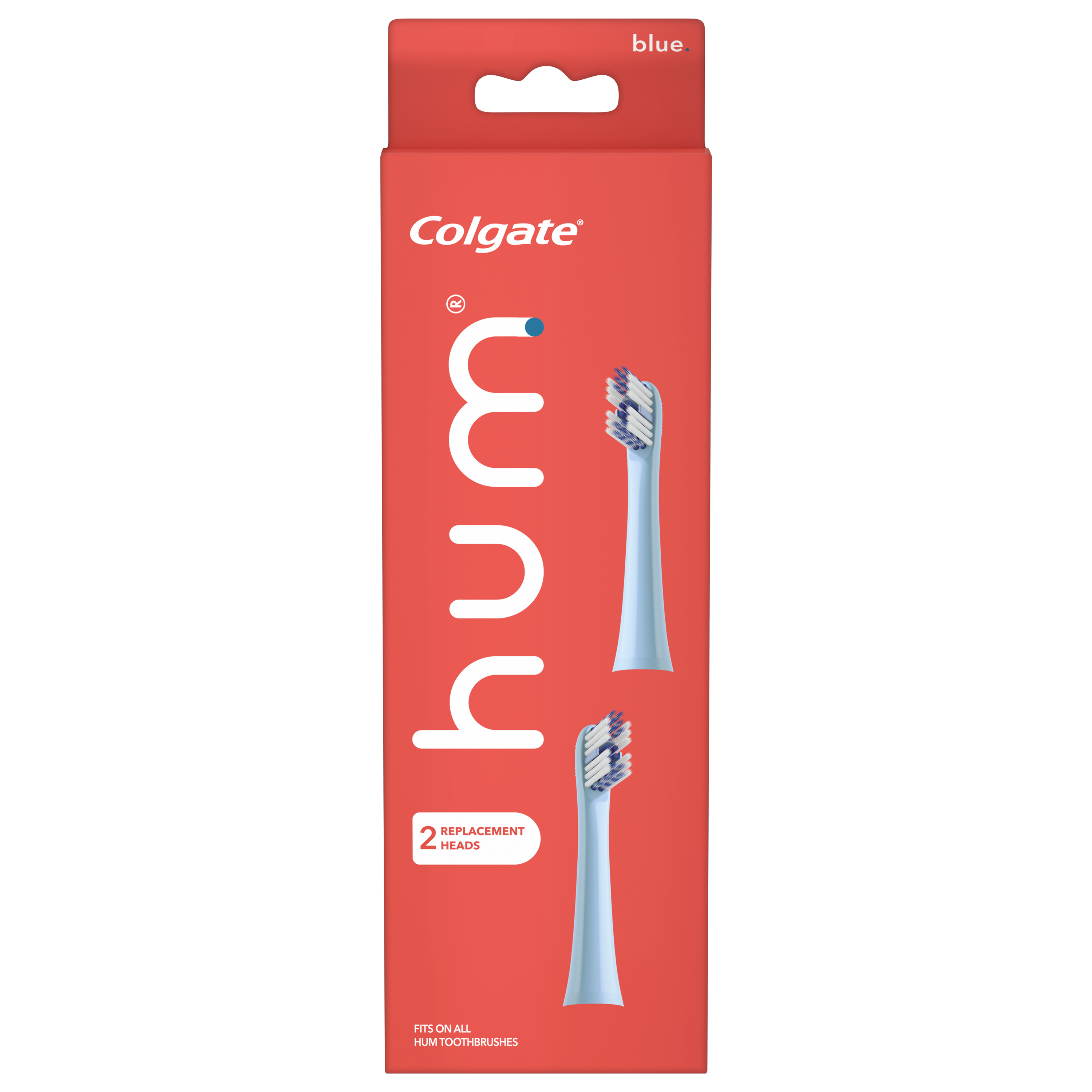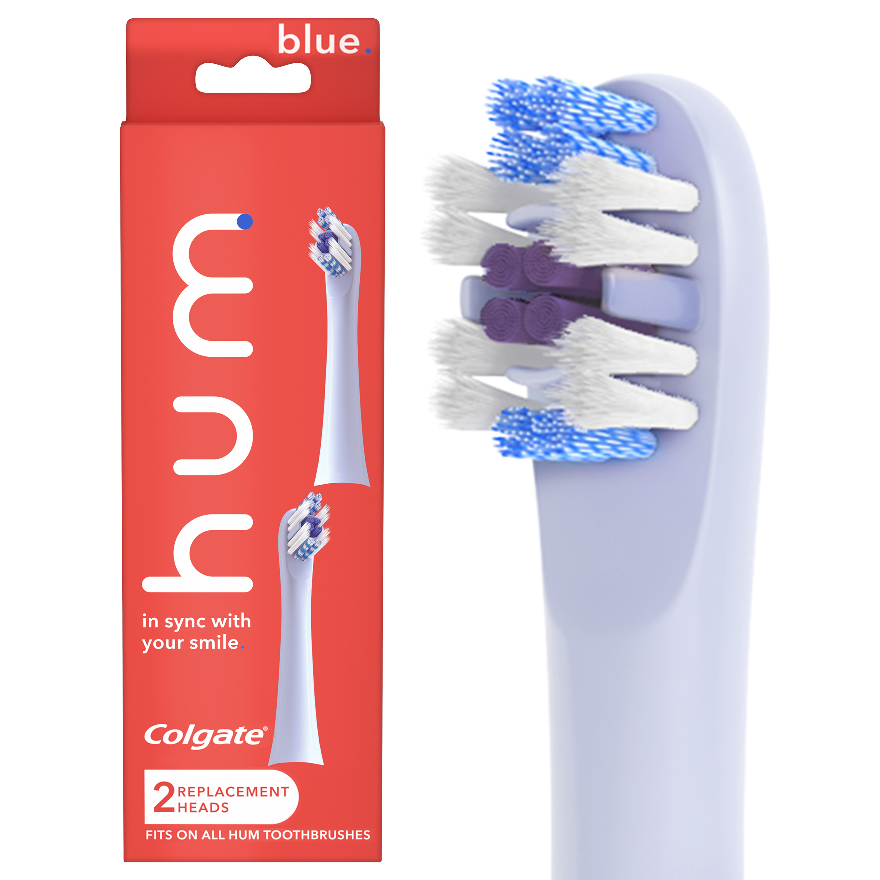 SKU CN08132A Consumer Unit - GTIN 00035000980243 Case - GTIN 10035000980240 Product Category Oral Care Product Sub Category Battery TB Product Equity (Brand) Colgate Product Sub Brand Colgate Connect BTB Product Title Hum by Colgate Replacement Toothbrush Heads for Smart Toothbrush, Blue 2pk Product Description "Hum by Colgate Replacement Toothbrush Heads for Smart Toothbrush, Blue 2pk The hum by Colgate Replacement Toothbrush Heads are designed by experts to give you a phenomenal clean. This compact brush head tackles hard-to-reach areas as well as features soft floss-tip** bristles that are gentle on gums, rubber cups that polish, and a tongue cleaner that helps keep your mouth fresh. Hum by Colgate Smart Electric Toothbrush with a Connected App With a brush that knows you and an app that shows you, hum combines the power of a sonic toothbrush with the connectivity of a smart toothbrush. Download the personalized brushing app and connect to get a better brushing routine for a cleaner smile.* Track the duration and frequency of your brushing in the app while earning points towards rewards. Replacement Toothbrush Heads for Smart Toothbrush This replacement toothbrush heads pack comes with two expert-designed toothbrush replacement heads and patented bristle technology to give you a phenomenal clean. Keep brush heads as fresh as your mouth by replacing them every 3 months as recommended by dentists and hygienists. Electric toothbrush replacement heads fit on all hum adult toothbrushes. Designed by the Experts at Colgate The hum by Colgate Smart Rhythm sonic battery toothbrush is designed by the experts. At Colgate, we know the power of a healthy smile and that’s why we created hum - so you can brush better for a cleaner smile. *versus brushing without an app **vs a manual toothbrush **this toothbrush does not replace flossing " eCommerce Copy- Long Description hum by Colgate Smart Toothbrush Replacement Heads are designed by experts for a phenomenal clean. These sonic toothbrush replacement heads are designed to help you tackle hard-to-reach areas and features floss-tip bristles that take it easy on your gumline, rubber cups that polish, and a tongue cleaner that helps keep it fresh. Electric toothbrush replacement heads fit on all hum adult toothbrushes. Bullet 2 Expert-designed toothbrush replacement heads and patented bristle technology that give you a phenomenal clean Bullet 3 Hum replacement heads feature a brush head design that tackles hard-to-reach areas Bullet 4 The extra soft bristles, powered by Floss-Tip ®* technology, offer a gentle clean (*this toothbrush does not replace flossing) Bullet 5 Each replacement brush head includes rubber cups that offer a polished finish and a tongue cleaner to help keep your mouth fresh Bullet 6 Hum replacement heads are available in five colors: Blue, teal, purple, gray, and black Bullet 7 Hum replacement brush heads are intended for ages eight and older Keep brush heads as fresh as your mouth by replacing them every 3 months as recommended by dentists and hygienists Amazon RPC B089FC7BMP AMZ URL https://www.amazon.com/dp/B089FC7BMP Walmart RPC 550413406 Walmart URL (Computed) https://www.walmart.com/ip/a/550413406 Target RPC 79700054 Target URL https://www.target.com/p/a/-/A-79700054 CVS RPC 380813
