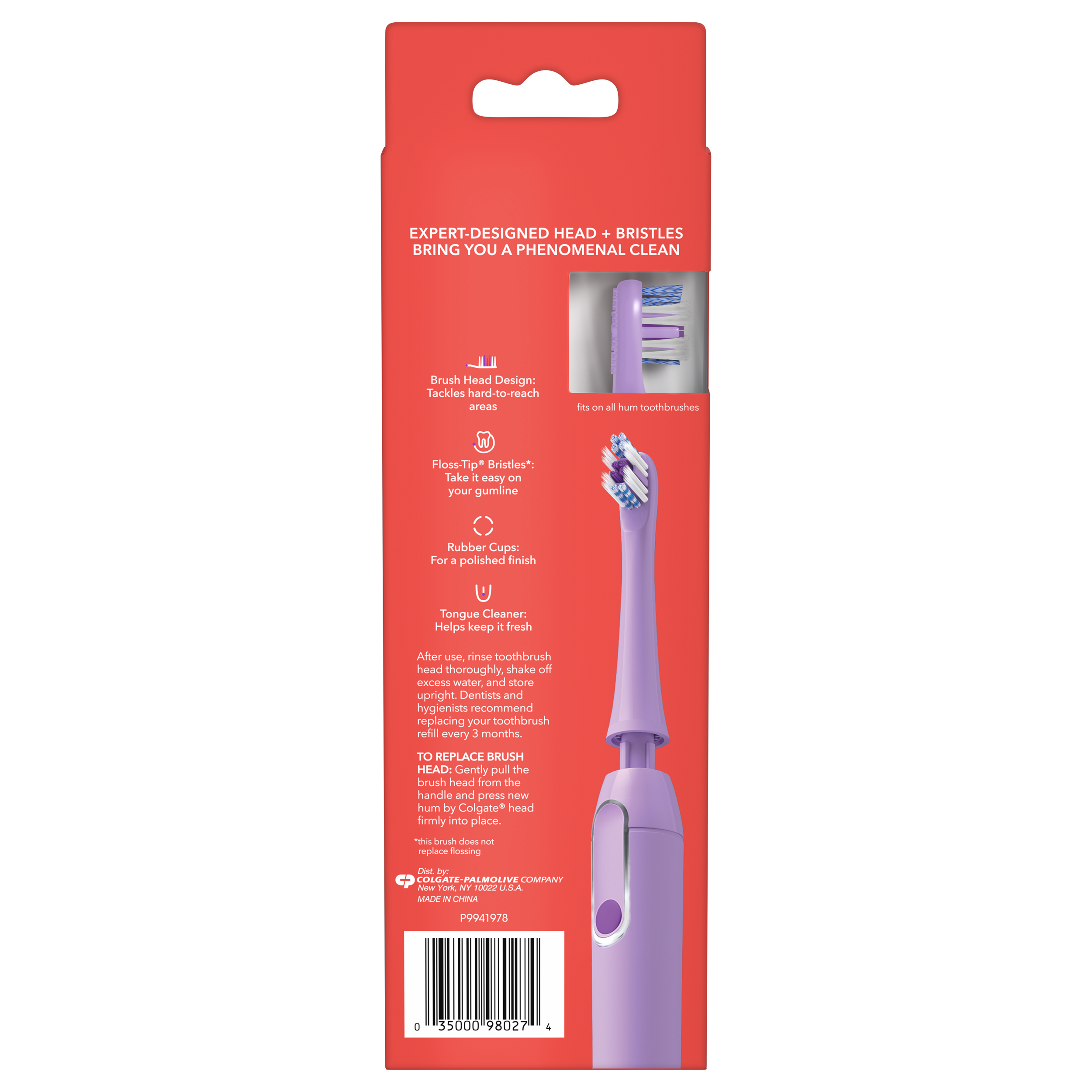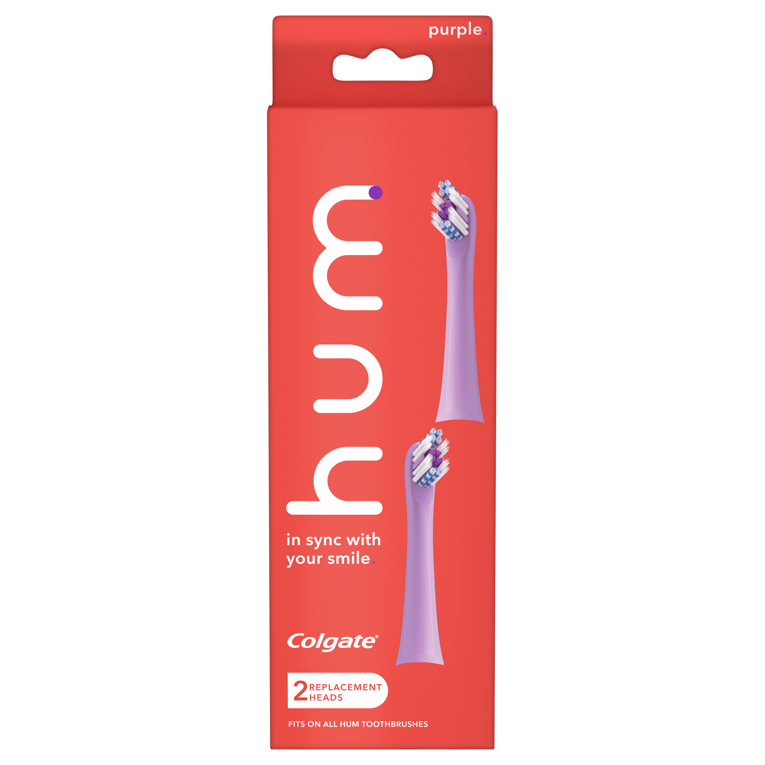 SKU CN08134A Consumer Unit - GTIN 00035000980274 Case - GTIN 10035000980271 Product Category Oral Care Product Sub Category Battery TB Product Equity (Brand) Colgate Product Sub Brand Colgate Connect BTB Product Title Hum by Colgate Replacement Toothbrush Heads for Smart Toothbrush, Purple 2pk Product Description "Hum by Colgate Replacement Toothbrush Heads for Smart Toothbrush, Purple 2pk The hum by Colgate Replacement Toothbrush Heads are designed by experts to give you a phenomenal clean. This compact brush head tackles hard-to-reach areas as well as features soft floss-tip** bristles that are gentle on gums, rubber cups that polish, and a tongue cleaner that helps keep your mouth fresh. Hum by Colgate Smart Electric Toothbrush with a Connected App With a brush that knows you and an app that shows you, hum combines the power of a sonic toothbrush with the connectivity of a smart toothbrush. Download the personalized brushing app and connect to get a better brushing routine for a cleaner smile.* Track the duration and frequency of your brushing in the app while earning points towards rewards. Replacement Toothbrush Heads for Smart Toothbrush This replacement toothbrush heads pack comes with two expert-designed toothbrush replacement heads and patented bristle technology to give you a phenomenal clean. Keep brush heads as fresh as your mouth by replacing them every 3 months as recommended by dentists and hygienists. Electric toothbrush replacement heads fit on all hum adult toothbrushes. Designed by the Experts at Colgate The hum by Colgate Smart Rhythm sonic battery toothbrush is designed by the experts. At Colgate, we know the power of a healthy smile and that’s why we created hum - so you can brush better for a cleaner smile. *versus brushing without an app **vs a manual toothbrush **this toothbrush does not replace flossing " eCommerce Copy- Long Description hum by Colgate Smart Toothbrush Replacement Heads are designed by experts for a phenomenal clean. These sonic toothbrush replacement heads are designed to help you tackle hard-to-reach areas and features floss-tip bristles that take it easy on your gumline, rubber cups that polish, and a tongue cleaner that helps keep it fresh. Electric toothbrush replacement heads fit on all hum adult toothbrushes. Bullet 2 Expert-designed toothbrush replacement heads and patented bristle technology that give you a phenomenal clean Bullet 3 Hum replacement heads feature a brush head design that tackles hard-to-reach areas Bullet 4 The extra soft bristles, powered by Floss-Tip ®* technology, offer a gentle clean (*this toothbrush does not replace flossing) Bullet 5 Each replacement brush head includes rubber cups that offer a polished finish and a tongue cleaner to help keep your mouth fresh Bullet 6 Hum replacement heads are available in five colors: Blue, teal, purple, gray, and black Bullet 7 Hum replacement brush heads are intended for ages eight and older Keep brush heads as fresh as your mouth by replacing them every 3 months as recommended by dentists and hygienists Amazon RPC B089FD4HWX AMZ URL https://www.amazon.com/dp/B089FD4HWX Walmart RPC 909232544 Walmart URL (Computed) https://www.walmart.com/ip/a/909232544
