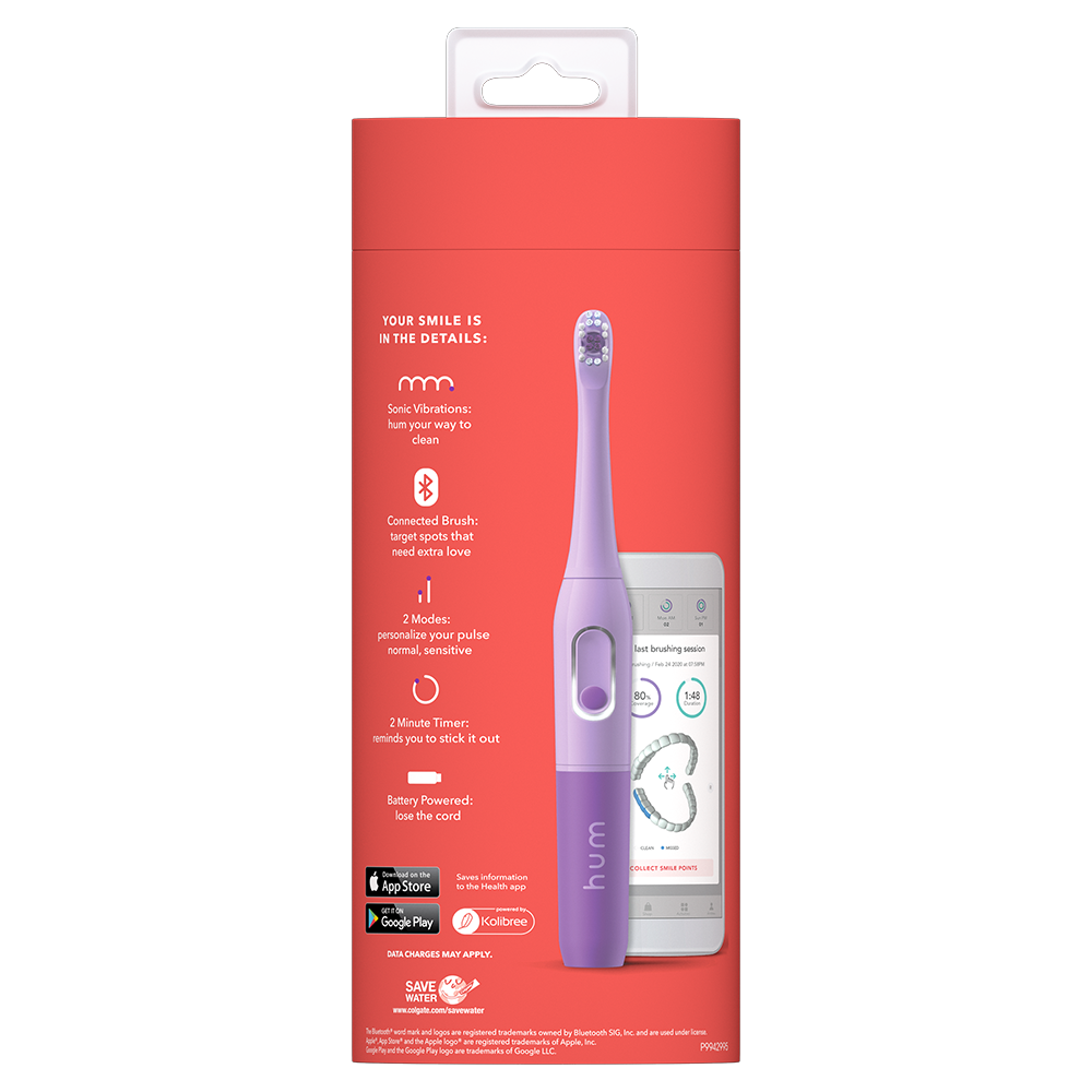 SKU CN08173A Consumer Unit - GTIN 00035000981790 Case - GTIN 10035000981797 Product Category Oral Care Product Sub Category Battery TB Product Equity (Brand) Colgate Product Sub Brand Colgate Connect BTB Product Title Colgate Hum Connected Smart Battery Toothbrush Starter Kit Ecomm, Purple - 1 Count