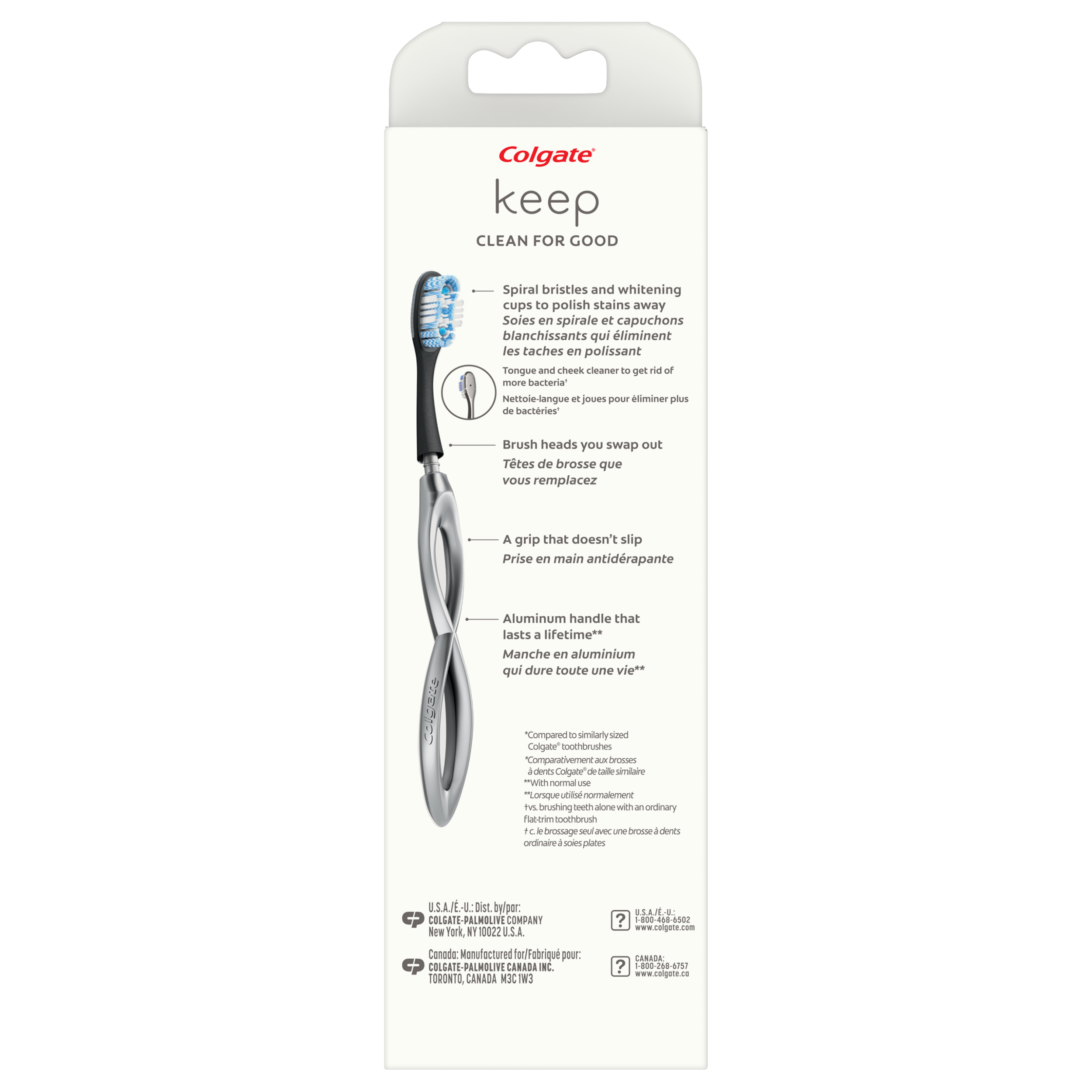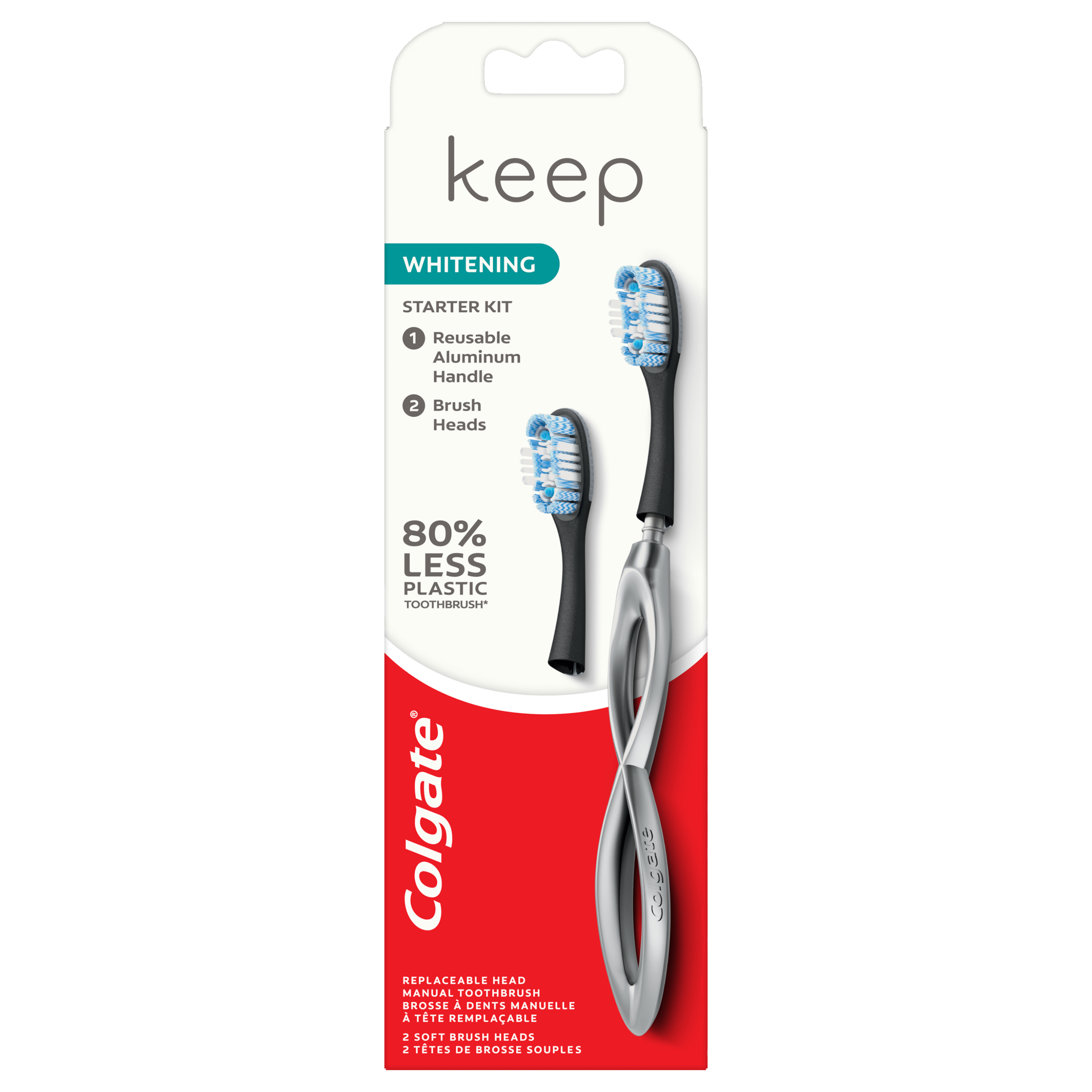 SKU CN08177A Consumer Unit - GTIN 00035000981998 Case - GTIN 10035000981995 Product Category Oral Care Product Sub Category Manual TB Product Equity (Brand) Colgate Product Sub Brand Colgate Ultra Soft Manual TB Product Title Colgate Keep Manual Toothbrush Whitening Starter Kit - Silver Product Description Less plastic waste—more clean! Colgate® Keep is a replaceable head manual toothbrush for 8% less plastic*. Spiral bristles and whitening cups polish stains away for a bright smile. Plus, our unique tongue and cheek cleaner helps get rid of more bacteria**. Colgate® Keep has a long-lasting and lightweight aluminum handle with a grip that doesn’t slip for control while brushing. * Compared to similarly sized Colgate toothbrushes **vs. brushing teeth alone with an ordinary flat-trim toothbrush Bullet 1 Replaceable head manual toothbrush for 80% less plastic*. *Compared to similarly sized Colgate toothbrushes Bullet 2 Spiral bristles and whitening cups to polish stains away for a bright smile Bullet 3 A grip that doesn’t slip for control while brushing Bullet 4 Cleans teeth, tongue, cheeks and gums Bullet 5 Long-lasting and lightweight aluminum handle Bullet 6 Two toothbrush replacement heads Bullet 7 Recyclable toothbrush handle and packaging Amazon RPC B08QRRVDL4 AMZ URL https://www.amazon.com/dp/B08QRRVDL4 Walmart RPC 267354880 Walmart URL (Computed) https://www.walmart.com/ip/a/267354880