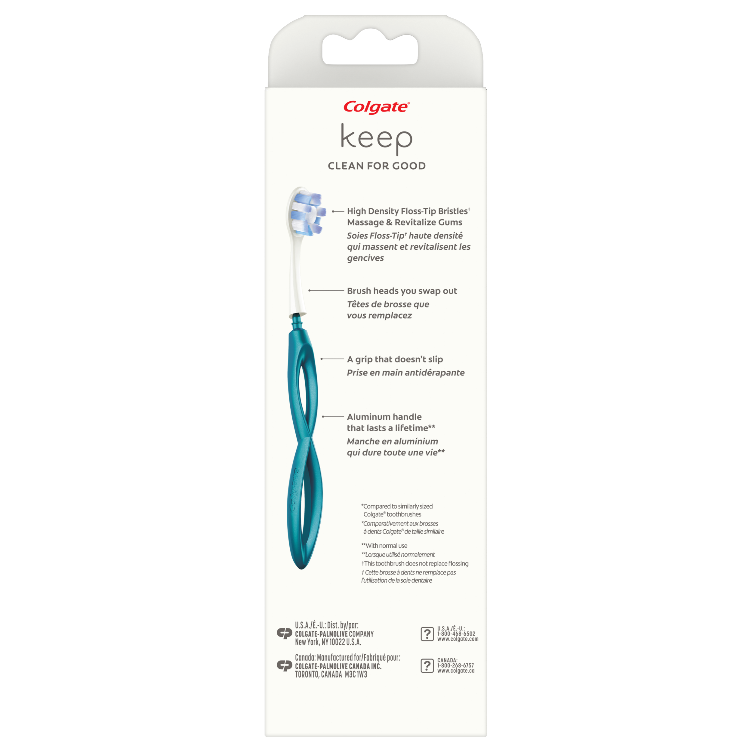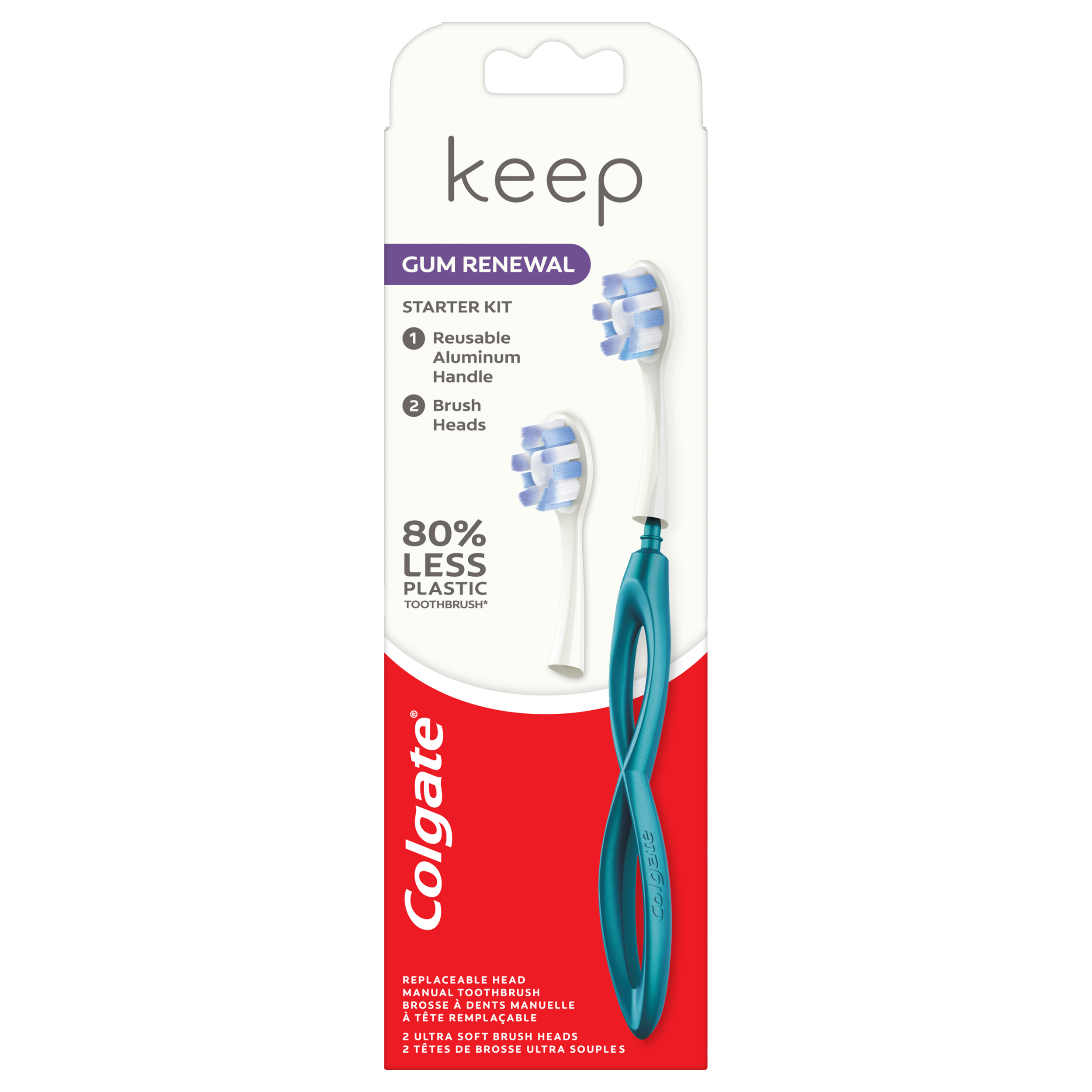SKU CN08179A Consumer Unit - GTIN 00035000982032 Case - GTIN 10035000982039 Product Category Oral Care Product Sub Category Manual TB Product Equity (Brand) Colgate Product Sub Brand Colgate Keep Man TB Product Title Colgate Keep Gum Renewal Toothbrush Starter Kit, with Handle and 2 Refills Heads Product Description Brush better.* Less waste. Colgate Keep is an 8% less plastic toothbrush** that has a reusable aluminum handle that lasts a lifetime*** and swappable brush heads. This starter kit includes 1 toothbrush handle and 2 Gum Renewal toothbrush refill brush heads, which have extra soft, high density floss-tip bristles† that massage and revitalize gums. *vs. brushing teeth alone with an ordinary flat-trim toothbrush **compared to similarly sized Colgate toothbrushes ***with normal use †this toothbrush does not replace flossing Bullet 1 Colgate Keep Toothbrush Starter Kit includes 1 handle and 2 refill heads, Charcoal Bullet 2 Charcoal-infused floss-tip bristles† Bullet 3 Aluminum handle that lasts a lifetime*** Bullet 4 A grip that doesn't slip Bullet 5 Brush heads you swap out Bullet 6 80% Less Plastic Toothbrush* Bullet 7 †This toothbrush does not replace flossing Bullet 8 ‡Below the gumline compared to an ordinary flat trim toothbrush Bullet 9 *Compared to similarly sized Colgate toothbrushes Amazon RPC B09MWMVJBW AMZ URL https://www.amazon.com/dp/B09MWMVJBW