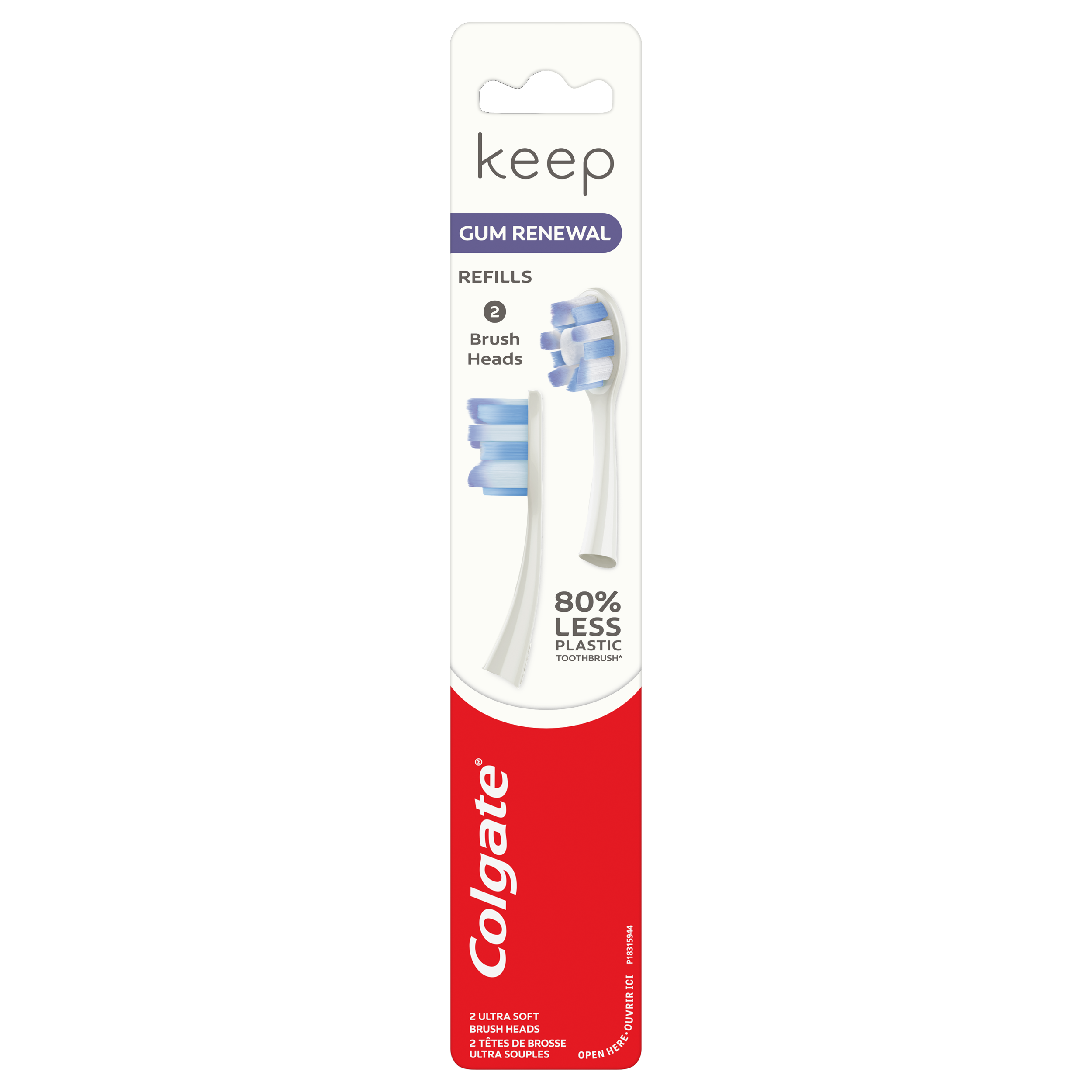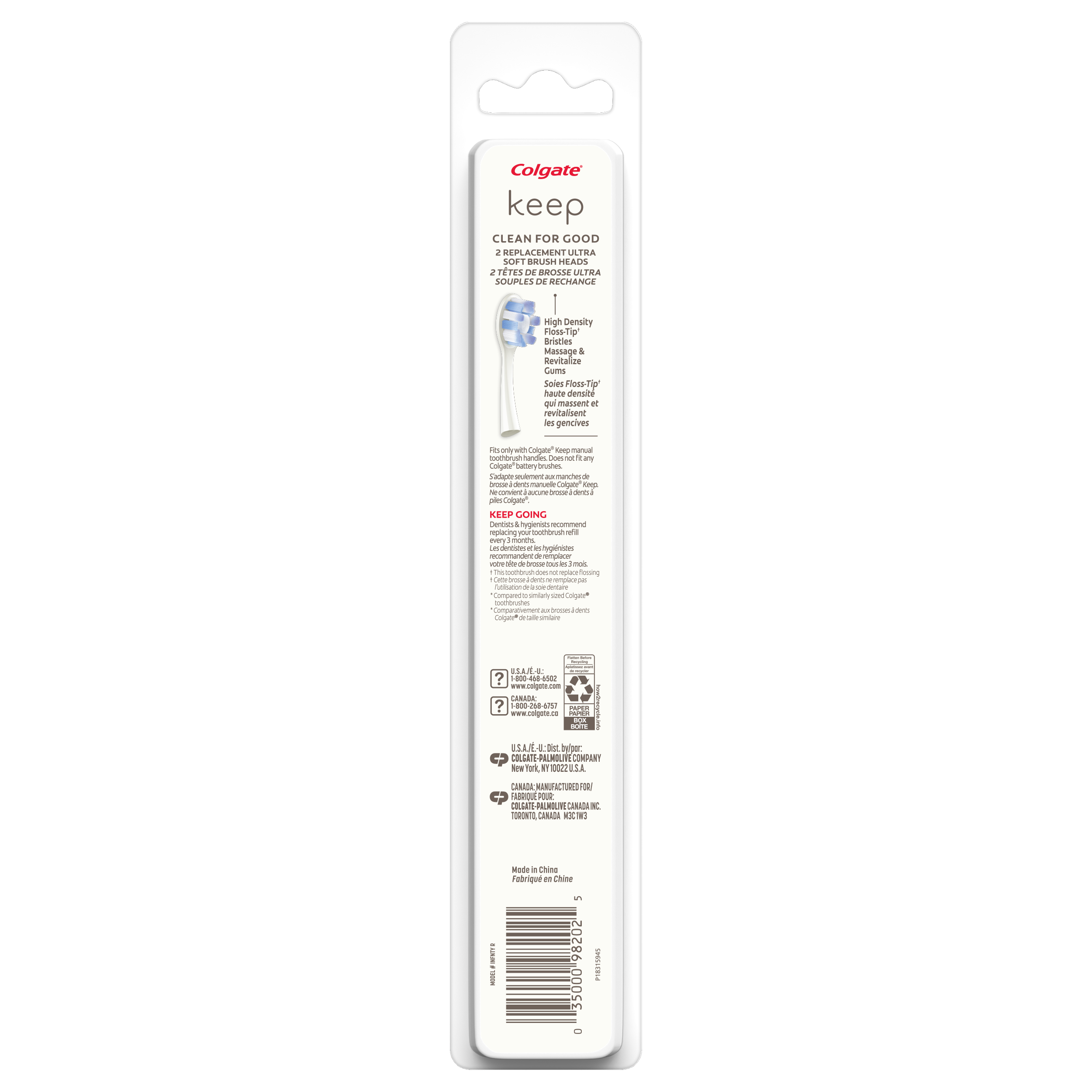 SKU CN08185A Consumer Unit - GTIN 00035000982025 Case - GTIN 10035000982022 Product Category Oral Care Product Sub Category Manual TB Product Equity (Brand) Colgate Product Sub Brand Colgate Keep Man TB Product Title Colgate Keep Toothbrush Refill Heads, Gum Renewal, 2 Pack Product Description Brush better.* Less waste. Colgate Keep is an 8% less plastic toothbrush** that has a reusable aluminum handle and swappable brush heads. Stock up with this pack of 2 Gum Renewal toothbrush refill brush heads, which have extra soft, high density floss-tip bristles† that massage and revitalize gums. This pack of 2 replacement brush heads fits the Colgate Keep toothbrush handle, sold separately. *vs. brushing teeth alone with an ordinary flat-trim toothbrush **compared to similarly sized Colgate toothbrushes †this toothbrush does not replace flossing Bullet 1 Pack of 2 Colgate Keep Toothbrush Refill Heads, Gum Renewal Bullet 2 Extra soft high density floss-tip bristles† massage & revitalize gums Bullet 3 Fits only with Colgate Keep manual toothbrush handles Bullet 4 80% Less Plastic Toothbrush* Bullet 5 †This toothbrush does not replace flossing Bullet 6 *Compared to similarly sized Colgate toothbrushes