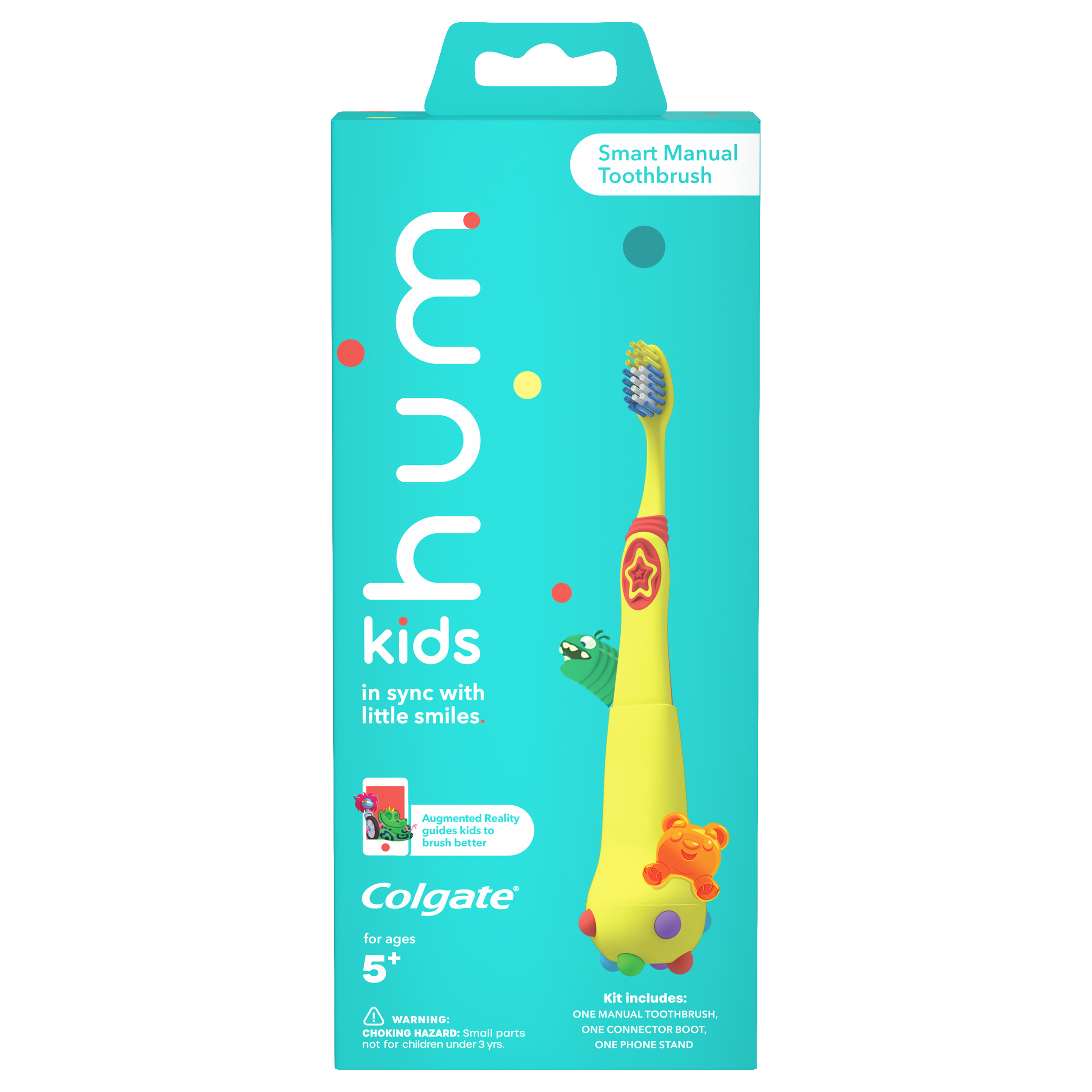 SKU CN08189A Consumer Unit - GTIN 00035000982339 Case - GTIN 10035000982336 Product Category Oral Care Product Sub Category Manual TB Product Equity (Brand) Colgate Product Sub Brand Colgate Connect Kids Man TB Product Title hum kids by Colgate Smart Manual Toothbrush Set, Yellow Product Description The hum kids by Colgate Smart Manual Kids Toothbrush uses Augmented Reality to guide kids to brush better. Game experiences make brushing fun, while helping your child learn good lifelong brushing habits. Parents can track your child's progress and easily check if kids missed a spot or brushing session on the parents section. This extra soft toothbrush for kids is recommended for kids ages 5+. Bullet 1 Starter Kit includes: 1 manual kids toothbrush, 1 connector boot and a phone stand Bullet 2 Smart toothbrush uses Augmented Reality to guide kids to brush better Bullet 3 Fun gaming experience inspires kids to brush to unlock new worlds and earn rewards. Bullet 4 App teaches kids where and how to brush helping your child establish good lifelong brushing habits. Bullet 5 Track your child's progress and easily check whether your child missed a spot or an entire brushing session via the parents section Bullet 6 Rewards good brushing by unlocking new levels and game experiences as your child brushes Bullet 7 Kid-friendly brush size: small head for easy access to a child's mouth Bullet 8 Replaceable extra soft toothbrushes: Replace the gentle and effective toothbrushes to keep them as fresh as your child's mouth. Amazon RPC B08QRQJXTP AMZ URL https://www.amazon.com/dp/B08QRQJXTP
