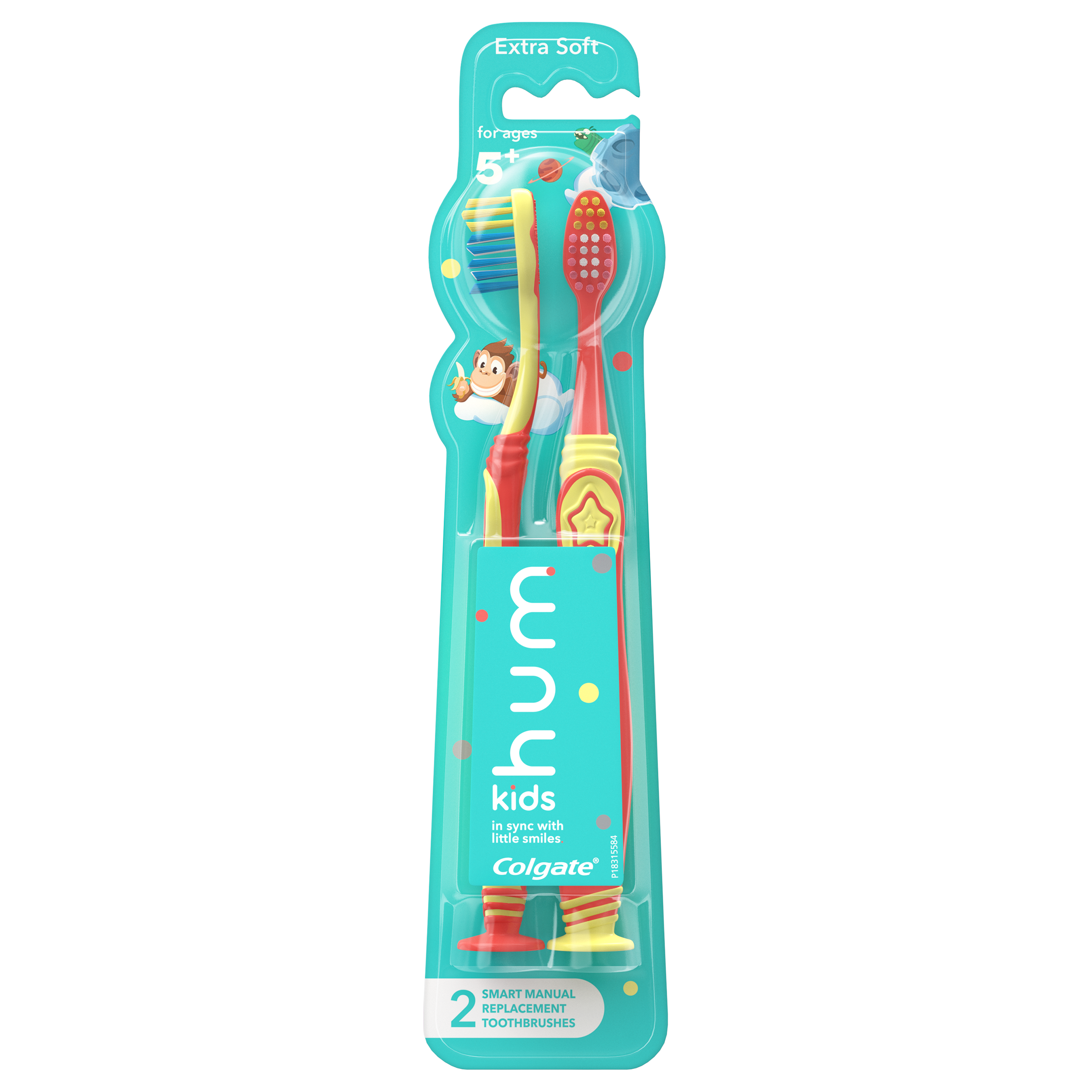 SKU CN08208A Consumer Unit - GTIN 00035000985446 Case - GTIN 10035000985443 Product Category Oral Care Product Sub Category Manual TB Product Equity (Brand) Colgate Product Sub Brand Colgate Connect Kids Man TB Product Title hum kids by Colgate Smart Manual Replacement Toothbrush Pack, Yellow & Coral - 2 Count Product Description hum kids by Colgate Smart Manual Replacement Toothbrushes are designed with Extra Soft bristles for a gentle and effective clean. Brushes feature a tongue cleaner to help keep it fresh, a thumb grip for easy handling, and a suction cup for easy and fun upright storage. Manual replacement brushes are compatible with the hum kids connector boot. Recommended for kids ages 5+ Bullet 1 Replacement Manual Toothbrushes compatible with hum kids connector boot Bullet 2 Extra Soft Bristles: For a gentle and effective clean Bullet 3 Tongue Cleaner: Helps keep it fresh Bullet 4 Thumb Grip: Specially designed for easy handling Bullet 5 Suction cup: Easy and fun upright storage Bullet 6 Available in two colors to help tell your kids' brushes apart