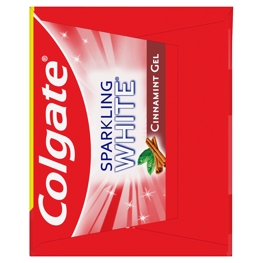 SKU MX03548A Consumer Unit - GTIN 00035000444400 Case - GTIN 10035000444407 Product Category Oral Care Product Sub Category Toothpaste Product Equity (Brand) Colgate Product Sub Brand Colgate Sparkling TP Product Title Colgate Sparkling White Whitening Toothpaste, Cinnamon - 2.5 ounce + 6% Free Product Description Colgate Sparkling White Whitening Toothpaste, with a great Cinnamint flavor, is formulated with cinnamon and mint flavors that will invigorate your mouth. This stain protection formula whitens teeth and helps prevent stain build-up. Our whitening toothpaste formula fights cavities and has a unique flavor experience for a sparkling, healthy and whiter smile. Bullet 1 Helps remove stains to whiten teeth Bullet 2 Helps prevent future stain build-up Bullet 3 Whitens teeth and fights cavities Bullet 4 A fusion of natural spearmint and peppermint essential oils Active Ingredients Active Ingredient: Sodium Fluoride (0.24% (0.15% w/v Fluoride Ion)). Purpose: Anticavity. Dollar Tree RPC 132465