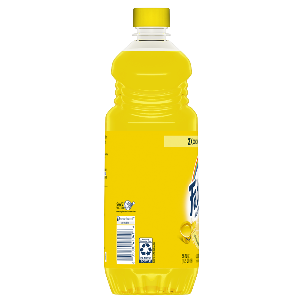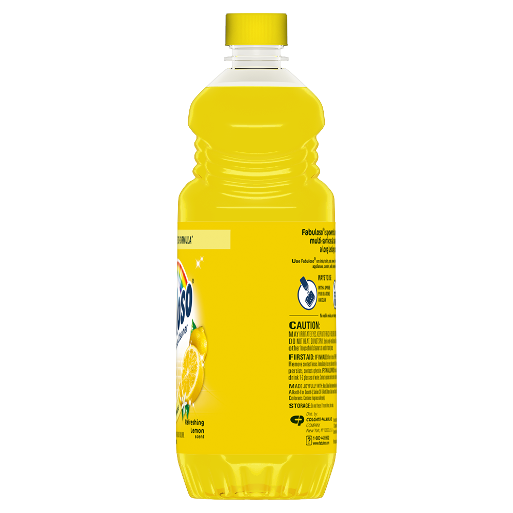 SKU MX06157A Consumer Unit - GTIN 00035000470416 Case - GTIN 10035000470413 Product Category Home Care Product Sub Category Cleaners Liquid / Gel Product Equity (Brand) Fabuloso Product Sub Brand Fabuloso Liq Cln Product Title Fabuloso Multi-Purpose Cleaner, 2X Concentrated Formula, Lemon Scent, 56 oz Product Description Fabuloso 2x Multi-Purpose Cleaner is the perfect solution for anyone looking for an effective way to keep their home clean and smelling great. Whether used as a bathroom cleaner, kitchen cleaner, or floor cleaner, the long-lasting lemon scent will fill your home with joy. Our multi-purpose cleaner cuts through grease, grime, and dirt. Its easy-pour bottle delivers a colorful and satisfying pour every time. We understand that life isn't always easy, but cleaning it up can be with Fabuloso multi-purpose surface cleaner. Our 2X concentrated formula provides 2x more uses and 2x more active ingredients vs our non-concentrated Fabuloso Original. It also uses 50% less plastic by following dosing instructions and getting twice as many uses out of one bottle vs. the same size of Fabuloso Original. It's important to use Fabuloso cleaning products safely, please follow the instructions on the label. Mix 1/8 cup in a gallon of water or pour on a sponge and clean. eCommerce Copy- Long Description Fabuloso® Multi-Purpose Cleaner, 2X Concentrated Formula, Refreshing Lemon Scent Fabuloso® Multi-Purpose Cleaner, 2X Concentrated Formula in Refreshing Lemon Scent transforms your home with a fresh scent that lasts. Bring the fragrance of lemon indoors, and experience a warm, joyful feeling your friends and family will love. Fabuloso®’s 2X Concentrated Formula now provides 2X more active ingredients compared to non-concentrated Fabuloso Original, giving you 2X the dosage in the same bottle. Every colorful pour from the easy-pour bottle delivers a long-lasting, unmistakable freshness and leaves your home bright and clean. Use Fabuloso® Multi-Purpose Cleaner, on sinks, toilets, tubs, showers, kitchen and bathroom floors, sealed wood surfaces, appliances, counters, windows, mirrors, walls, doorknobs and furniture, and fill every room in your home with joy. Uplifting fragrances. Clean surfaces. Irresistible joy. Life isn’t always easy, but cleaning it up sure can be. Fabuloso® combines cleaning power with fresh scents that fill your home with joy, to make it a welcoming place no matter how hard your day. Fabuloso®’s 2X Concentrated Formula provides 2X more uses in the same bottle compared to non-concentrated Fabuloso Original. From the kitchen to the bathroom and beyond, Fabuloso® Multi-Purpose, Cleaner 2X Concentrated has a wide variety of long-lasting fragrances that deliver hope for a better tomorrow. Try all of our uplifting scents: Lavender, Passion of Fruits, Citrus & Fruits with Baking Soda, Bleach Alternative† Spring Fresh, Tropical Spring, and Orange Scent with Baking Soda. † Bleach-free option with 20% more active ingredients vs other Fabuloso 2X Concentrated products Shared Moments of Joy All Over the World Our story begins in Venezuela, circa 1980. Cleaning products lacked fragrance and distinction. But families wanted lasting scents that kept their homes fresh and clean for hours. Enter the bold colors and joyful fragrances of Fabuloso® ! 16 years later, families across America also got to experience the joy: we became a household staple thanks to our rainbow of colors and playful, distinctive scents. Today, across the world, we’re more than cleaning products. We’re a catalyst for joy. Bullet 1 2X concentrated formula provides 2X more active ingredients compared to non-concentrated Fabuloso Original Bullet 2 Multi-purpose cleaner for a wide range of surfaces, from floors to furniture to appliances Bullet 3 Mix 1/8 cup in a gallon of water or pour on a sponge and clean Bullet 4 Lemon scent provides long-lasting freshness Bullet 5 Uses 50% less plastic by following dosing instructions to get twice as many uses out of one bottle v. the same size of Fabuloso Original Walmart RPC 124904444 Walmart URL (Computed) https://www.walmart.com/ip/a/124904444 Family Dollar RPC 1499426