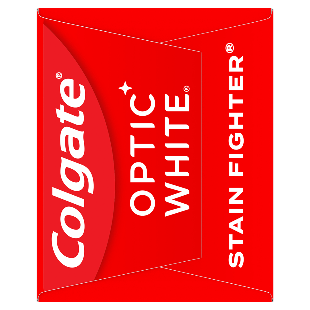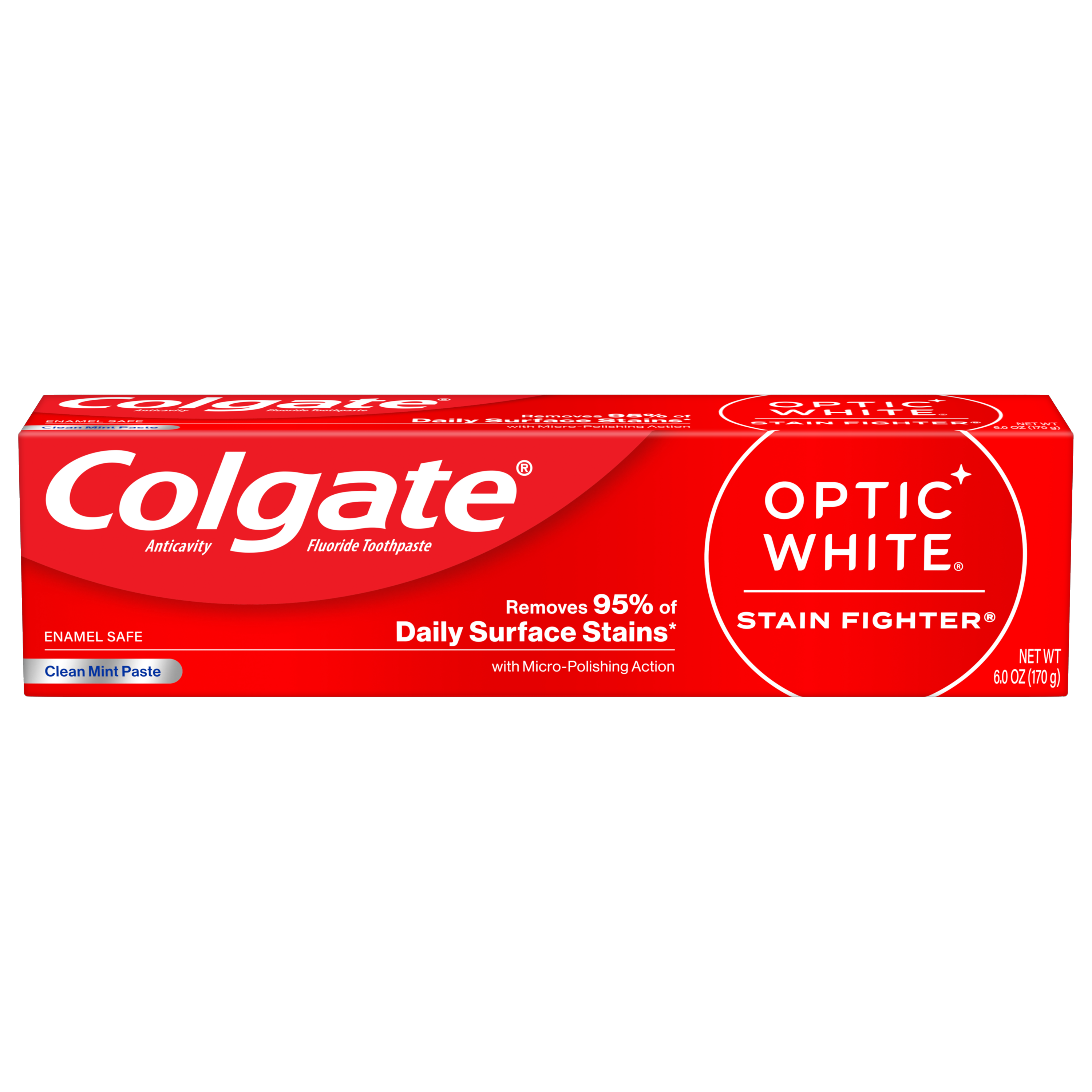 SKU MX06286A Consumer Unit - GTIN 00035000472175 Case - GTIN 10035000472172 Product Category Oral Care Product Sub Category Toothpaste Product Equity (Brand) Colgate Product Sub Brand Colgate Optic White TP Product Title Colgate Optic White Stain Fighter Teeth Whitening Toothpaste, Clean Mint Paste Product Description Remove everyday surface stains for a brighter smile with the Colgate Optic White Stain Fighter Teeth Whitening Toothpaste. This teeth whitening toothpaste for adults removes 95% of daily surface stains for a brighter smile.* Get ready to reveal a smile that’s ready to shine with the Colgate Optic White Whitening Stain Removal Toothpaste. The Colgate Optic White Stain Fighter Whitening Toothpaste uses a patented whitening formula to remove 95% of daily surface stains*. Using micro-polishing action, this anticavity toothpaste removes 5X more surface stains.** Plus, this fluoride toothpaste comes in a refreshing Clean Mint Paste flavor so you can enjoy minty freshness every time you brush. Colgate Optic White Stain Fighter Teeth Whitening Toothpaste is a fluoride-based vegan toothpaste that is sugar free, gluten free, and enamel-safe for daily use. For whitening that works, choose the Colgate Optic White Stain Fighter Whitening Stain Removal Toothpaste. *after 2 weeks of twice daily use **vs. ordinary, non whitening toothpaste after 2 weeks of continued use eCommerce Copy- Long Description Colgate Optic White Stain Fighter Toothpaste, Clean Mint Paste, 6.0 Oz.