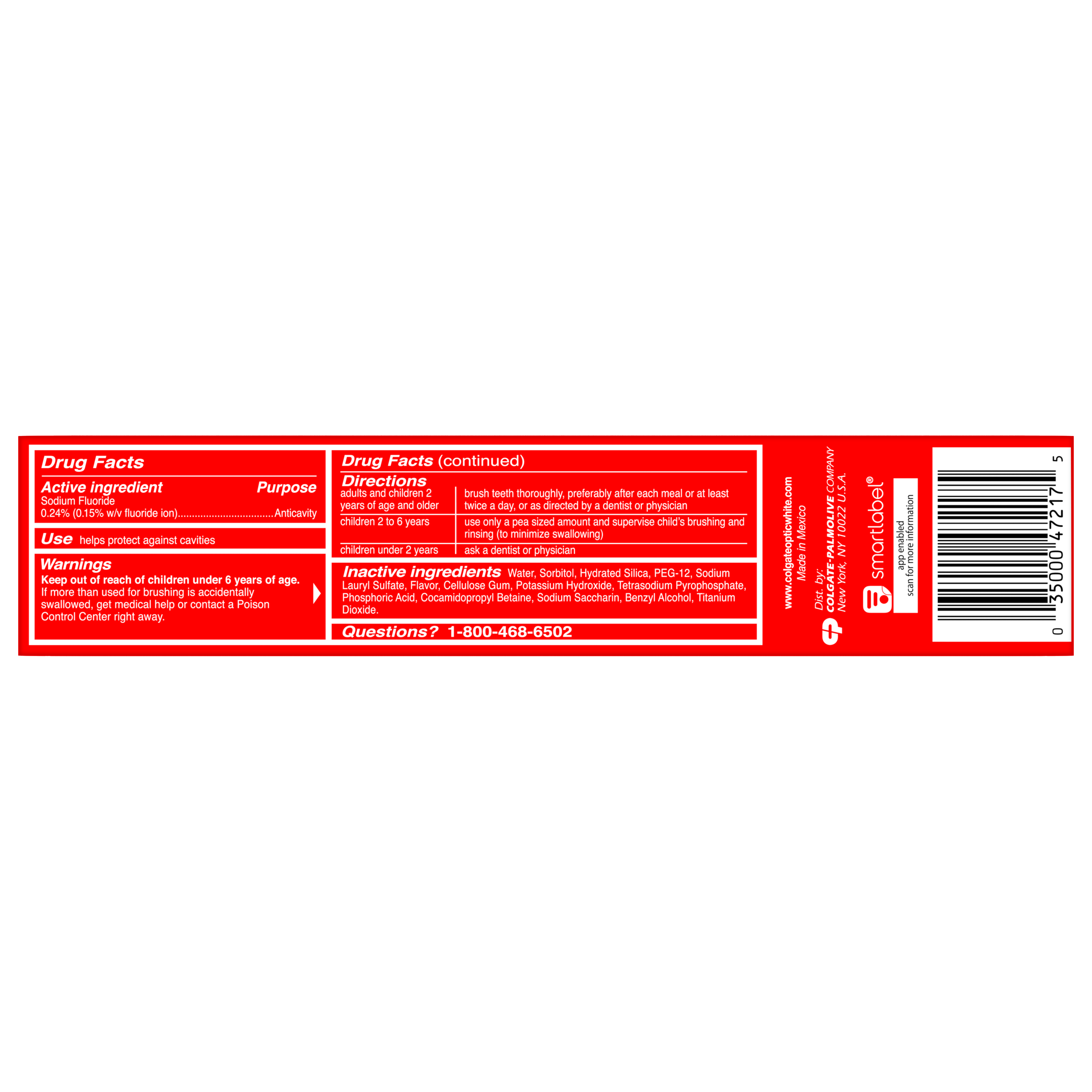 Bullet 1 Includes one (1) 6.0 oz tube of Colgate Optic White Stain Fighter Teeth Whitening Toothpaste, Anticavity Fluoride Toothpaste Bullet 2 This teeth whitening toothpaste for adults removes 95% of daily surface stains for a brighter smile* (*after 2 weeks of twice daily use) Bullet 3 The refreshing Clean Mint Paste flavor helps freshen your breath every time you brush with this mint toothpaste Bullet 4 Removes 5X more surface stains with micro-polishing action** (**vs. ordinary, non whitening toothpaste after 2 weeks of continued use) Bullet 5 This vegan toothpaste is gluten free, sugar free, and enamel-safe for daily use Bullet 6 Colgate Optic White Stain Fighter Toothpaste is an anticavity toothpaste made with a fluoride based formula Bullet 7 For whitening that works, choose the Colgate Optic White Stain Fighter Whitening Stain Removal Toothpaste Active Ingredients Active ingredient: Sodium Fluoride (0.24% (0.15% w/v Fluoride Ion)). Purpose: Anticavity. Walmart RPC 256787623 Walmart URL (Computed) https://www.walmart.com/ip/a/256787623 Target RPC 76579081 Target URL https://www.target.com/p/a/-/A-76579081 Albertsons RPC 970487110 Albertsons URL https://www.albertsons.com/shop/product-details.970487110.html CVS RPC 181242
