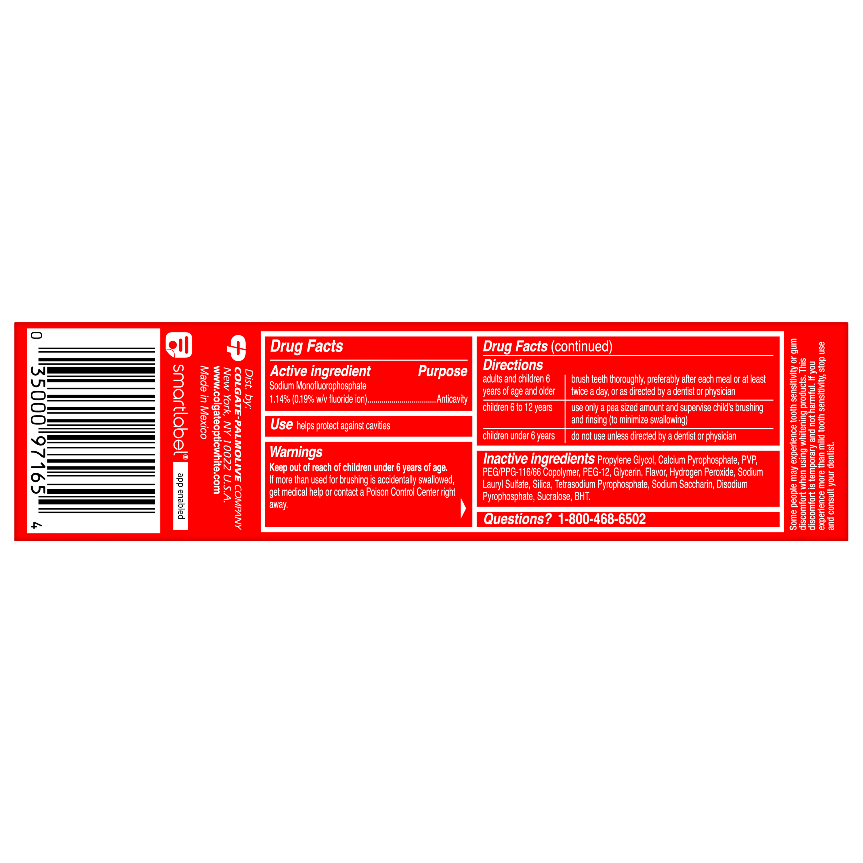 Bullet 1 Includes one (1) 3.2 oz tube of Colgate Optic White Advanced Oxygenating White Hydrogen Peroxide Toothpaste, Teeth Whitening Toothpaste Bullet 2 Remove 5 years of stains* with the Colgate Optic White Advanced Teeth Whitening Toothpaste (*when brushing twice daily for 2 weeks) Bullet 3 This 2% hydrogen peroxide toothpaste uses a patented whitening formula and comes in an Oxygenating White mint toothpaste flavor Bullet 4 Enamel-safe and effectively removes tea, coffee and wine stains** with the 2% hydrogen peroxide formula (**as shown in a laboratory study) Bullet 5 Colgate Optic White Advanced Hydrogen Peroxide Toothpaste is an anticavity toothpaste made with fluoride to help fight cavities Bullet 6 This whitening stain removal toothpaste is gluten free and enamel-safe for daily use Bullet 8 For whitening that works, choose the Colgate Optic White Advanced Icy Fresh Hydrogen Peroxide Toothpaste Active Ingredients Sodium Monofluorophosphate 1.14% (0.19% w/v fluoride ion) Walmart RPC 691315888 Walmart URL (Computed) https://www.walmart.com/ip/a/691315888 Albertsons RPC 960076173 Albertsons URL https://www.albertsons.com/shop/product-details.960076173.html CVS RPC 897459