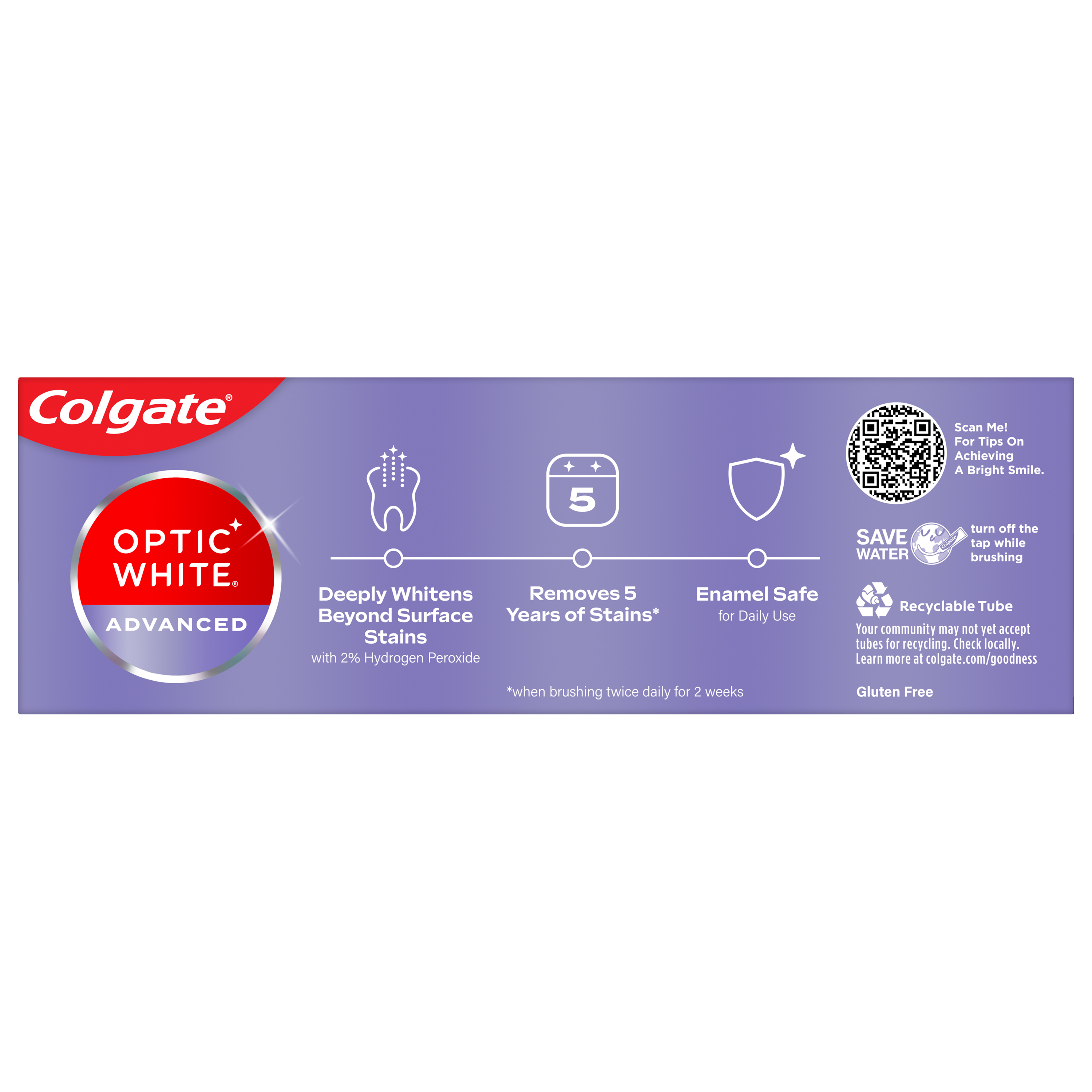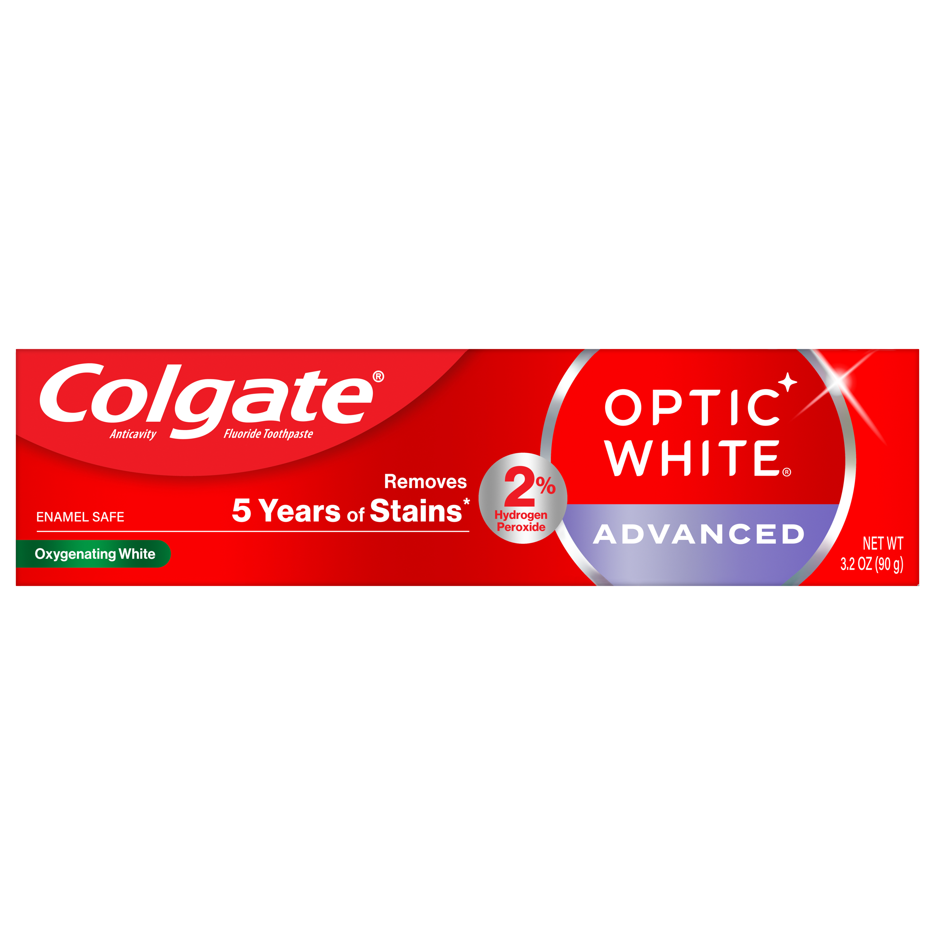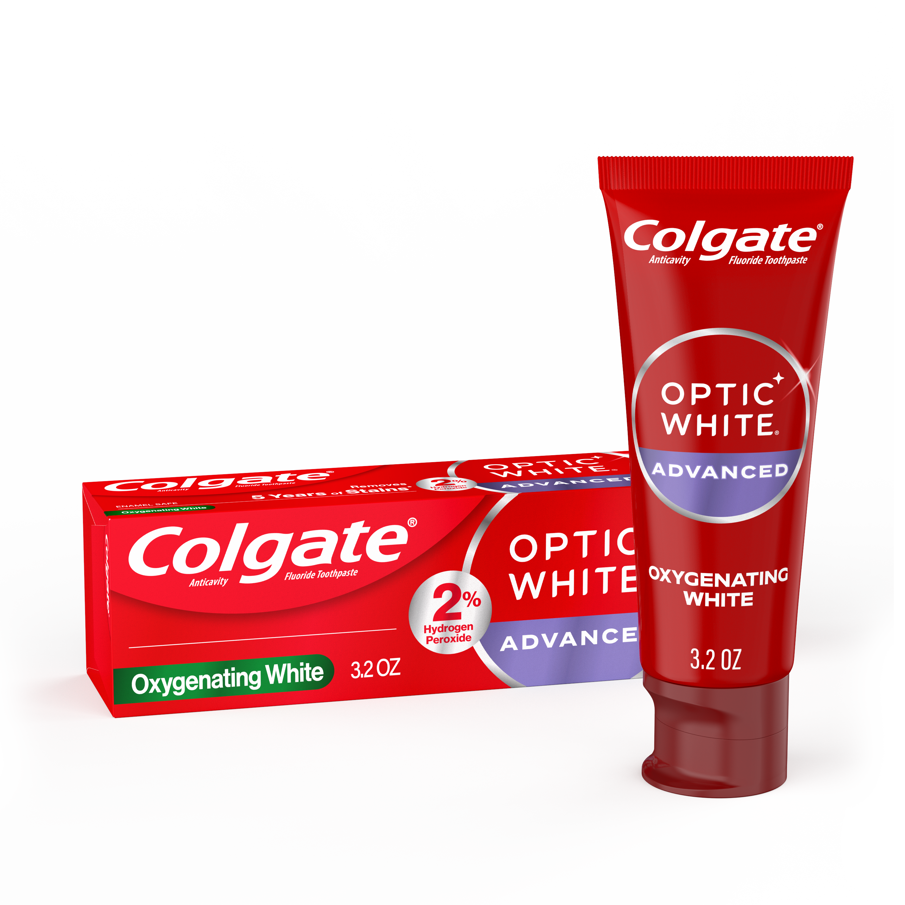 Colgate Optic White Advanced Hydrogen Peroxide Toothpaste is a patented whitening toothpaste with 2% hydrogen peroxide that removes surface stains and is enamel-safe. This teeth whitening toothpaste for adults is also an anticavity fluoride toothpaste to help prevent cavities. For whitening that works, choose Colgate Optic White Advanced Hydrogen Peroxide Toothpaste.