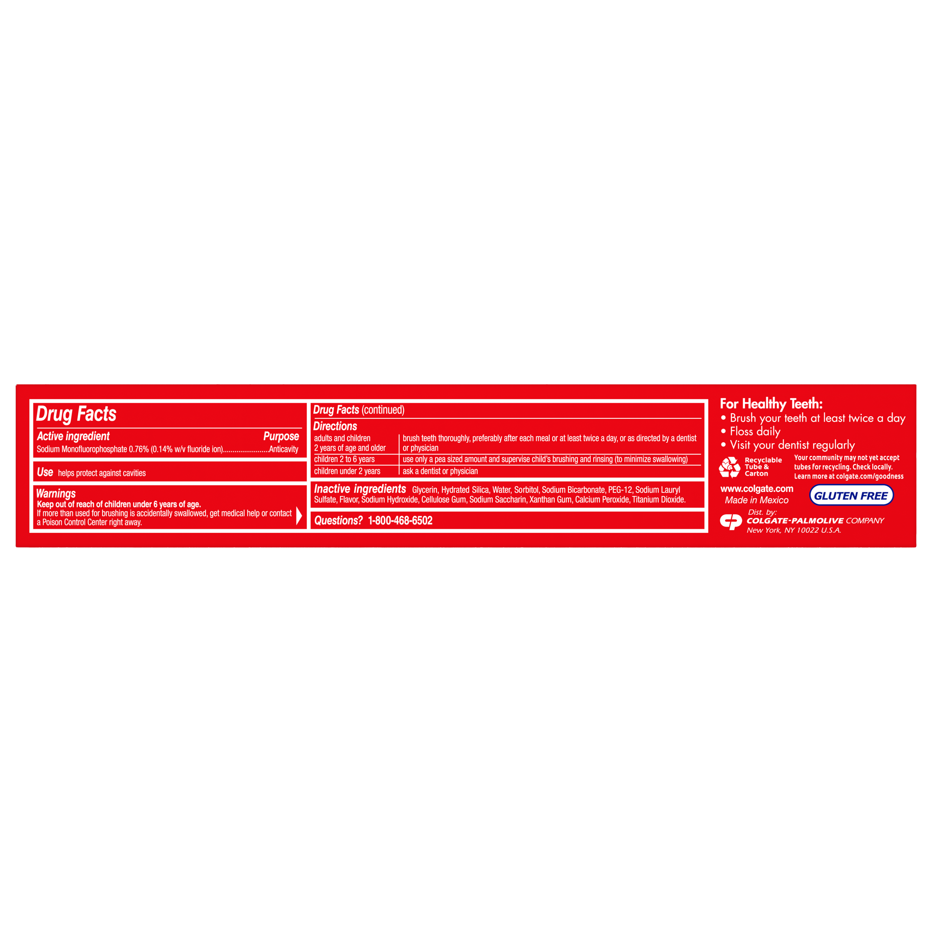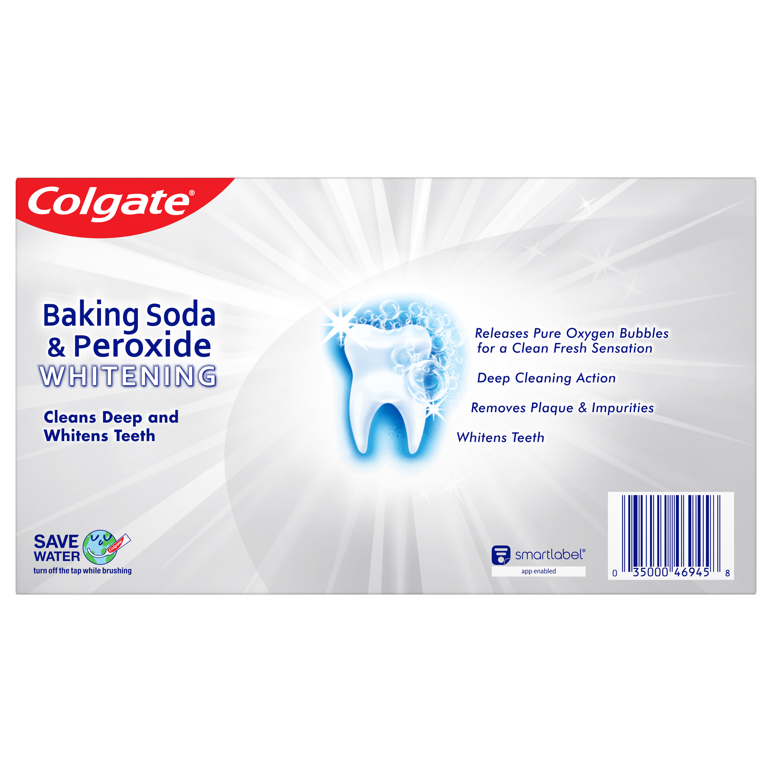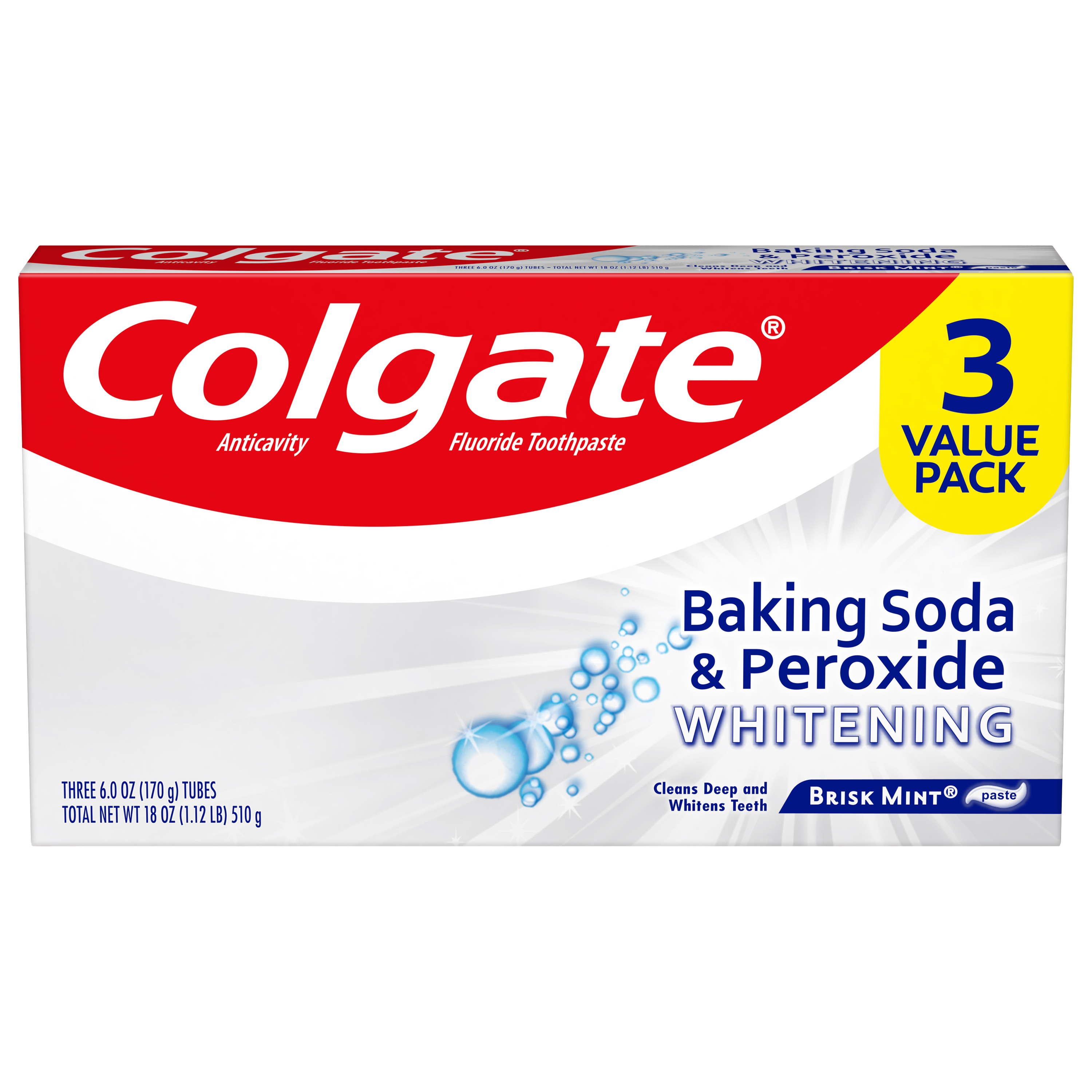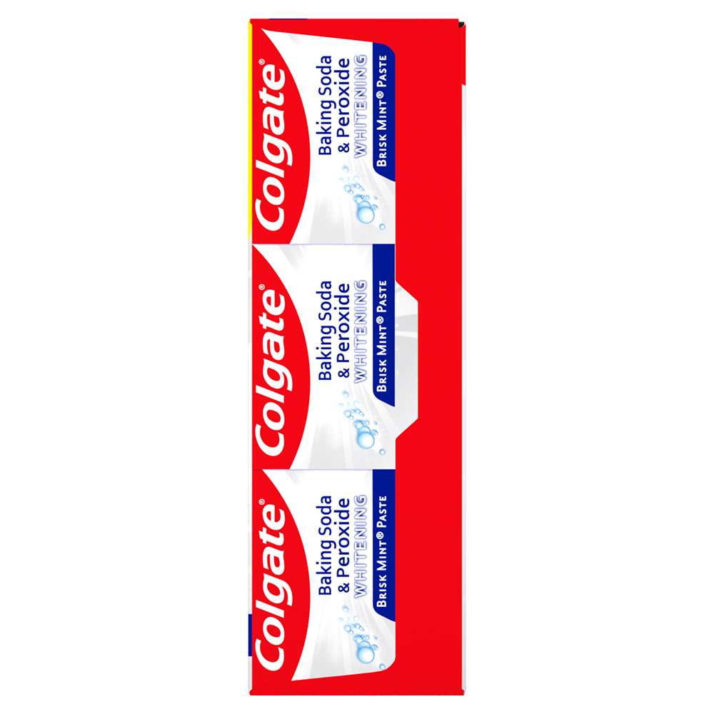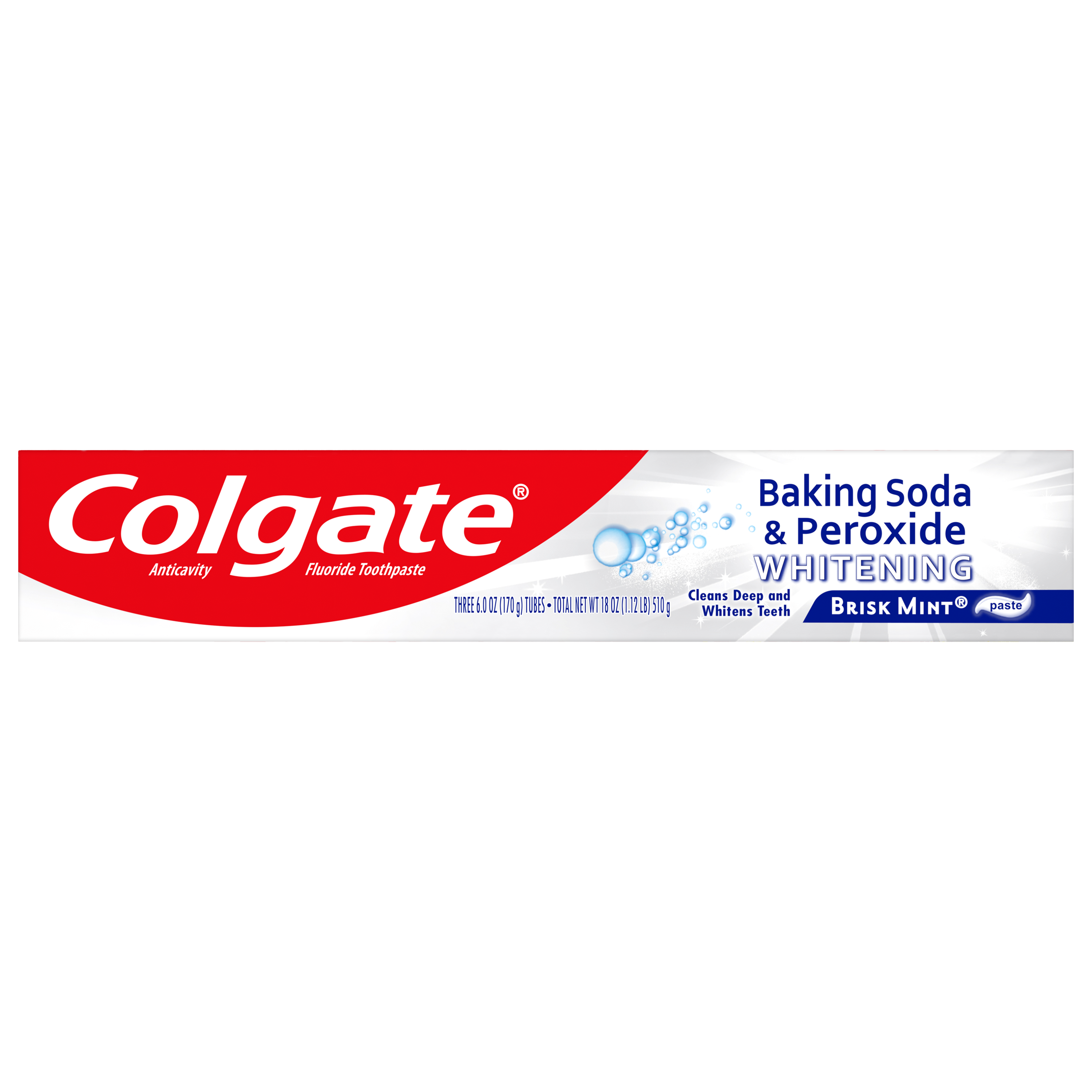 SKU MX06951A Consumer Unit - GTIN 00035000469458 Case - GTIN 10035000971934 Product Category Oral Care Product Sub Category Toothpaste Product Equity (Brand) Colgate Product Sub Brand Colgate Baking Soda TP Product Title Colgate Baking Soda and Peroxide Whitening Toothpaste, Brisk Mint - 6 Ounce, 3 Pack Product Description Colgate Baking Soda and Peroxide Whitening Toothpaste, with a great Brisk Mint flavor, refreshes & cleans for whiter teeth. This whitening toothpaste cleans deep, preventing cavities and the build-up of tartar. Our unique formula releases pure oxygen bubbles every time you brush your teeth for a clean, fresh sensation. This baking soda and peroxide whitening toothpaste has a Brisk Mint flavor that freshens breath. eCommerce Copy- Long Description Colgate Baking Soda and Peroxide Whitening Toothpaste, with a great Brisk Mint flavor, refreshes & cleans for whiter teeth. This whitening toothpaste cleans deep, preventing cavities and the build-up of tartar. Our unique formula releases pure oxygen bubbles every time you brush your teeth for a clean, fresh sensation. This baking soda and peroxide whitening toothpaste has a Brisk Mint flavor that freshens breath. Bullet 1 Helps remove teeth stains Bullet 2 Cleans deep and whitens teeth Bullet 3 Fights cavities Bullet 4 Removes plaque and impurities Bullet 5 Long lasting cooling effect Active Ingredients Sodium Monofluorophosphate 0.76% (0.14% w/v fluoride ion) Walmart RPC 539269609 Walmart URL (Computed) https://www.walmart.com/ip/a/539269609 Target RPC 75563086 Target URL https://www.target.com/p/a/-/A-75563086 CVS RPC 381599 Family Dollar RPC 902143