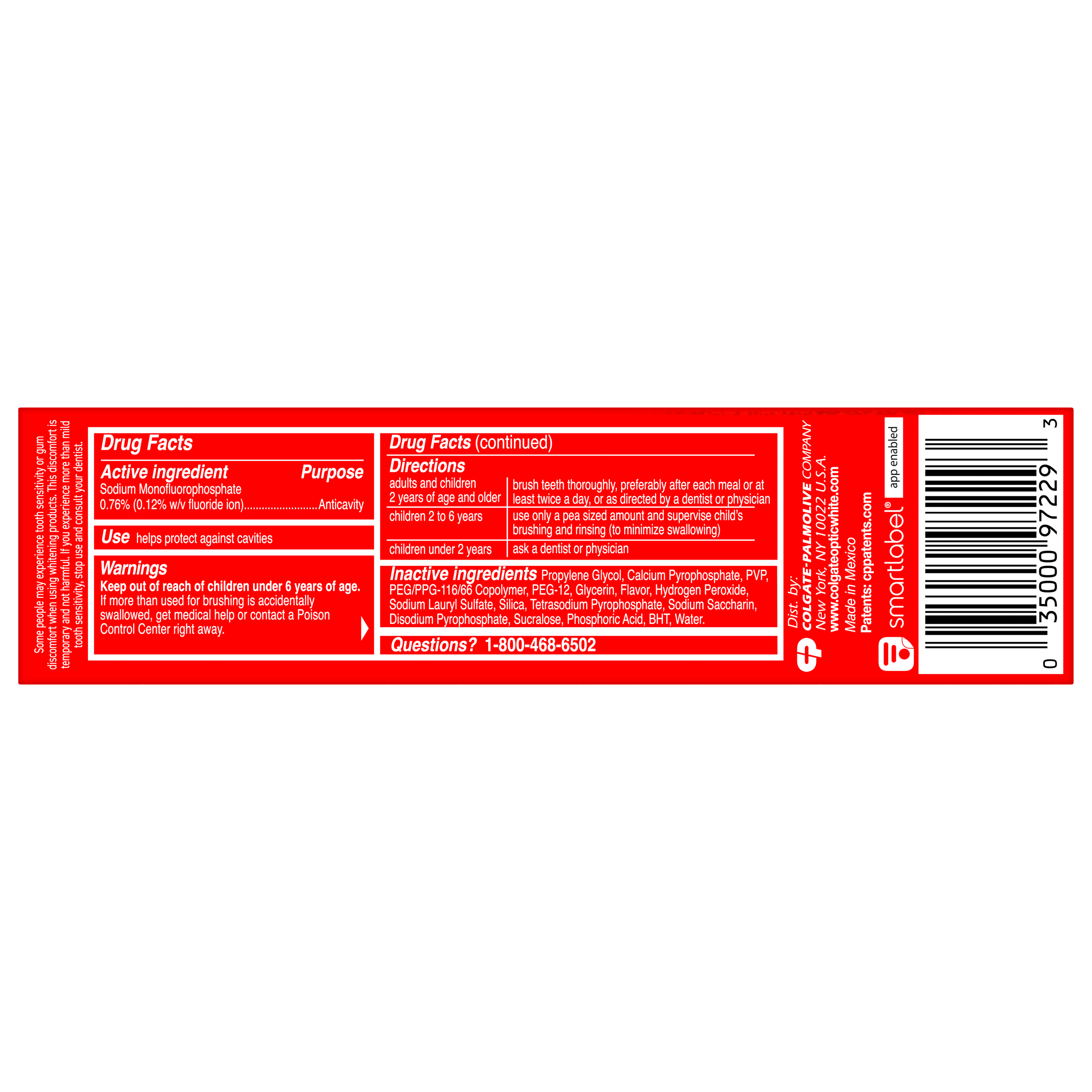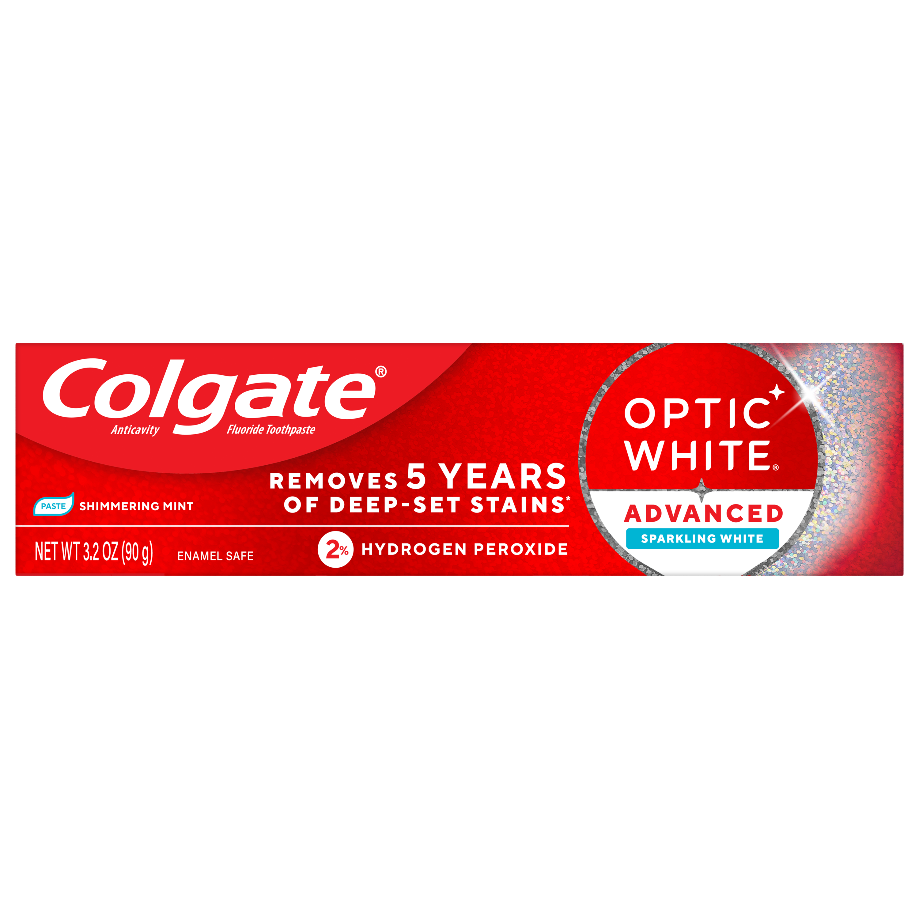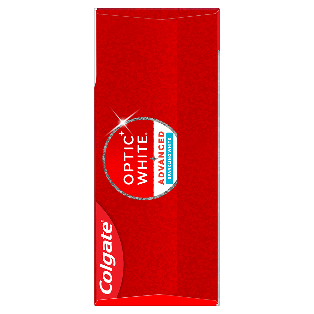 SKU MX06958A Consumer Unit - GTIN 00035000972293 Case - GTIN 10035000972290 Product Category Oral Care Product Sub Category Toothpaste Product Equity (Brand) Colgate Product Sub Brand Colgate Optic White TP Product Title Colgate Optic White Advanced Sparkling White Toothpaste with 2% Hydrogen Peroxide, 2 Pack, 3.2 OZ Product Description Powered by HP Complex, our unique formulation of Hydrogen Peroxide, Optic White Advanced removes 5 years of deep-set stains for visibly whiter teeth*. This clinically proven formula contains Hydrogen Peroxide, the same whitening ingredient used by dentists. Designed for no tooth sensitivity, this double mint toothpaste pack provides enamel-safe stain removal for noticeable results*. Colgate Optic White Advanced is an anticavity fluoride toothpaste that starts whitening after the first brush. Most other whitening toothpastes** only target surface stains, but Optic White's dual-action formula with HP Complex gently diffuses below the surface of teeth as a deep-set stain remover toothpaste while micropolishers brush the surface clean. Advanced Sparkling White Toothpaste dissolves deep-set stains without weakening enamel. Specially designed for no tooth sensitivity, Advanced Sparkling White helps protect enamel during stain removal. Feel refreshed with this mint toothpaste. Infused with herbal undertones, its cooling blend of peppermint toothpaste and wintergreen toothpaste flavors delivers an invigorating sensation from start to finish. *when brushing twice daily for 2 weeks **without hydrogen peroxide eCommerce Copy- Long Description Colgate Optic White Advanced Hydrogen Peroxide Toothpaste, Sparkling White, 3.2 Oz., 2 Pack Remove 5 years of stains* using Colgate Optic White Advanced Hydrogen Peroxide Teeth Whitening Toothpaste. Use this hydrogen peroxide toothpaste with a 2% hydrogen peroxide-based formula to whiten beyond surface stains. Made with a cool mint flavor, Colgate Optic White Advanced Whitening Toothpaste effectively removes tea, coffee, and wine stains** so you can achieve a bright smile. Whitening That Works Colgate Optic White Advanced Hydrogen Peroxide Toothpaste is a patented whitening toothpaste with 2% hydrogen peroxide that removes surface stains and is enamel-safe. This teeth whitening toothpaste for adults is also an anticavity fluoride toothpaste to help prevent cavities. For whitening that works, choose Colgate Optic White Advanced Hydrogen Peroxide Toothpaste. Gluten Free and Enamel-Safe Go beyond surface stains with Colgate Optic White Advanced Toothpaste. Colgate Optic White Hydrogen Peroxide Toothpaste is a gluten free mint toothpaste with a patented 2% hydrogen peroxide formula that is enamel-safe. Unlock a radiant smile with Colgate Optic White Advanced Sparkling White Hydrogen Peroxide Toothpaste. *when brushing twice daily for 2 weeks **as shown in a laboratory study Bullet 1 Two 3.2 OZ tubes of Colgate Optic White Advanced Sparkling White Toothpaste Bullet 2 Advanced Sparkling White Toothpaste removes 5 years of deep-set stains* *When brushing twice daily for 2 weeks Bullet 3 Our proprietary HP Complex formula includes hydrogen peroxide, the same whitening ingredient used by dentists for deep whitening beyond surface stains Bullet 4 This double toothpaste pack is enamel safe for daily use Bullet 5 Clinically proven formula with 2% hydrogen peroxide starts whitening after the first brush Bullet 6 Invigorating mint toothpaste combines clean peppermint and cool wintergreen flavors Bullet 7 Advanced Sparkling White is an anticavity toothpaste Bullet 8 For whitening that works, choose the Colgate Optic White Advanced Icy Fresh Hydrogen Peroxide Toothpaste Active Ingredients Sodium Monofluorophosphate 0.76 % (0.12% w/v fluoride ion) Walmart RPC 944806911 Walmart URL (Computed) https://www.walmart.com/ip/a/944806911 Albertsons RPC 960108336 Albertsons URL https://www.albertsons.com/shop/product-details.960108336.html CVS RPC 854343 Family Dollar RPC 900932
