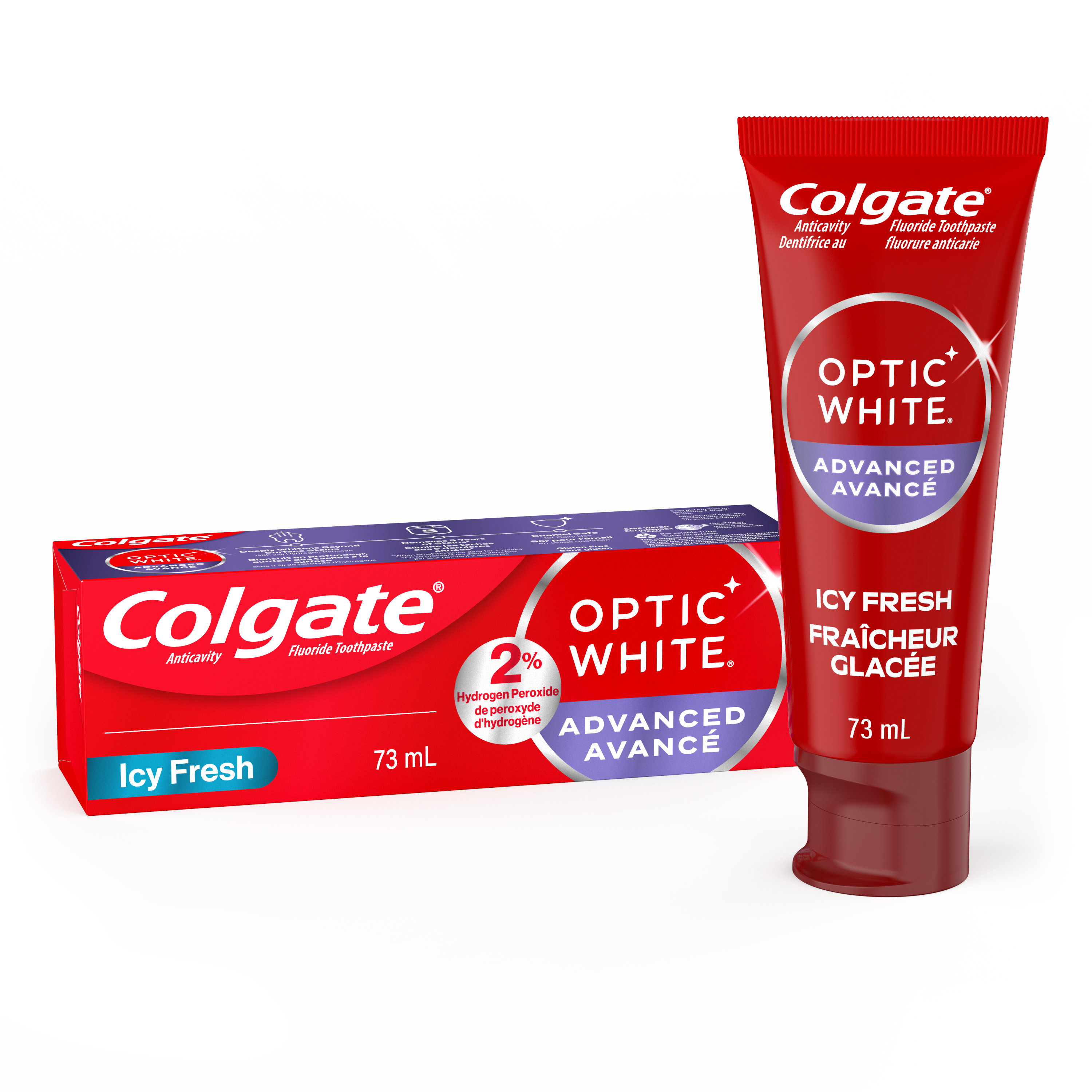 SKU MX06985A Consumer Unit - GTIN 00035000972583 Case - GTIN 10035000972580 Product Category Oral Care Product Sub Category Toothpaste Product Equity (Brand) Colgate Product Sub Brand Colgate Optic White TP Product Title Colgate Optic White Advanced Hydrogen Peroxide Toothpaste, Icy Fresh Product Description Remove 5 years of stains* using the Colgate Optic White Advanced Hydrogen Peroxide Teeth Whitening Toothpaste. Use this hydrogen peroxide toothpaste with a 2% hydrogen peroxide-based formula to whiten beyond surface stains. Made with a cool Icy Fresh flavor, Colgate Optic White Advanced Whitening Toothpaste effectively removes tea, coffee, and wine stains** so you can achieve a bright smile. Colgate Optic White Advanced Hydrogen Peroxide Toothpaste is a patented whitening toothpaste with 2% hydrogen peroxide that removes surface stains and is enamel-safe. This teeth whitening toothpaste for adults is also an anticavity fluoride toothpaste to help prevent cavities. For whitening that works, choose the Colgate Optic White Advanced Hydrogen Peroxide Toothpaste. Go beyond surface stains with the Colgate Optic White Advanced Toothpaste. Colgate Optic White Hydrogen Peroxide Toothpaste is a gluten free mint toothpaste with a patented 2% hydrogen peroxide formula that is enamel-safe. Unlock a radiant smile with the Colgate Optic White Advanced Icy Fresh Hydrogen Peroxide Toothpaste. *when brushing twice daily for 2 weeks **as shown in a laboratory study Bullet 1 Includes one (1) 73 mL tube of Colgate Optic White Advanced Icy Fresh Hydrogen Peroxide Toothpaste, Teeth Whitening Toothpaste Bullet 2 Remove 5 years of stains* with the Colgate Optic White Advanced Teeth Whitening Toothpaste (*when brushing twice daily for 2 weeks) Bullet 3 This 2% hydrogen peroxide toothpaste uses a patented whitening formula and comes in a cool Icy Fresh mint toothpaste flavor Bullet 4 Enamel-safe and effectively removes tea, coffee and wine stains** with the 2% hydrogen peroxide formula (**as shown in a laboratory study) Bullet 5 Colgate Optic White Advanced Hydrogen Peroxide Toothpaste is an anticavity toothpaste made with fluoride to help fight cavities Bullet 6 Use this teeth whitening toothpaste to remove coffee stains** and go beyond surface stains (**as shown in a laboratory study) Bullet 7 This whitening stain removal toothpaste is gluten free and enamel-safe for daily use Bullet 8 For whitening that works, choose the Colgate Optic White Advanced Icy Fresh Hydrogen Peroxide Toothpaste Active Ingredients Sodium Monofluorophosphate 0.76% w/w INGRÉDIENT(S) MÉDICINAUX: Monofluorophosphate de sodium 0,76 % p/p