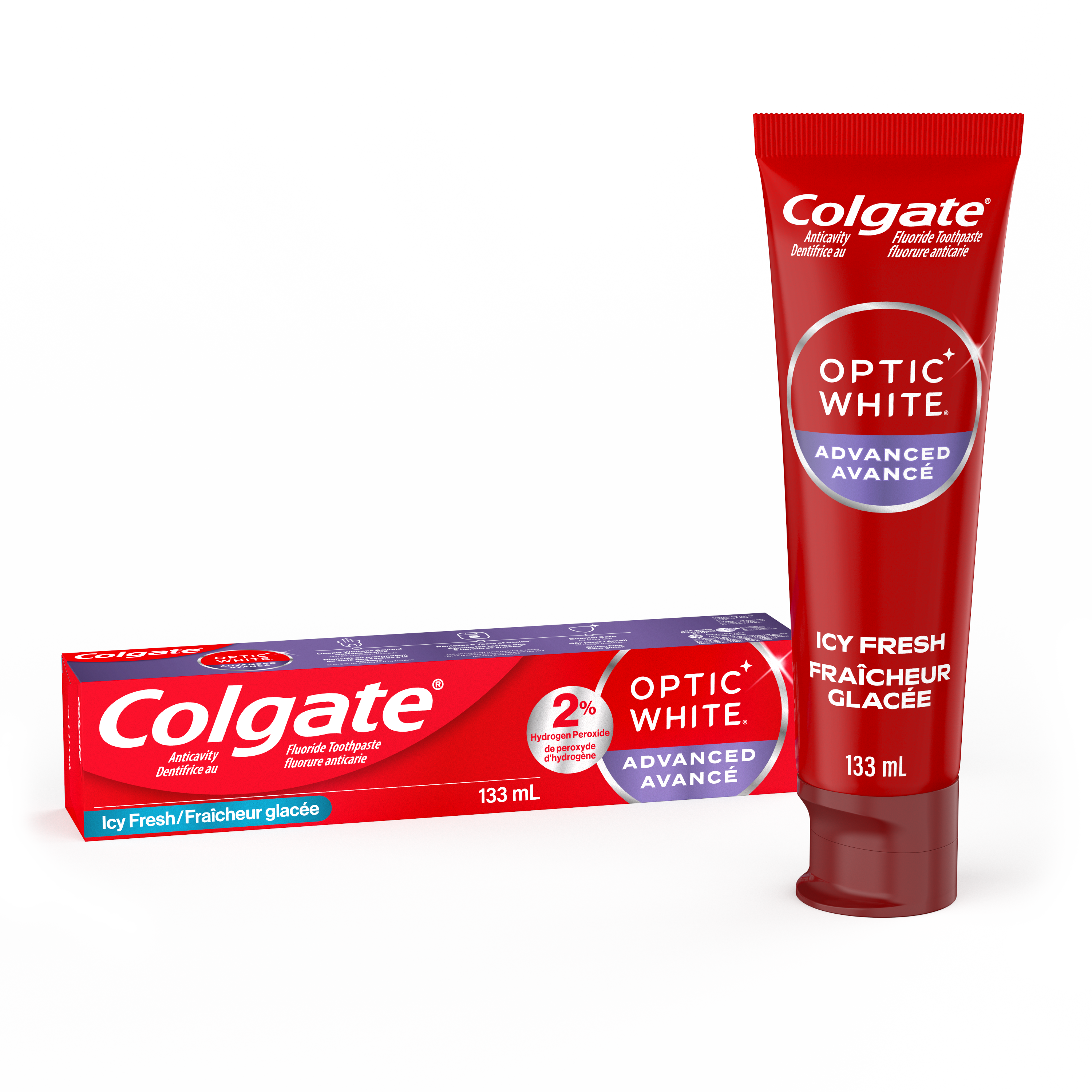 SKU MX06987A Consumer Unit - GTIN 00035000972606 Case - GTIN 10035000972603 Product Category Oral Care Product Sub Category Toothpaste Product Equity (Brand) Colgate Product Sub Brand Colgate Optic White TP Product Title Colgate Optic White Advanced Hydrogen Peroxide Toothpaste, Icy Fresh Product Description Remove 5 years of stains* using the Colgate Optic White Advanced Hydrogen Peroxide Teeth Whitening Toothpaste. Use this hydrogen peroxide toothpaste with a 2% hydrogen peroxide-based formula to whiten beyond surface stains. Made with a cool Icy Fresh flavor, Colgate Optic White Advanced Whitening Toothpaste effectively removes tea, coffee, and wine stains** so you can achieve a bright smile. Colgate Optic White Advanced Hydrogen Peroxide Toothpaste is a patented whitening toothpaste with 2% hydrogen peroxide that removes surface stains and is enamel-safe. This teeth whitening toothpaste for adults is also an anticavity fluoride toothpaste to help prevent cavities. For whitening that works, choose the Colgate Optic White Advanced Hydrogen Peroxide Toothpaste. Go beyond surface stains with the Colgate Optic White Advanced Toothpaste. Colgate Optic White Hydrogen Peroxide Toothpaste is a gluten free mint toothpaste with a patented 2% hydrogen peroxide formula that is enamel-safe. Unlock a radiant smile with the Colgate Optic White Advanced Icy Fresh Hydrogen Peroxide Toothpaste. *when brushing twice daily for 2 weeks **as shown in a laboratory study Bullet 1 Includes one (1) 133 mL tube of Colgate Optic White Advanced Icy Fresh Hydrogen Peroxide Toothpaste, Teeth Whitening Toothpaste Bullet 2 Remove 5 years of stains* with the Colgate Optic White Advanced Teeth Whitening Toothpaste (*when brushing twice daily for 2 weeks) Bullet 3 This 2% hydrogen peroxide toothpaste uses a patented whitening formula and comes in a cool Icy Fresh mint toothpaste flavor Bullet 4 Enamel-safe and effectively removes tea, coffee and wine stains** with the 2% hydrogen peroxide formula (**as shown in a laboratory study) Bullet 5 Colgate Optic White Advanced Hydrogen Peroxide Toothpaste is an anticavity toothpaste made with fluoride to help fight cavities Bullet 6 Use this teeth whitening toothpaste to remove coffee stains** and go beyond surface stains (**as shown in a laboratory study) Bullet 7 This whitening stain removal toothpaste is gluten free and enamel-safe for daily use Bullet 8 For whitening that works, choose the Colgate Optic White Advanced Icy Fresh Hydrogen Peroxide Toothpaste Active Ingredients Sodium Monofluorophosphate 0.76% w/w INGRÉDIENT(S) MÉDICINAUX: Monofluorophosphate de sodium 0,76 % p/p
