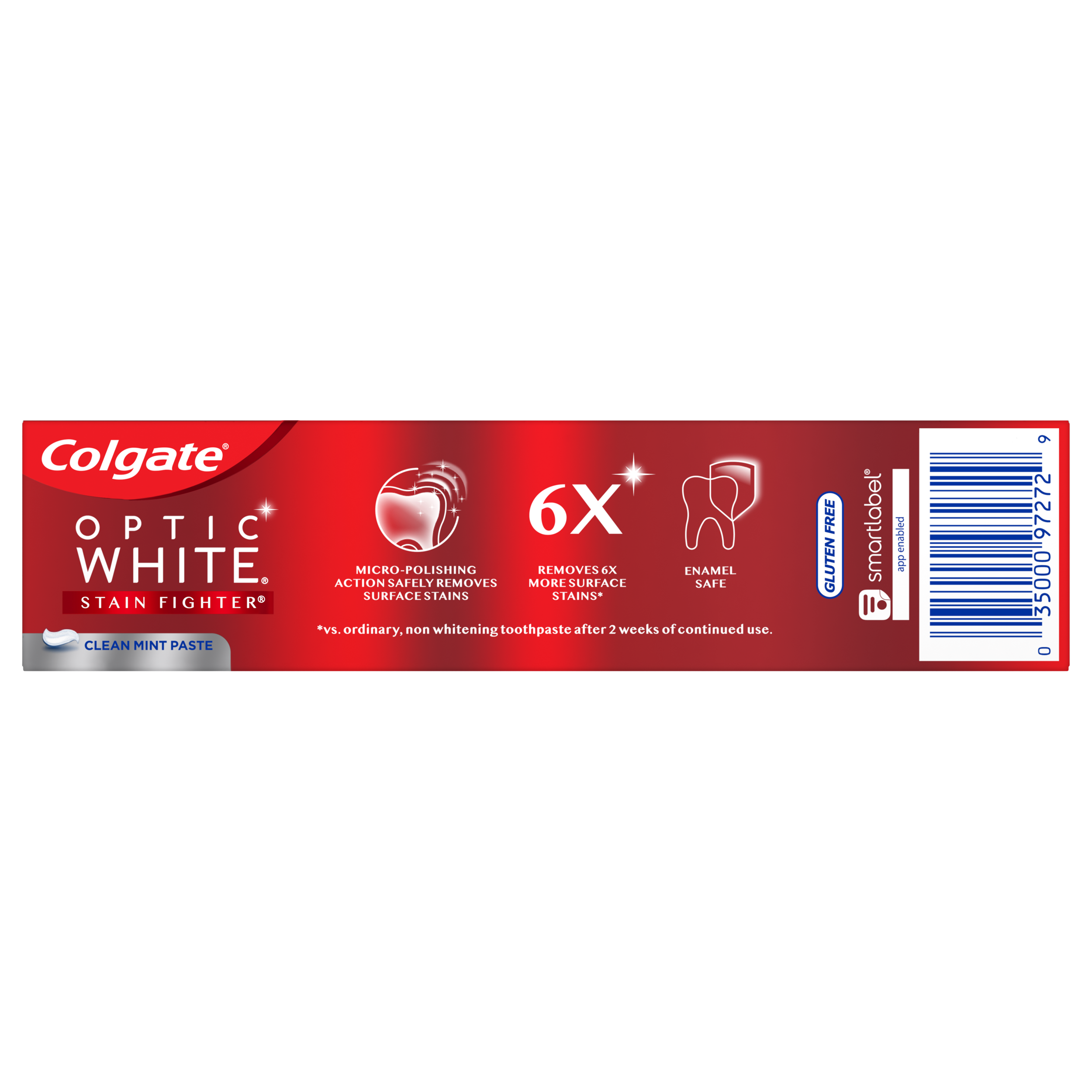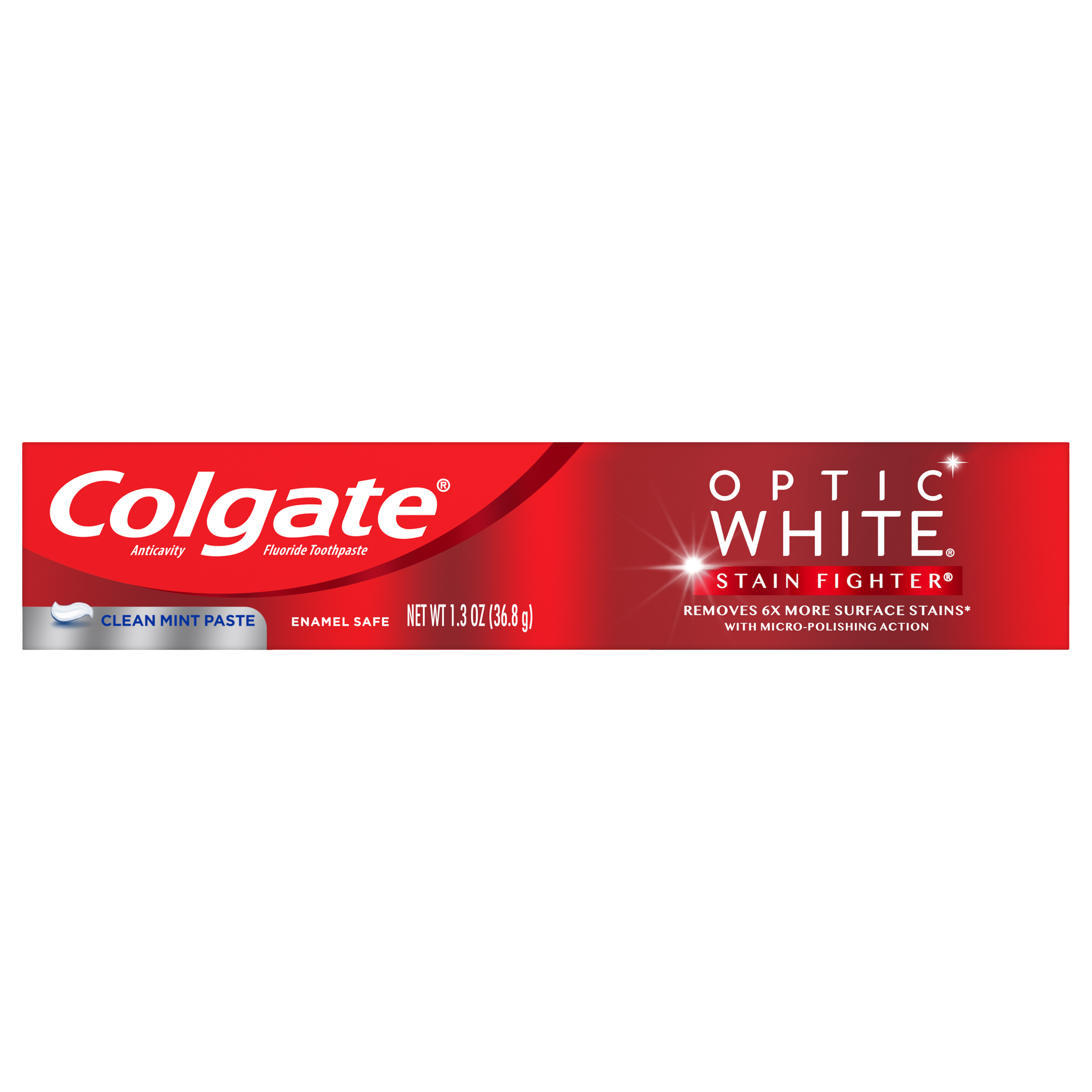 SKU MX06992A Consumer Unit - GTIN 00035000972729 Case - GTIN 10035000972726 Product Category Oral Care Product Sub Category Toothpaste Product Equity (Brand) Colgate Product Sub Brand Colgate Optic White TP Product Title Colgate Optic White Stain Fighter Teeth Whitening Toothpaste, Clean Mint Paste - 1.3 ounce Product Description Colgate Optic White Stain Fighter Teeth Whitening Toothpaste removes 6X more surface stains with micro-polishing action*. It contains clinically proven technology to safely remove surface stains and also help prevent new stains from forming, so your teeth stay whiter longer. This whitening toothpaste is good for daily use, enamel safe, and the fluoride toothpaste formula provides protection against cavities. It has a clean mint flavor in paste form to help freshen your breath. *vs. ordinary non whitening toothpaste, after 2 weeks of continued use. Bullet 1 Whitening toothpaste removes 6X more surface stains for a whiter smile* Bullet 2 Contains clinically proven technology to safely remove surface stains Bullet 3 Enamel-safe teeth whitening, that’s good for daily use Bullet 4 Fluoride toothpaste formula to protect against cavities Bullet 5 Clean Mint flavored toothpaste to help freshen breath Bullet 6 *vs. ordinary non-whitening toothpaste, after 2 weeks of continued use Active Ingredients Active ingredient: Sodium Fluoride (0.24% (0.15% w/v Fluoride Ion)). Purpose: Anticavity.