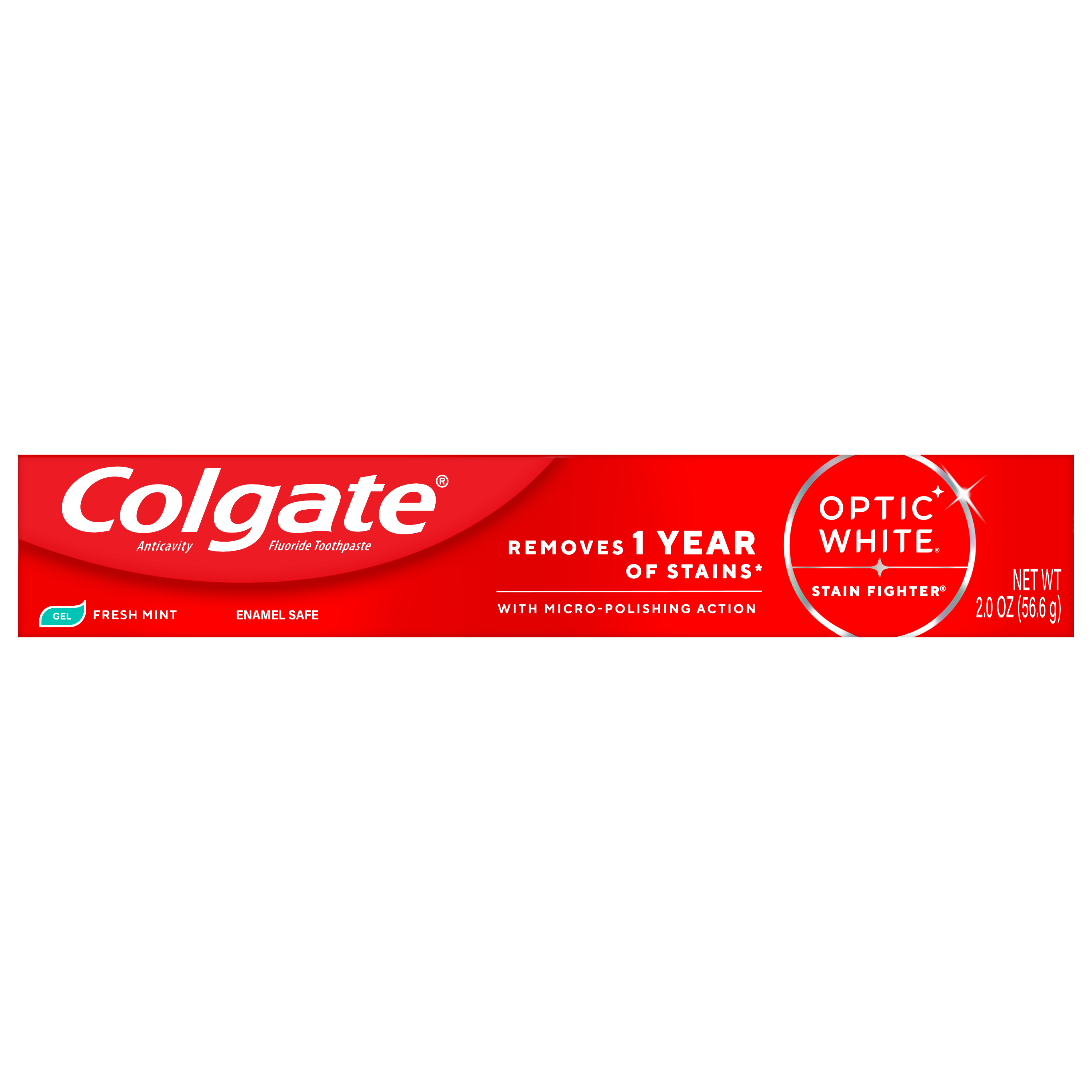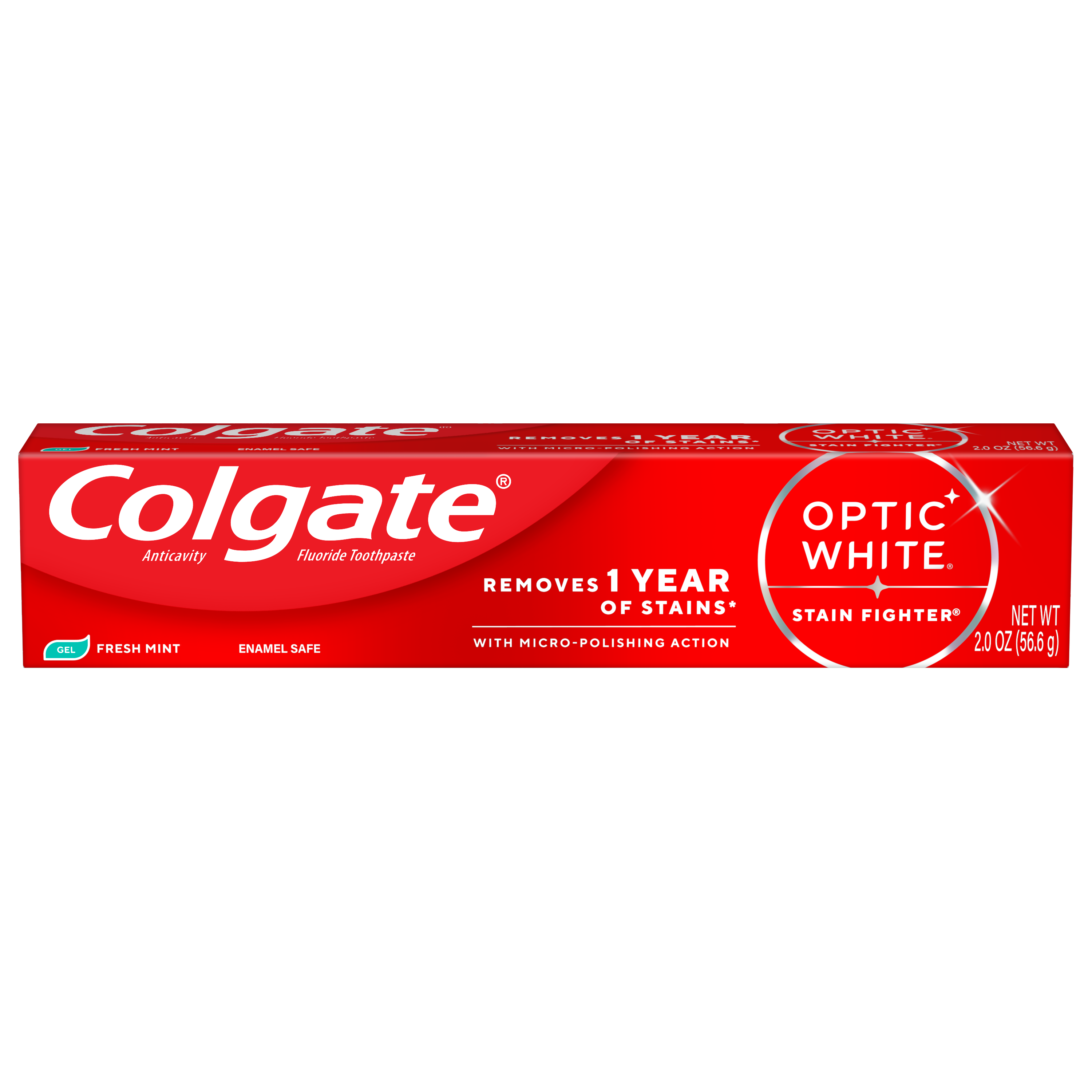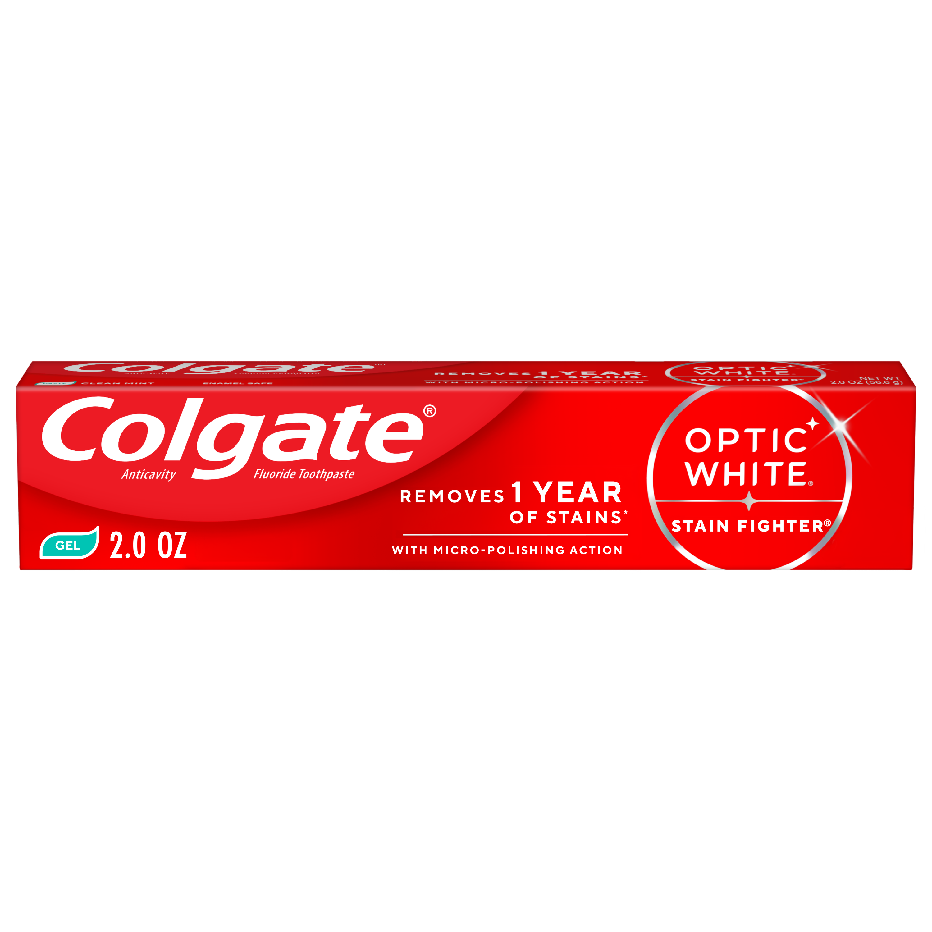 SKU MX06993A Consumer Unit - GTIN 00035000972705 Case - GTIN 10035000972702 Product Category Oral Care Product Sub Category Toothpaste Product Equity (Brand) Colgate Product Sub Brand Colgate Optic White TP Product Title Colgate Optic White Stain Fighter Fresh Mint Teeth Whitening Toothpaste Gel, Travel Size Anticavity Toothpaste Gel with Fluoride, 2.0 OZ Product Description Colgate Optic White Stain Fighter Fresh Mint Toothpaste Gel removes 1 year of stains* while freshening breath with its mint flavor. Its micro-polishing action safely removes 5X more surface stains**. Plus, Optic White Stain Fighter contains fluoride to fight cavities and is an enamel safe stain remover toothpaste. Get a refreshing clean with this effective teeth stain remover and travel size toothpaste. Colgate Optic White Stain Fighter uses a patented whitening formula for thorough, effective stain removal. The micropolishers in Stain Fighter don’t just brush away surface stains – they help prevent new ones from forming. The refreshing peppermint flavor of our toothpaste gel provides instant freshness that lasts from the first taste to the finish. Stain Fighter is a fluoride toothpaste gel that fights cavities. This patented whitening formula removes 1 year of stains* and is enamel safe for daily use. *when brushing twice daily for 3 weeks **vs. ordinary, non-whitening toothpaste after 2 weeks of continued use eCommerce Copy- Long Description Colgate Optic White Stain Fighter Toothpaste, Fresh Mint Gel, 2.0 Oz. Remove every day surface stains to reveal a brighter smile with Colgate Optic White Stain Fighter Stain Removal Toothpaste. This whitening toothpaste for adults removes 95% of daily surface stains for a brighter smile.* Get ready to reveal a beautiful smile that’s ready to shine with Colgate Optic White Stain Fighter Stain Removal Toothpaste. Patented Teeth Whitening Formula with Minty Freshness Colgate Optic White Stain Fighter Stain Removal Toothpaste uses a patented whitening formula to remove 95% of daily surface stains*. Using special micro-polishing action, this anticavity toothpaste removes 5x more surface stains** on teeth. Plus, this fluoride toothpaste comes in a refreshing Fresh Mint Gel flavor so that you can enjoy minty freshness each and every time you brush. Enamel Safe Whitening That Works Colgate Optic White Stain Fighter Stain Removal Toothpaste is a sugar free and vegan toothpaste that is enamel safe for daily use. For whitening that works, choose Colgate Optic White Stain Fighter Stain Removal Toothpaste. *after 2 weeks of twice daily use **vs. ordinary, non whitening toothpaste after 2 weeks of continued use Bullet 1 One 2.0 OZ tube of Colgate Optic White Stain Fighter Fresh Mint Teeth Whitening Toothpaste Gel, Travel Size Toothpaste Bullet 2 Removes 1 year of stains* (*when brushing twice daily for 3 weeks) Bullet 3 Safely removes 5X more surface stains with micro-polishing action** (**vs. ordinary, non-whitening toothpaste after 2 weeks of continued use) Bullet 4 Clean Mint flavor provides an invigorating clean that lasts from the first taste to the finish Bullet 5 This travel toothpaste gel is enamel safe for daily use Bullet 6 Optic White Stain Fighter is an anticavity toothpaste; it contains fluoride to fight cavities Bullet 7 Optic White Stain Fighter is a vegan toothpaste Active Ingredients Sodium Fluoride 0.24 % (0.15% w/v fluoride ion) Dollar Tree RPC 314959