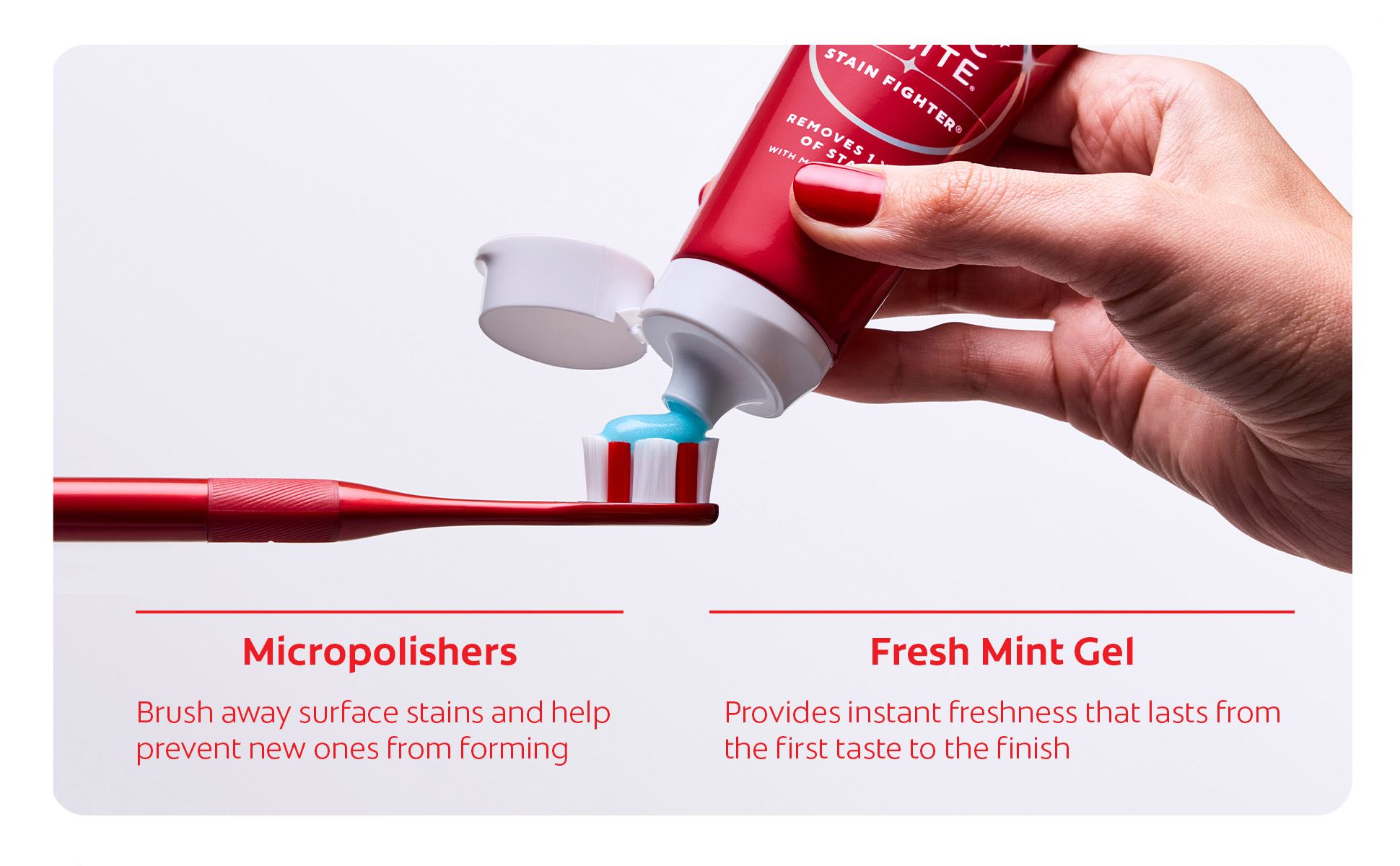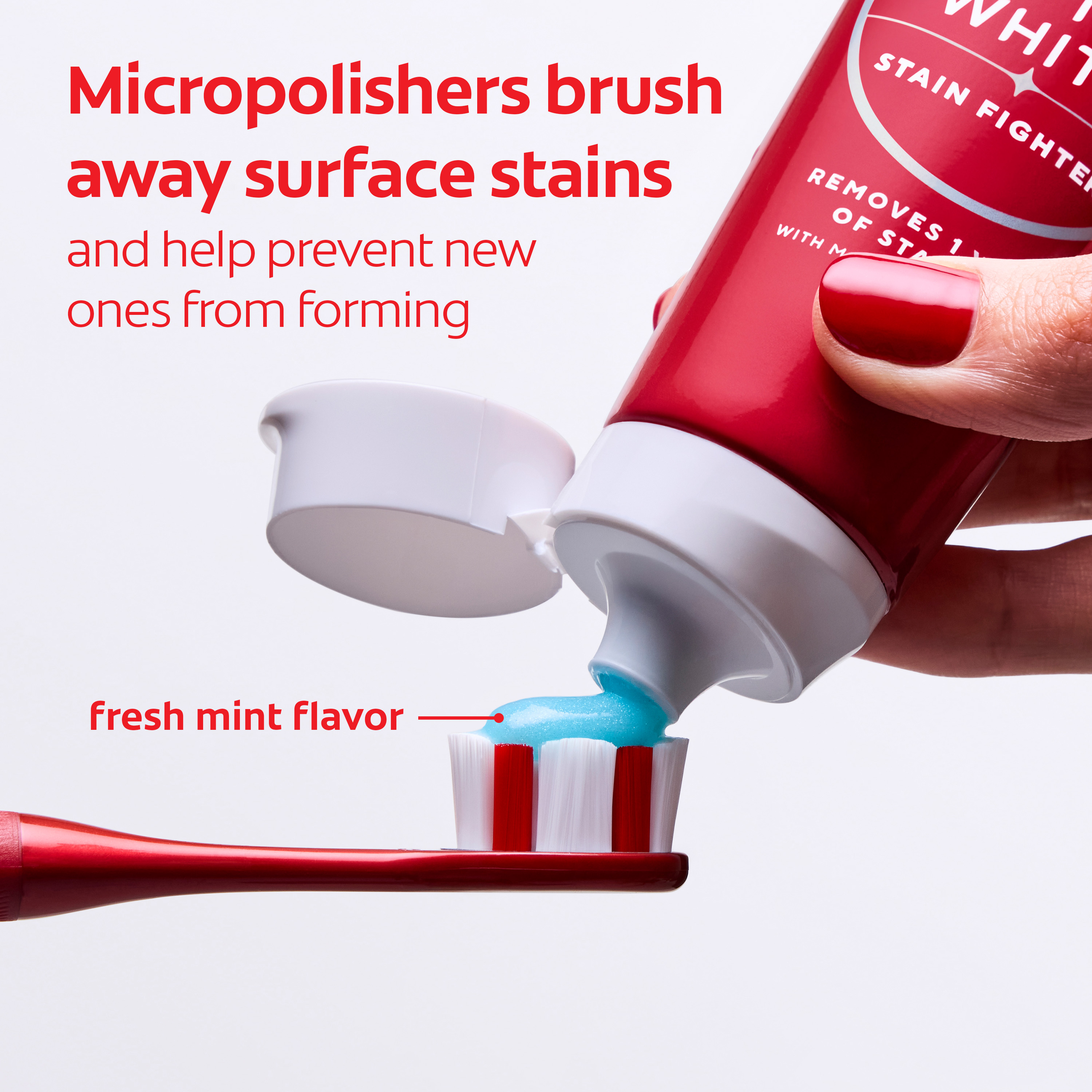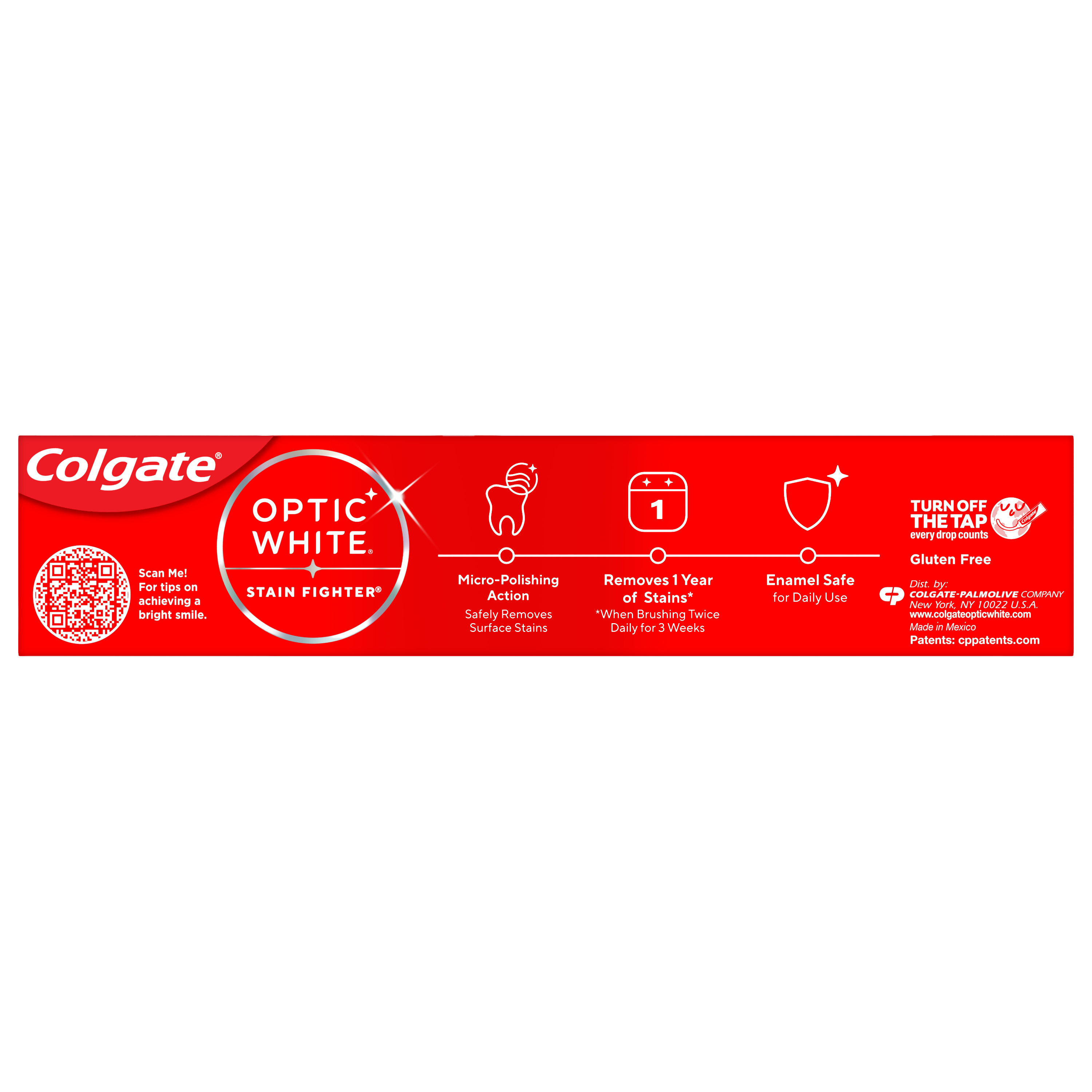 SKU MX06993A Consumer Unit - GTIN 00035000972705 Case - GTIN 10035000972702 Product Category Oral Care Product Sub Category Toothpaste Product Equity (Brand) Colgate Product Sub Brand Colgate Optic White TP Product Title Colgate Optic White Stain Fighter Fresh Mint Teeth Whitening Toothpaste Gel, Travel Size Anticavity Toothpaste Gel with Fluoride, 2.0 OZ Product Description Colgate Optic White Stain Fighter Fresh Mint Toothpaste Gel removes 1 year of stains* while freshening breath with its mint flavor. Its micro-polishing action safely removes 5X more surface stains**. Plus, Optic White Stain Fighter contains fluoride to fight cavities and is an enamel safe stain remover toothpaste. Get a refreshing clean with this effective teeth stain remover and travel size toothpaste. Colgate Optic White Stain Fighter uses a patented whitening formula for thorough, effective stain removal. The micropolishers in Stain Fighter don’t just brush away surface stains – they help prevent new ones from forming. The refreshing peppermint flavor of our toothpaste gel provides instant freshness that lasts from the first taste to the finish. Stain Fighter is a fluoride toothpaste gel that fights cavities. This patented whitening formula removes 1 year of stains* and is enamel safe for daily use. *when brushing twice daily for 3 weeks **vs. ordinary, non-whitening toothpaste after 2 weeks of continued use eCommerce Copy- Long Description Colgate Optic White Stain Fighter Toothpaste, Fresh Mint Gel, 2.0 Oz. Remove every day surface stains to reveal a brighter smile with Colgate Optic White Stain Fighter Stain Removal Toothpaste. This whitening toothpaste for adults removes 95% of daily surface stains for a brighter smile.* Get ready to reveal a beautiful smile that’s ready to shine with Colgate Optic White Stain Fighter Stain Removal Toothpaste. Patented Teeth Whitening Formula with Minty Freshness Colgate Optic White Stain Fighter Stain Removal Toothpaste uses a patented whitening formula to remove 95% of daily surface stains*. Using special micro-polishing action, this anticavity toothpaste removes 5x more surface stains** on teeth. Plus, this fluoride toothpaste comes in a refreshing Fresh Mint Gel flavor so that you can enjoy minty freshness each and every time you brush. Enamel Safe Whitening That Works Colgate Optic White Stain Fighter Stain Removal Toothpaste is a sugar free and vegan toothpaste that is enamel safe for daily use. For whitening that works, choose Colgate Optic White Stain Fighter Stain Removal Toothpaste. *after 2 weeks of twice daily use **vs. ordinary, non whitening toothpaste after 2 weeks of continued use Bullet 1 One 2.0 OZ tube of Colgate Optic White Stain Fighter Fresh Mint Teeth Whitening Toothpaste Gel, Travel Size Toothpaste Bullet 2 Removes 1 year of stains* (*when brushing twice daily for 3 weeks) Bullet 3 Safely removes 5X more surface stains with micro-polishing action** (**vs. ordinary, non-whitening toothpaste after 2 weeks of continued use) Bullet 4 Clean Mint flavor provides an invigorating clean that lasts from the first taste to the finish Bullet 5 This travel toothpaste gel is enamel safe for daily use Bullet 6 Optic White Stain Fighter is an anticavity toothpaste; it contains fluoride to fight cavities Bullet 7 Optic White Stain Fighter is a vegan toothpaste Active Ingredients Sodium Fluoride 0.24 % (0.15% w/v fluoride ion) Dollar Tree RPC 314959