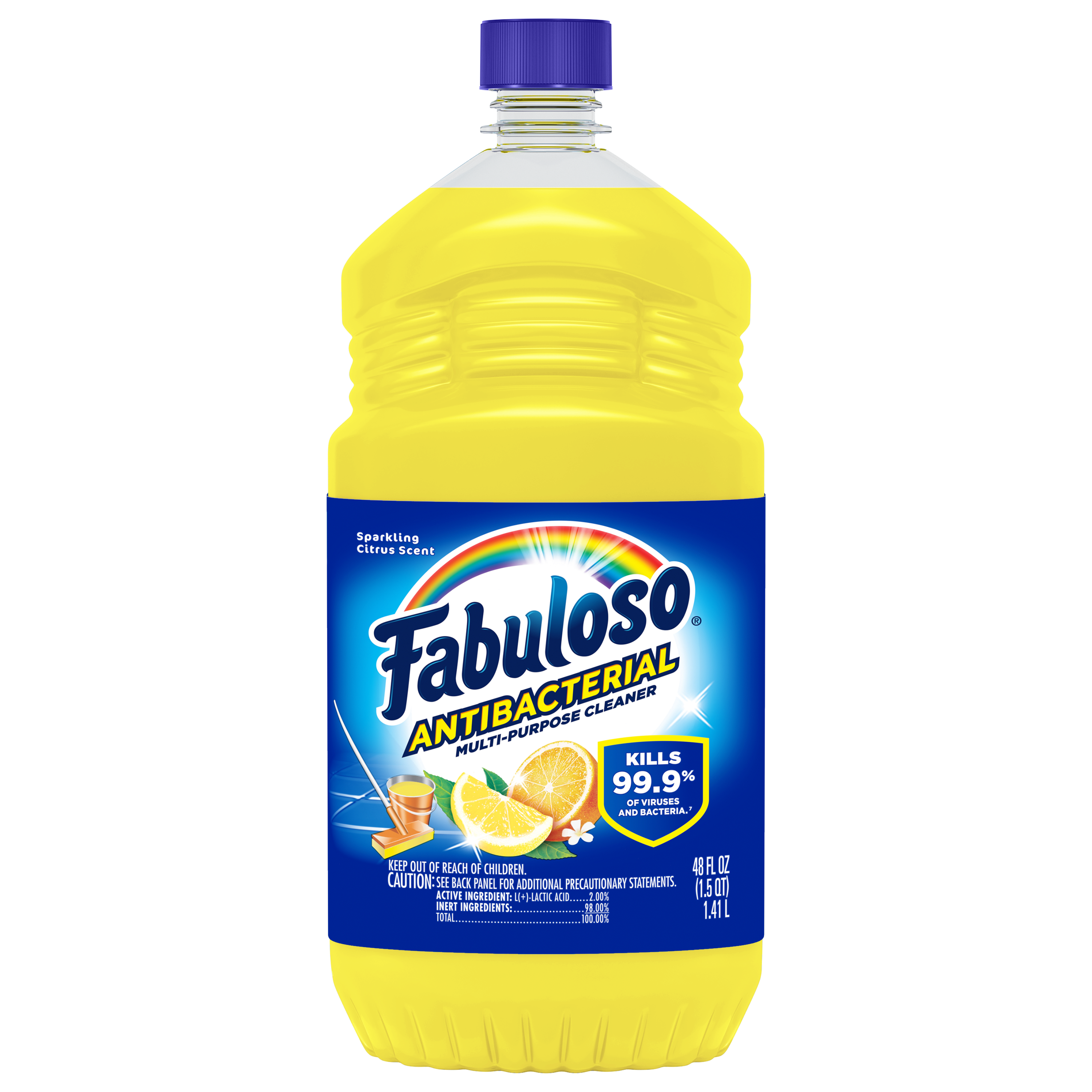 Bullet 1 One 48 oz Bottle of Fabuloso Antibacterial Multi-Purpose Cleaner, Sparkling Citrus Scent Bullet 2 Kills 99.9% of viruses and bacteria (7) and leaves surfaces clean and disinfected Bullet 3 This multi-action formula cuts through grease, removes limescale, cleans counters, and has an irresistible fragrance Bullet 4 Fills your space with the citrus scent Bullet 5 This all in one cleaner can be used on floors, walls, bathrooms, living rooms, and almost every hard surface Bullet 6 For visibly soiled surfaces, preclean surfaces before sanitizing or disinfecting Bullet 7 See the back of bottle for directions for use Active Ingredients Active Ingredients: L-Lactic Acid (2.00%). Walmart RPC 817133754 Walmart URL (Computed) https://www.walmart.com/ip/a/817133754 Family Dollar RPC 1499051