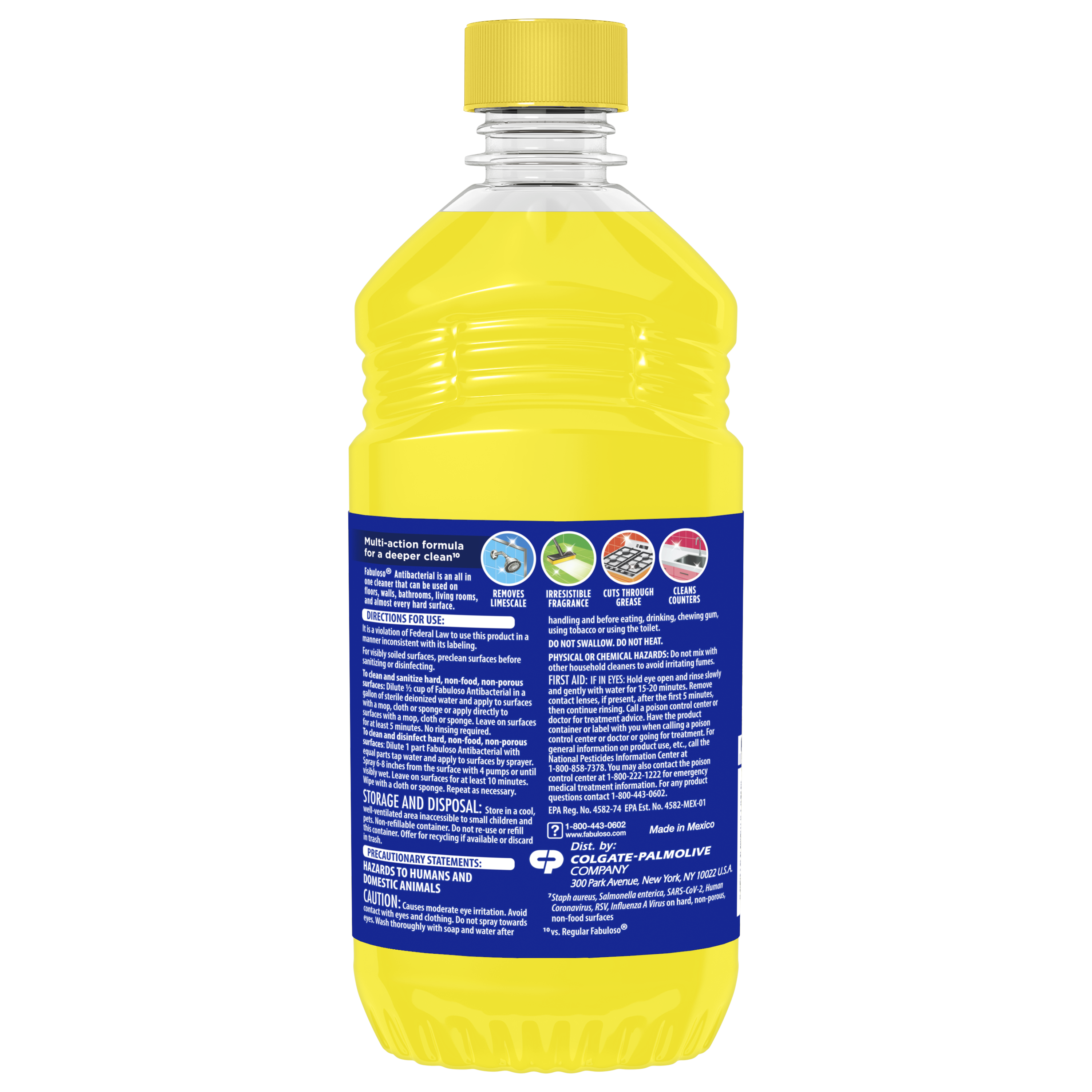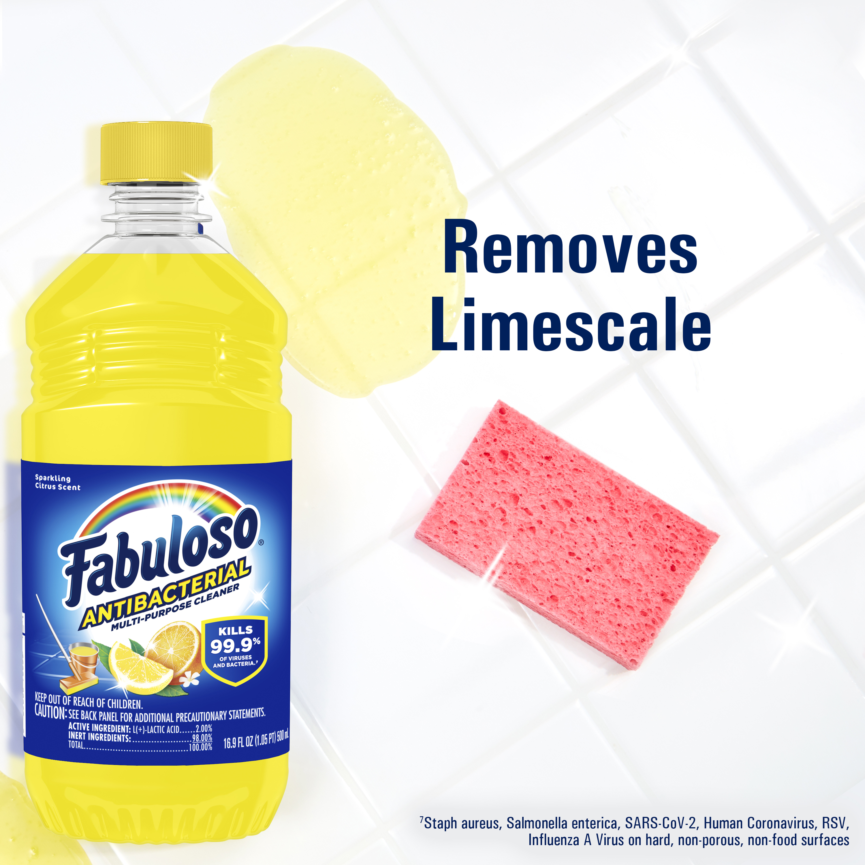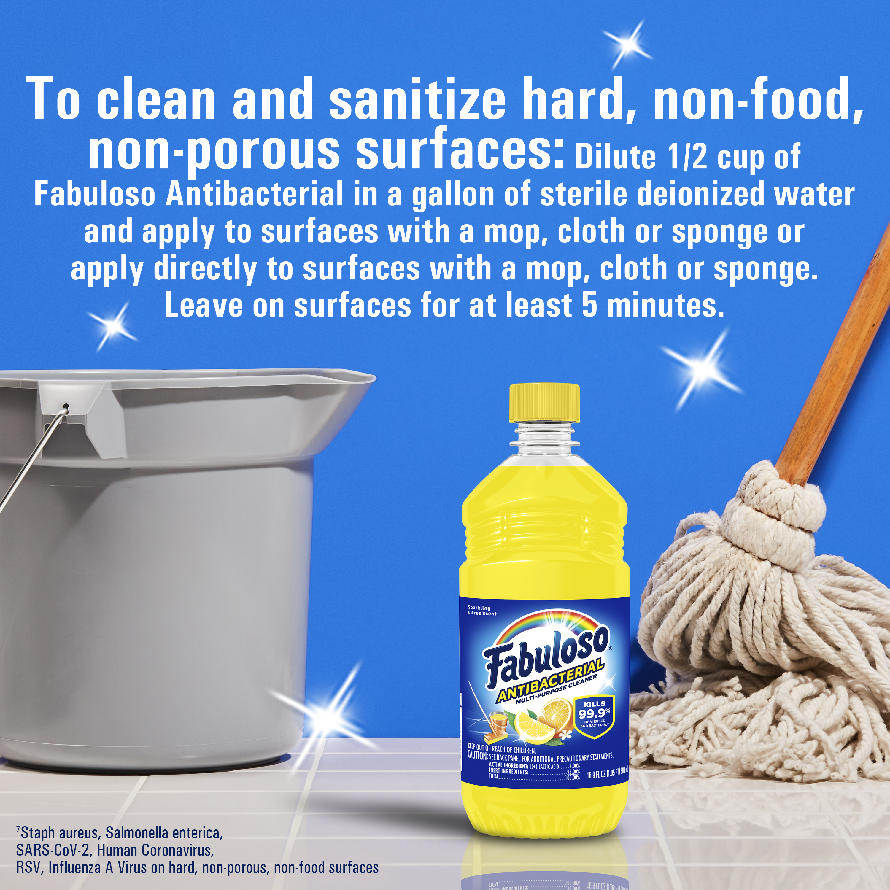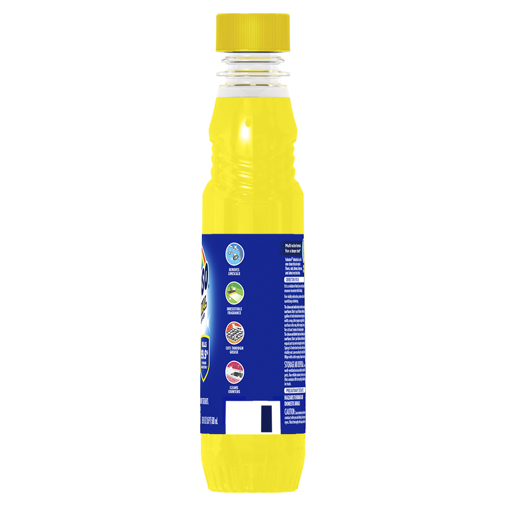 SKU MX07179A Consumer Unit - GTIN 00035000986351 Case - GTIN 10035000986358 Product Category Home Care Product Sub Category Cleaners Liquid / Gel Product Equity (Brand) Fabuloso Product Sub Brand Fabuloso Antibacterial BDC Cln Product Title Fabuloso Antibacterial Multi-Purpose Cleaner, Sparkling Citrus Scent, 16.9 oz Product Description Fabuloso Antibacterial multi-purpose cleaner cuts through grease and removes limescale. It also kills 99.9% of viruses and bacteria (7). Fabuloso Antibacterial is an all in one cleaner that can be used on floors, walls, bathrooms, living rooms, and almost every hard surface. For visibly soiled surfaces, preclean surfaces before sanitizing or disinfecting. To clean and sanitize hard, non-food, non-porous surfaces: Dilute 1/2 cup of Fabuloso Antibacterial in a gallon of sterile deionized water and apply to surfaces with a mop, cloth or sponge or apply directly to surfaces with a mop, cloth or sponge. Leave on surfaces for at least 5 minutes. No rinsing required. To clean and disinfect hard, non-food, non-porous surfaces: Dilute 1 part Fabuloso Antibacterial with equal parts tap water and apply to surfaces by sprayer. Spray 6-8 inches from the surface with 4 pumps or until visibly wet. Leave on surfaces for at least 10 minutes. Wipe with a cloth or sponge. Repeat as necessary. And let's not forget the unmistakable fragrance that fills your space with the citrus scent. Experience the power of cleanliness with every wipe! (7) Staph aureus, Salmonella enterica, SARS-CoV-2, Human Coronavirus, RSV, and Influenza A Virus on hard, non-porous, non-food surfaces eCommerce Copy- Long Description Fabuloso® Antibacterial Sparkling Citrus