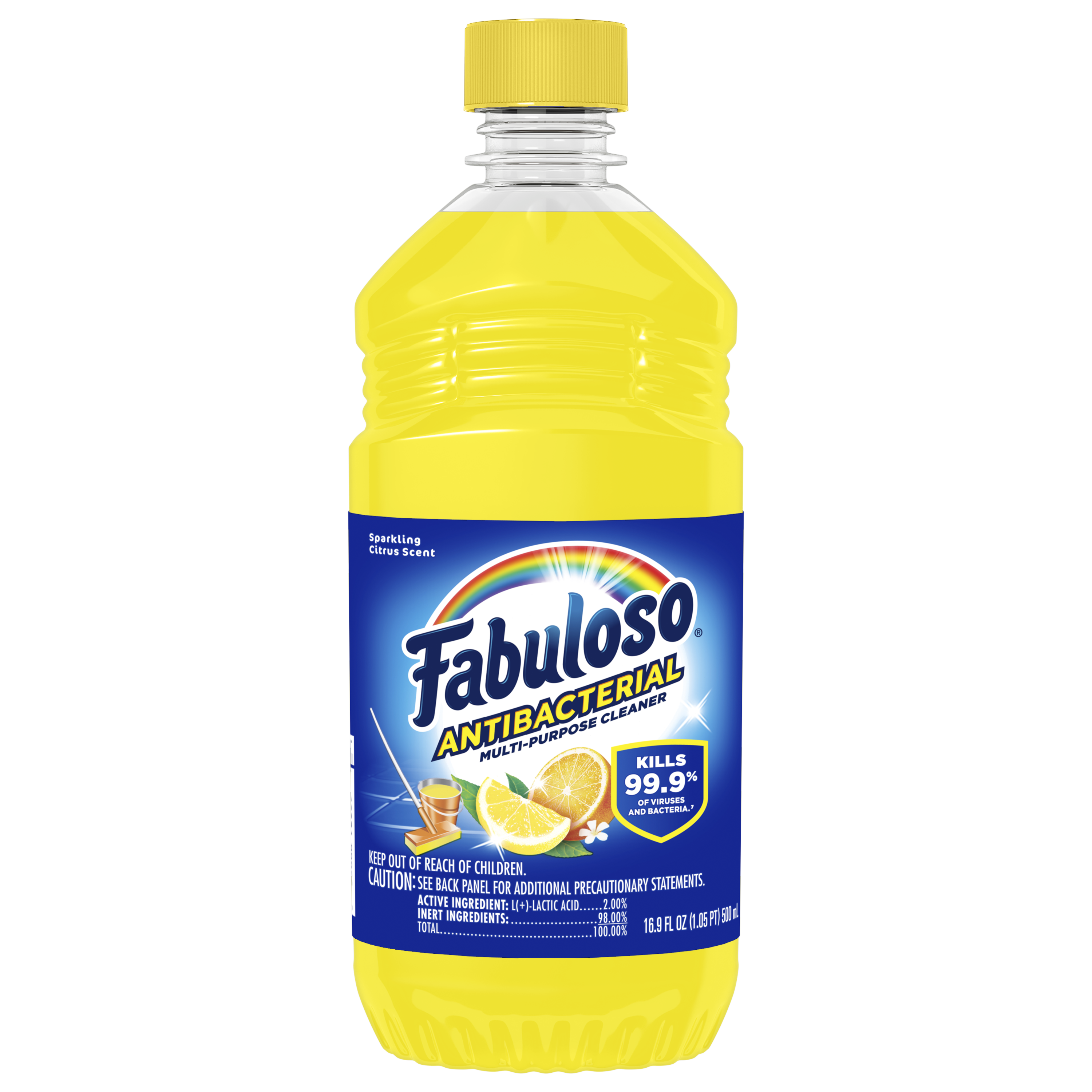 Bullet 1 One 16.9 oz Bottle of Fabuloso Antibacterial Multi-Purpose Cleaner, Sparkling Citrus Scent Bullet 2 Kills 99.9% of viruses and bacteria (7) and leaves surfaces clean and disinfected Bullet 3 This multi-action formula cuts through grease, removes limescale, cleans counters, and has an irresistible fragrance Bullet 4 Fills your space with the citrus scent Bullet 5 This all in one cleaner can be used on floors, walls, bathrooms, living rooms, and almost every hard surface Bullet 6 For visibly soiled surfaces, preclean surfaces before sanitizing or disinfecting Bullet 7 See the back of bottle for directions for use Active Ingredients Active Ingredients: L-Lactic Acid (2.00%). Amazon RPC B0923CMJ88 AMZ URL https://www.amazon.com/dp/B0923CMJ88