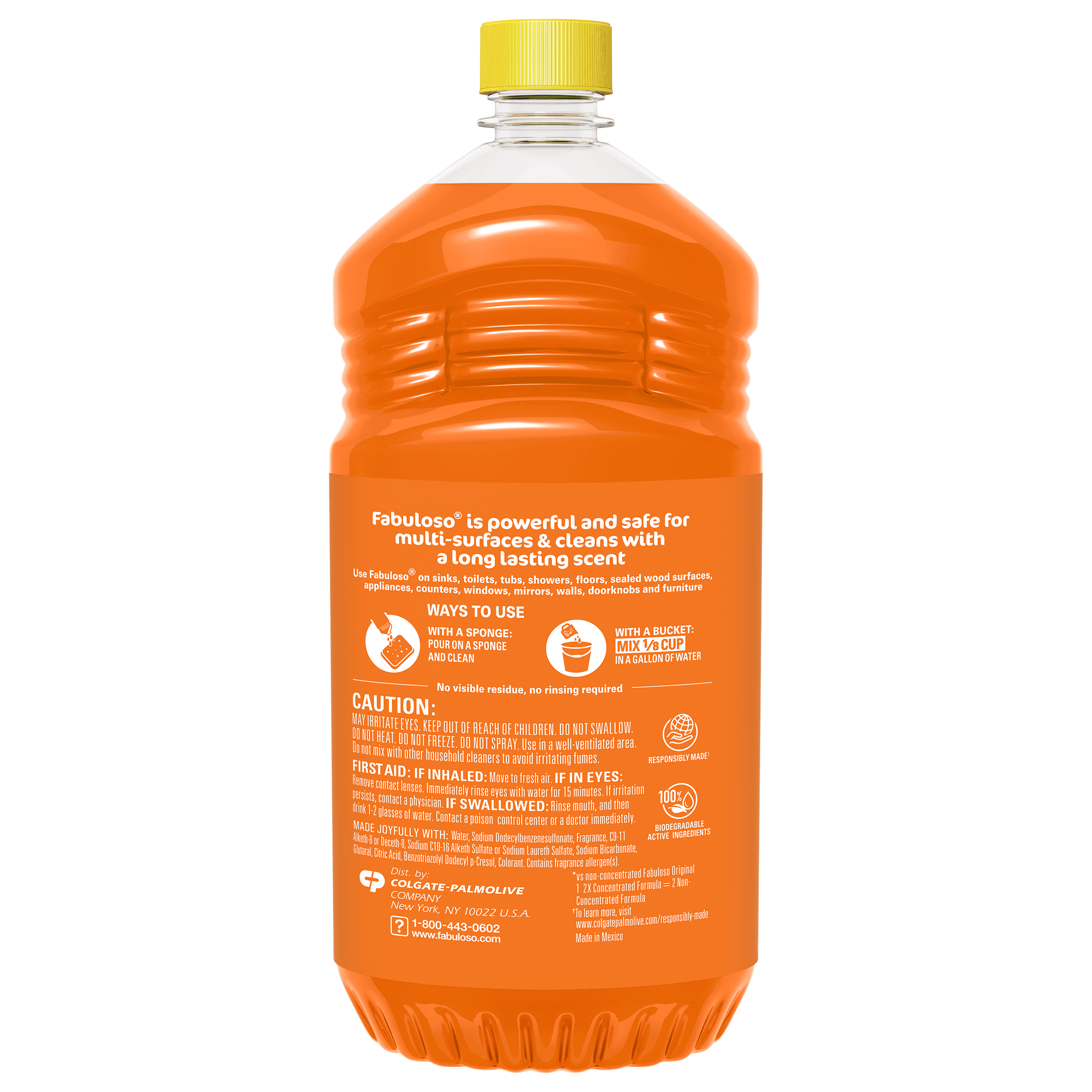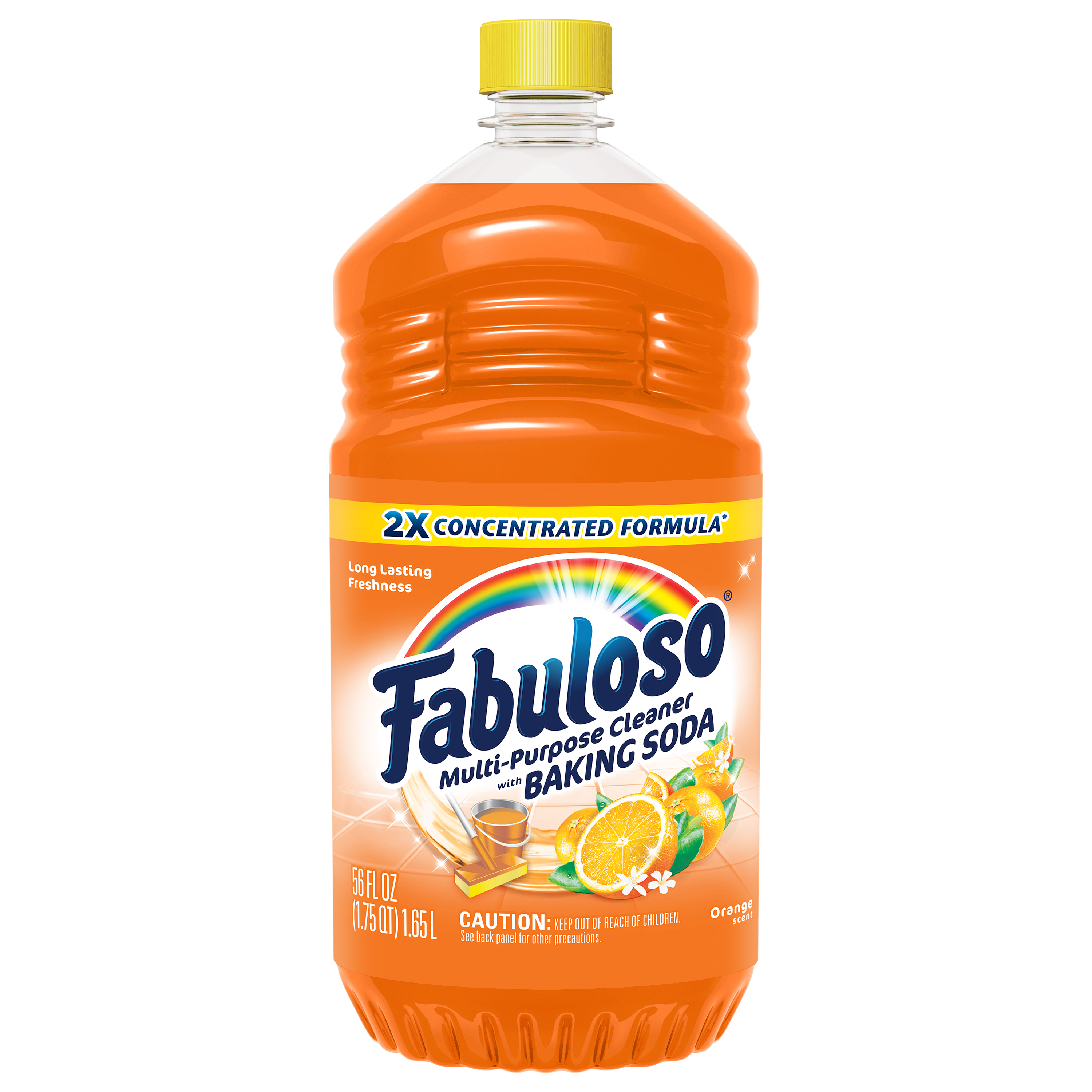 SKU MX07212A Consumer Unit - GTIN 00035000987600 Case - GTIN 10035000987607 Product Category Home Care Product Sub Category Cleaners Liquid / Gel Product Equity (Brand) Fabuloso Product Sub Brand Fabuloso Liq Cln Product Title Fabuloso Multi-Purpose Cleaner, 2X Concentrated Formula, Orange with Baking Soda, 56 oz Product Description Fabuloso 2X Multi-Purpose Cleaner is the perfect solution for anyone looking for an effective way to keep their home clean and smelling great. Whether used as a bathroom cleaner, kitchen cleaner, or floor cleaner, the long-lasting orange scent will fill your home with joy. Our multi-purpose cleaner cuts through grease, grime, and dirt. Its easy-pour bottle delivers a colorful and satisfying pour every time. We understand that life isn't always easy, but cleaning it up can be with Fabuloso multi-purpose surface cleaner. Our 2X concentrated formula provides 2x more uses and 2x more active ingredients vs our non-concentrated Fabuloso Original. It also uses 50% less plastic by following dosing instructions and getting twice as many uses out of one bottle vs. the same size of Fabuloso Original. It's important to use Fabuloso cleaning products safely, please follow the instructions on the label. Mix 1/8 cup in a gallon of water or pour on a sponge and clean. eCommerce Copy- Long Description Fabuloso® Multi-Purpose Cleaner, 2X Concentrated Formula, Orange Scent with Baking Soda Fabuloso® Multi-Purpose Cleaner, 2X Concentrated Formula in Orange Scent with Bakiang Soda transforms your home with a fresh scent that lasts. Bring the fragrance of orange with baking soda indoors, and experience a warm, joyful feeling your friends and family will love. Fabuloso®’s 2X Concentrated Formula now provides 2X more active ingredients compared to non-concentrated Fabuloso Original, giving you 2X the dosage in the same bottle. Every colorful pour from the easy-pour bottle delivers a long-lasting, unmistakable freshness and leaves your home bright and clean. Use Fabuloso® Multi-Purpose Cleaner, on sinks, toilets, tubs, showers, kitchen and bathroom floors, sealed wood surfaces, appliances, counters, windows, mirrors, walls, doorknobs and furniture, and fill every room in your home with joy. Uplifting fragrances. Clean surfaces. Irresistible joy. Life isn’t always easy, but cleaning it up sure can be. Fabuloso® combines cleaning power with fresh scents that fill your home with joy, to make it a welcoming place no matter how hard your day. Fabuloso®’s 2X Concentrated Formula provides 2X more uses in the same bottle compared to non-concentrated Fabuloso Original. From the kitchen to the bathroom and beyond, Fabuloso® Multi-Purpose, Cleaner 2X Concentrated has a wide variety of long-lasting fragrances that deliver hope for a better tomorrow. Try all of our uplifting scents: Lavender, Refreshing Lemon, Bleach Alternative† Spring Fresh, Tropical Spring, Passion of Fruits, and Citrus and Fruits with Baking Soda. † Bleach-free option with 20% more active ingredients vs other Fabuloso 2X Concentrated products Shared Moments of Joy All Over the World Our story begins in Venezuela, circa 1980. Cleaning products lacked fragrance and distinction. But families wanted lasting scents that kept their homes fresh and clean for hours. Enter the bold colors and joyful fragrances of Fabuloso® ! 16 years later, families across America also got to experience the joy: we became a household staple thanks to our rainbow of colors and playful, distinctive scents. Today, across the world, we’re more than cleaning products. We’re a catalyst for joy. Bullet 1 2X concentrated formula provides 2X more active ingredients compared to non-concentrated Fabuloso Original Bullet 2 Multi-purpose cleaner for a wide range of surfaces, from floors to furniture to appliances Bullet 3 Mix 1/8 cup in a gallon of water or pour on a sponge and clean Bullet 4 Orange scent provides long-lasting freshness Bullet 5 Uses 50% less plastic by following dosing instructions to get twice as many uses out of one bottle v. the same size of Fabuloso Original