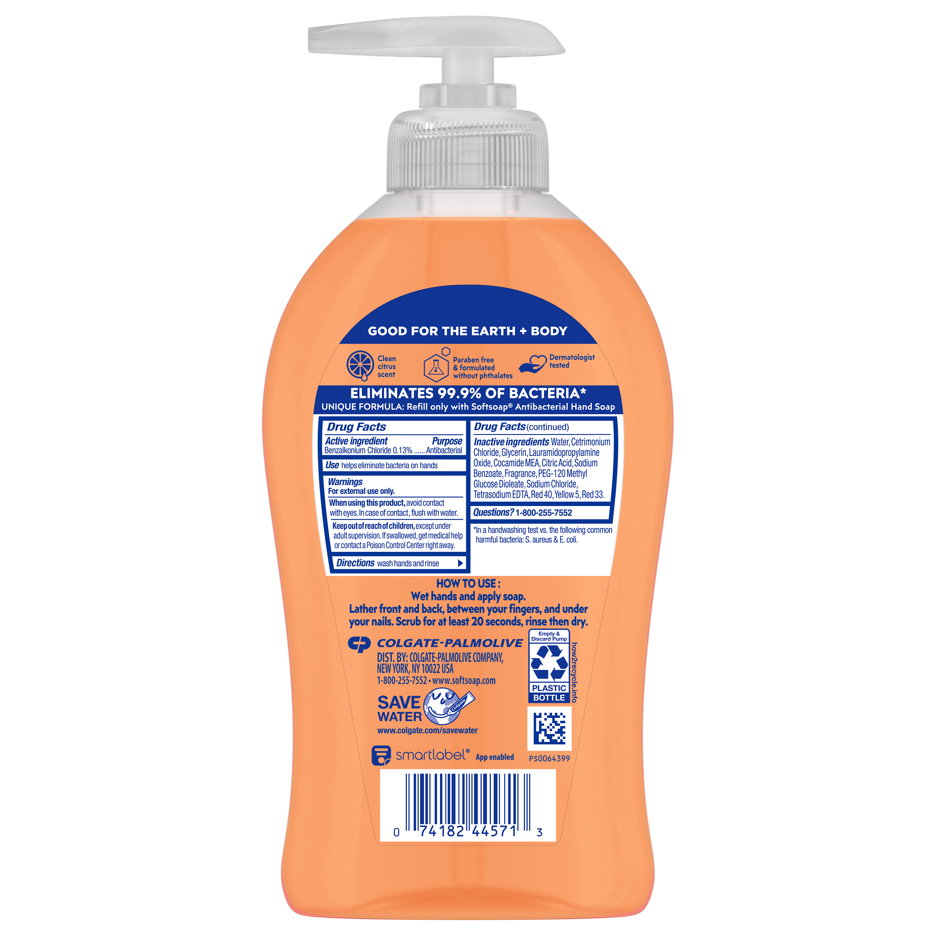 SKU US03562A Consumer Unit - GTIN 00074182445713 Case - GTIN 10074182445710 Product Category Personal Care Product Sub Category Liquid Hand Wash Product Equity (Brand) Softsoap Product Sub Brand Softsoap Antibacterial LHW Product Title Softsoap Antibacterial Liquid Hand Soap, Crisp Clean Scent Hand Soap, 11.25 oz Bottle Product Description From the #1 liquid hand soap brand (1), comes Softsoap Antibacterial Crisp Clean Liquid Hand Soap which eliminates 99.9% of bacteria (2). With a crisp clean scent, this antibacterial hand soap effectively cleans hands while infusing small moments with joy. Our liquid hand soap is enriched with moisturizers and helps protect skin’s natural barrier by retaining skin’s natural moisture. This special formula leaves skin feeling soft. This fresh kitchen hand soap is paraben free, formulated without phthalates, and dermatologist tested. Feel the joy of clean with Softsoap hand soap! (1) Based in part on data reported by Nielsen through its Market Track Service for the Liquid Hand Soap Category for the 52 week period ending 1/1/22, for the All Outlet market. Copyright © 2022 Nielsen. (2) in a handwashing test vs. the following common harmful bacteria: S. aureus & E. coli. eCommerce Copy- Long Description From the #1 liquid hand soap brand†, comes Softsoap Antibacterial Crisp Clean Scented Liquid Hand Soap which eliminates 99.9% of bacteria*. With a clean citrus scent, this antibacterial hand soap effectively cleans hands while infusing small moments with joy. Softsoap Antibacterial Crisp Clean liquid hand soap is enriched with moisturizers and helps protect skin’s natural barrier by retaining skin’s natural moisture. Feel the joy of clean with Softsoap hand soap! †Based in part on data reported by Nielsen through its Market Track Service for the Liquid Hand Soap Category for the 52 week period ending 1/1/22, for the All Outlet market. Copyright © 2022 Nielsen. *in a handwashing test vs. the following common harmful bacteria: S. aureus & E. coli Great Clean. For Everyone. Confidently wash your hands with Softsoap while enjoying fragrant scents and fun labels that will bring you joy. For everyone, every mood, and every sink, Softsoap hand soap is designed to make you feel joyfully clean. Use Crisp Clean scented Antibacterial liquid hand soap in the bathroom or the kitchen to uplift every small moment while keeping your hands clean. Feel Good About Washing Your Hands This liquid hand soap washes away bacteria and is an effective way to keep hands clean. Plus, this liquid soap is dermatologist tested, paraben free and formulated without phthalates, and retains skin’s natural moisture, so you can feel good about washing your hands. Feel the Joy of Clean We believe that the little moments throughout your day should be fun! With delightful bubbles and fragrant scents, every trip to the sink and every shower leaves you feeling uplifted. Enjoy those small moments of joy, get brilliantly clean with our liquid hand soaps and body washes—now, you’re ready to take on the world! Bullet 1 One 11.25 oz Bottle of Softsoap Crisp Clean Antibacterial Liquid Hand Soap Bullet 2 Our trusted formula is designed to eliminate 99.9% of bacteria (2), ensuring your hands are clean Bullet 3 With a crisp clean scent, this antibacterial hand soap effectively cleans hands while infusing small moments with joy Bullet 4 Our orange hand soap is enriched with moisturizers and helps protect skin’s natural barrier by retaining skin’s natural moisture Bullet 5 This bathroom hand soap is paraben free, formulated without phthalates, and dermatologist tested Active Ingredients Benzalkonium Chloride 0.13% Amazon RPC B01LTI987M AMZ URL https://www.amazon.com/dp/B01LTI987M Walmart RPC 180160368 Walmart URL (Computed) https://www.walmart.com/ip/a/180160368 Albertsons RPC 960281848 Albertsons URL https://www.albertsons.com/shop/product-details.960281848.html CVS RPC 208758 Family Dollar RPC 2005090