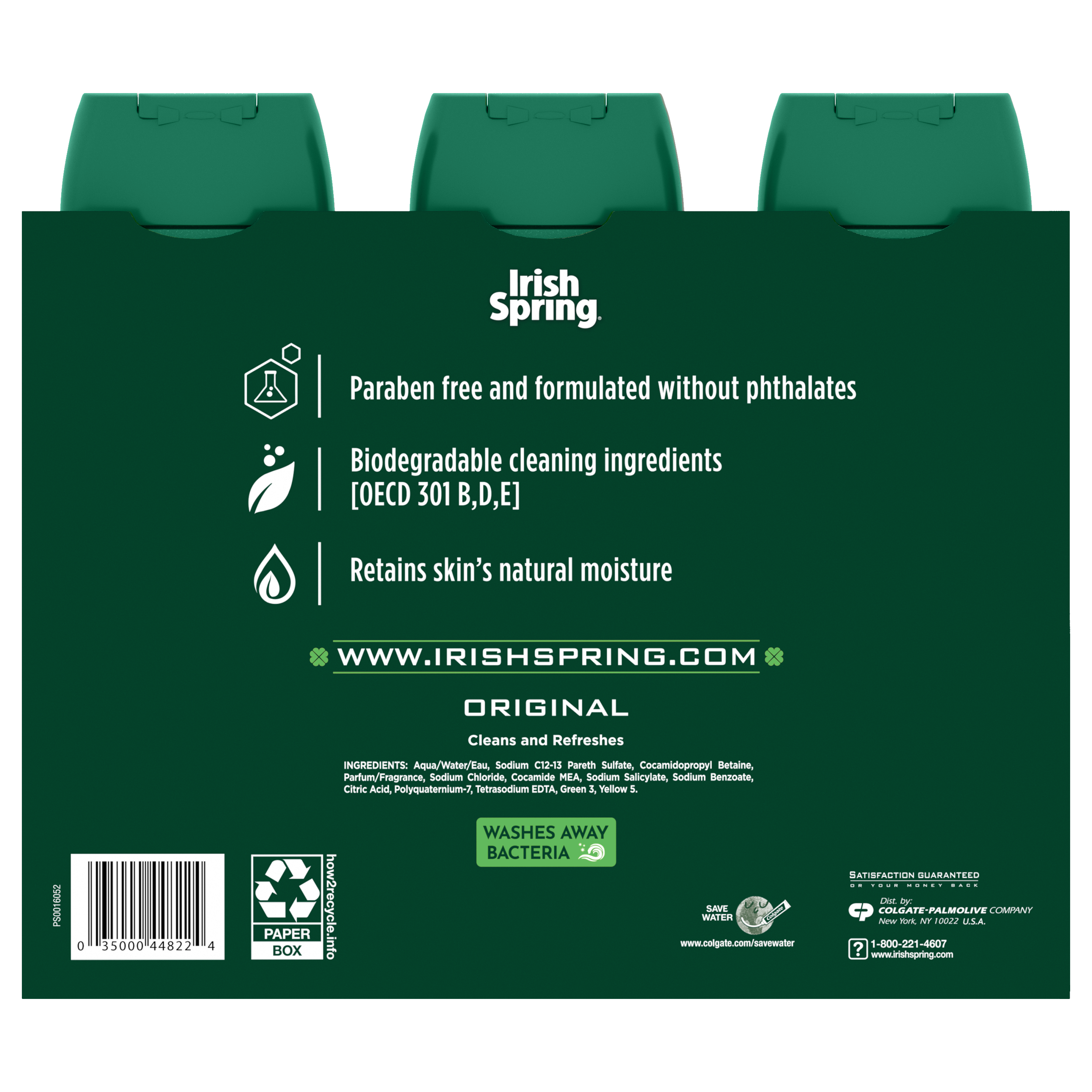 SKU US04046A Consumer Unit - GTIN 00035000999993 Product Category Personal Care Product Sub Category Body Wash Product Equity (Brand) Irish Spring Product Sub Brand Irish Spring BW Product Title Irish Spring Original Face & Body Wash, Moisturizing Body Wash Washes Away Bacteria - 18 fluid ounce, 3 pack Product Description Since 1972, the makers of Irish Spring products have been committed to keeping men feeling fresh, clean and confident. Everyone appreciates a classic. The Fresh scent and rich lathering formula leaves you feeling clean as a whistle. Shower like a true Irishman and get fresh and clean with Irish Spring Original Body Wash. Bullet 1 Fresh scent Bullet 2 Rich lathering formula leaves you feeling clean as a whistle Bullet 3 Odor Neutralization Technology Bullet 4 Keeps you fresh for 24 hours