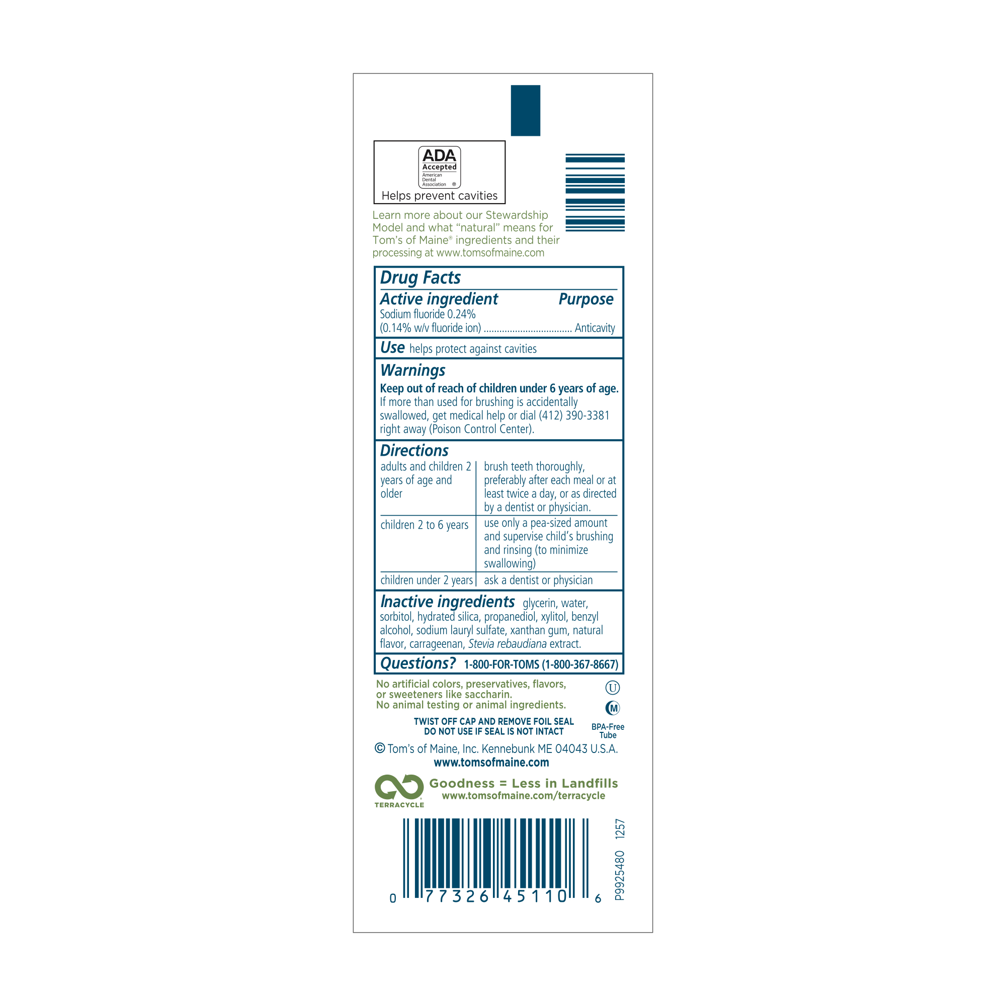 SKU US04175A Consumer Unit - GTIN 00077326451106 Case - GTIN 10077326451103 Product Category Oral Care Product Sub Category Toothpaste Product Equity (Brand) Tom's of Maine Product Sub Brand Tom's Kids TP Product Title Tom's of Maine Children's Fluoride Anticavity Gel, Kids Toothpaste, Natural Toothpaste, Fruitilicious, 4.2 Ounce, 6-Pack Active Ingredients Sodium fluoride 0.24% (0.14% w / v fluoride ion)